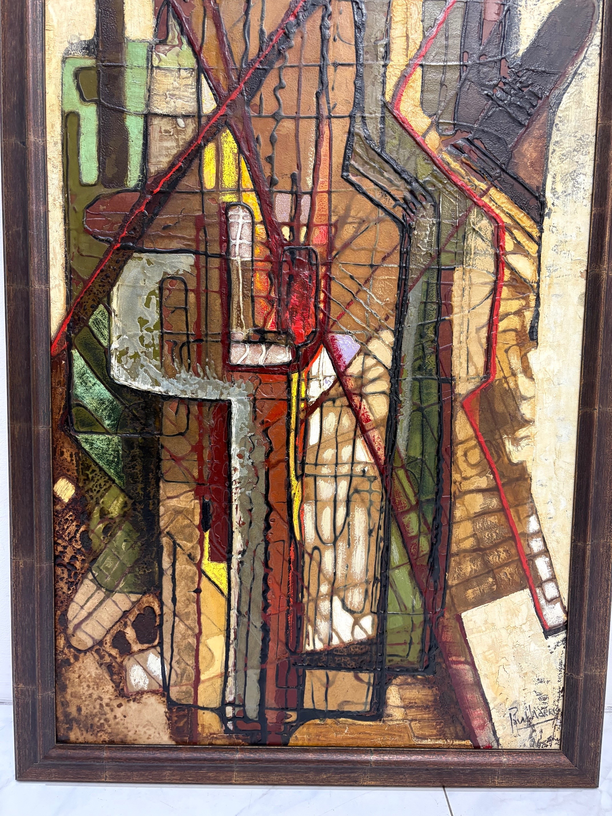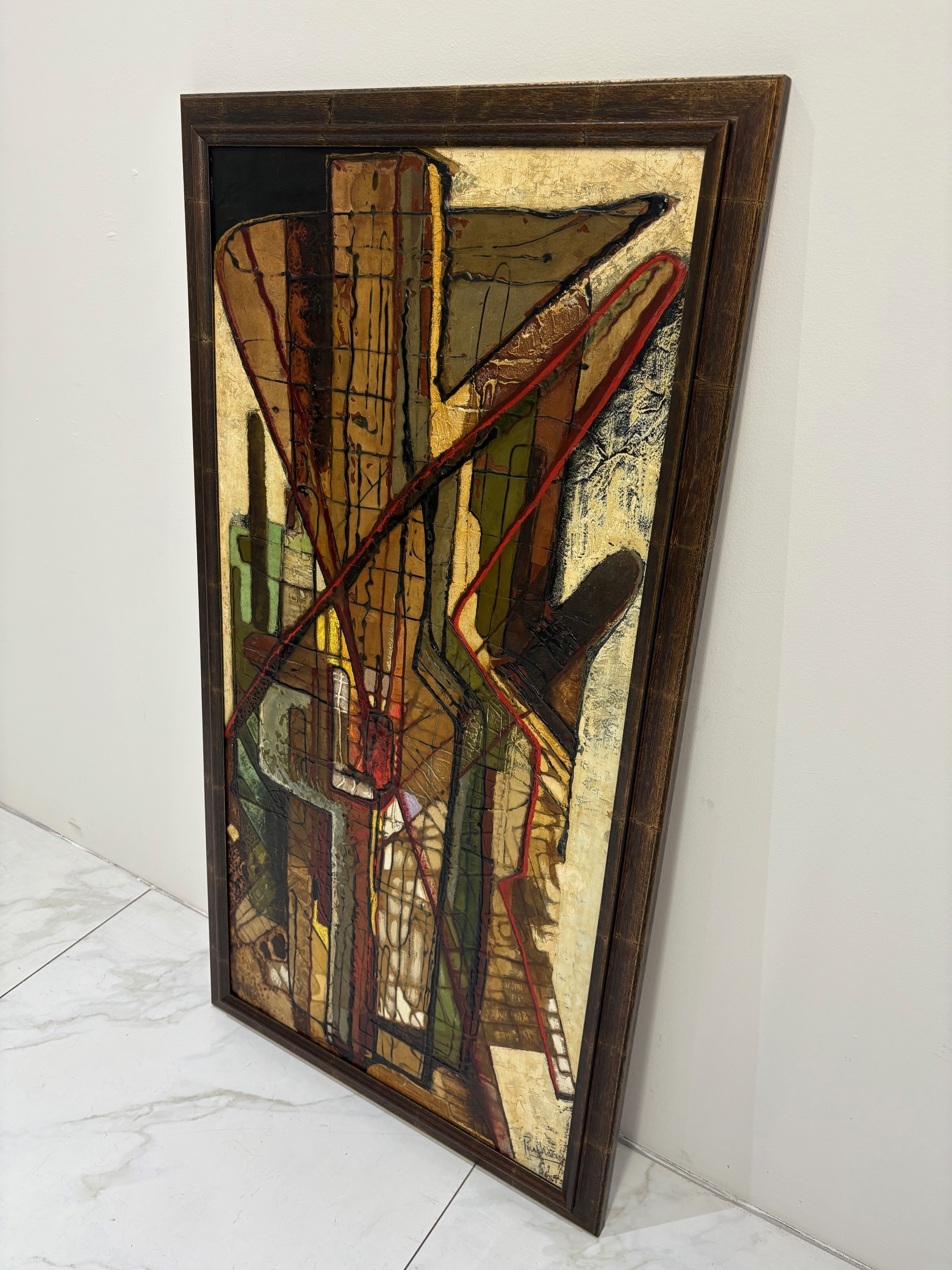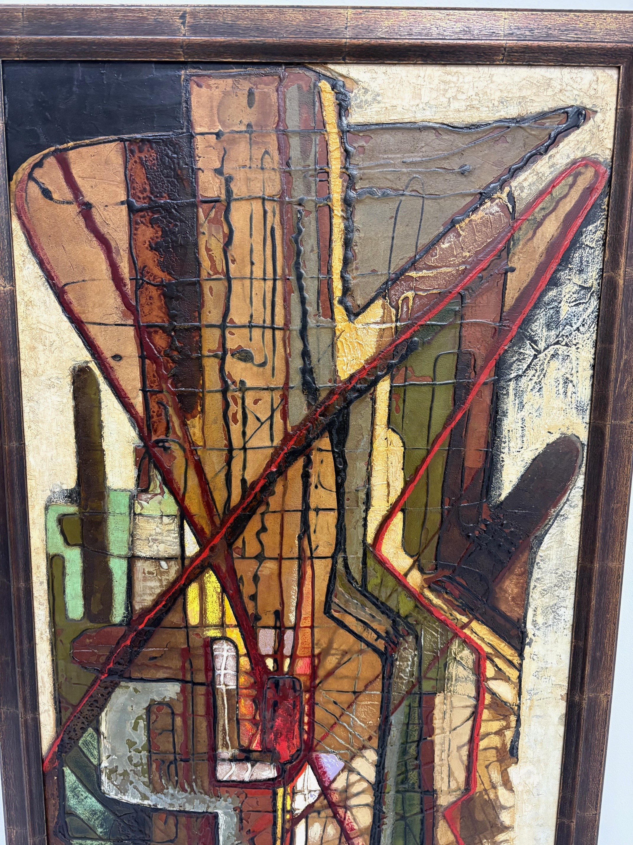 Vintage abstract painting featuring bold geometric forms, textured layers, and earthy tones with accents of red and green. Framed and ready to hang.