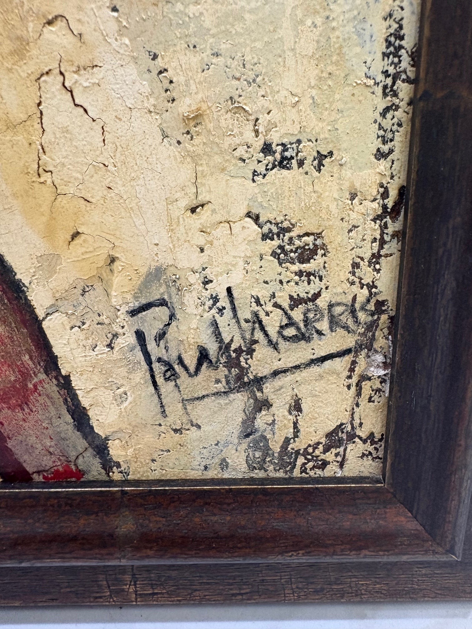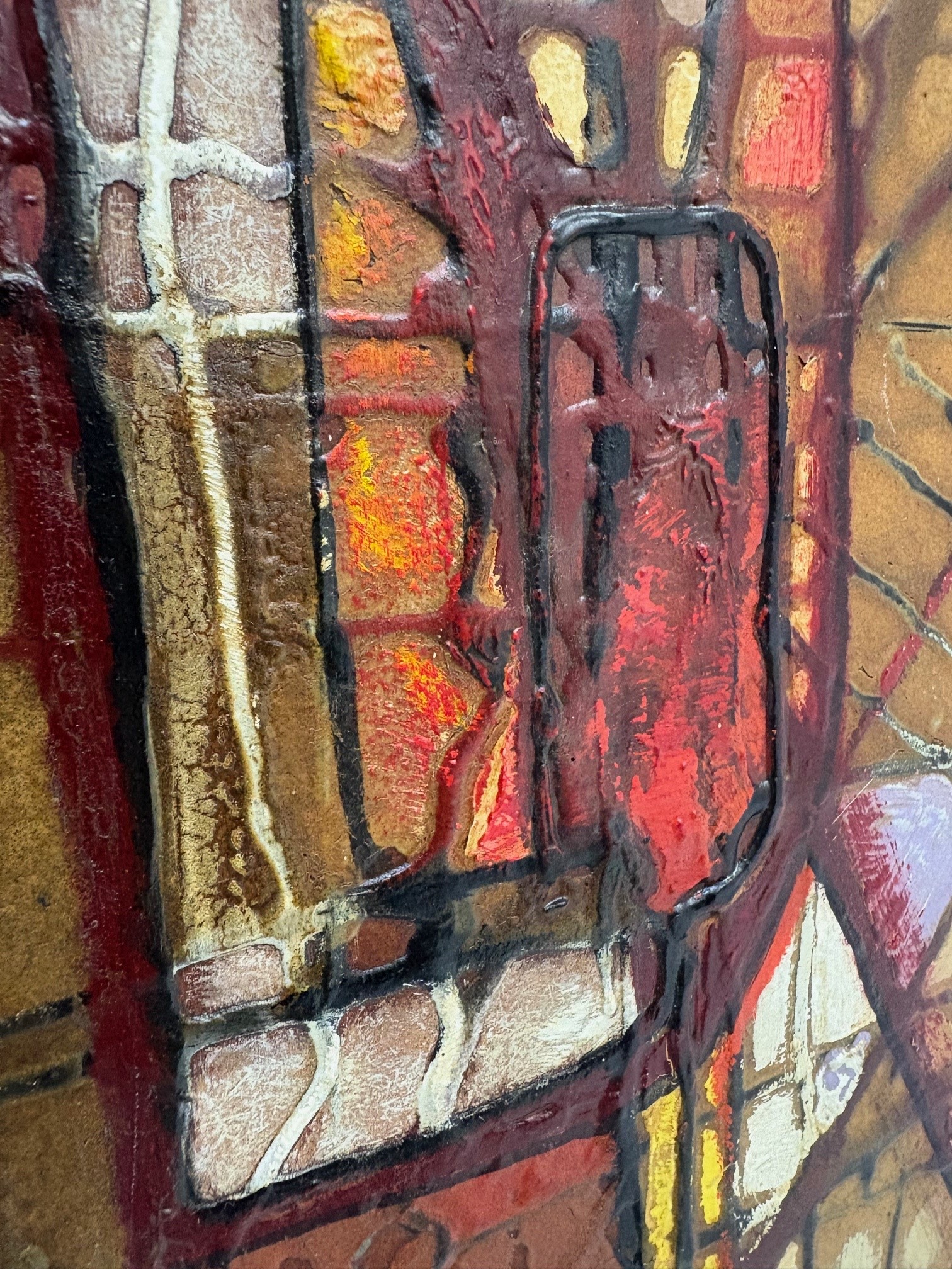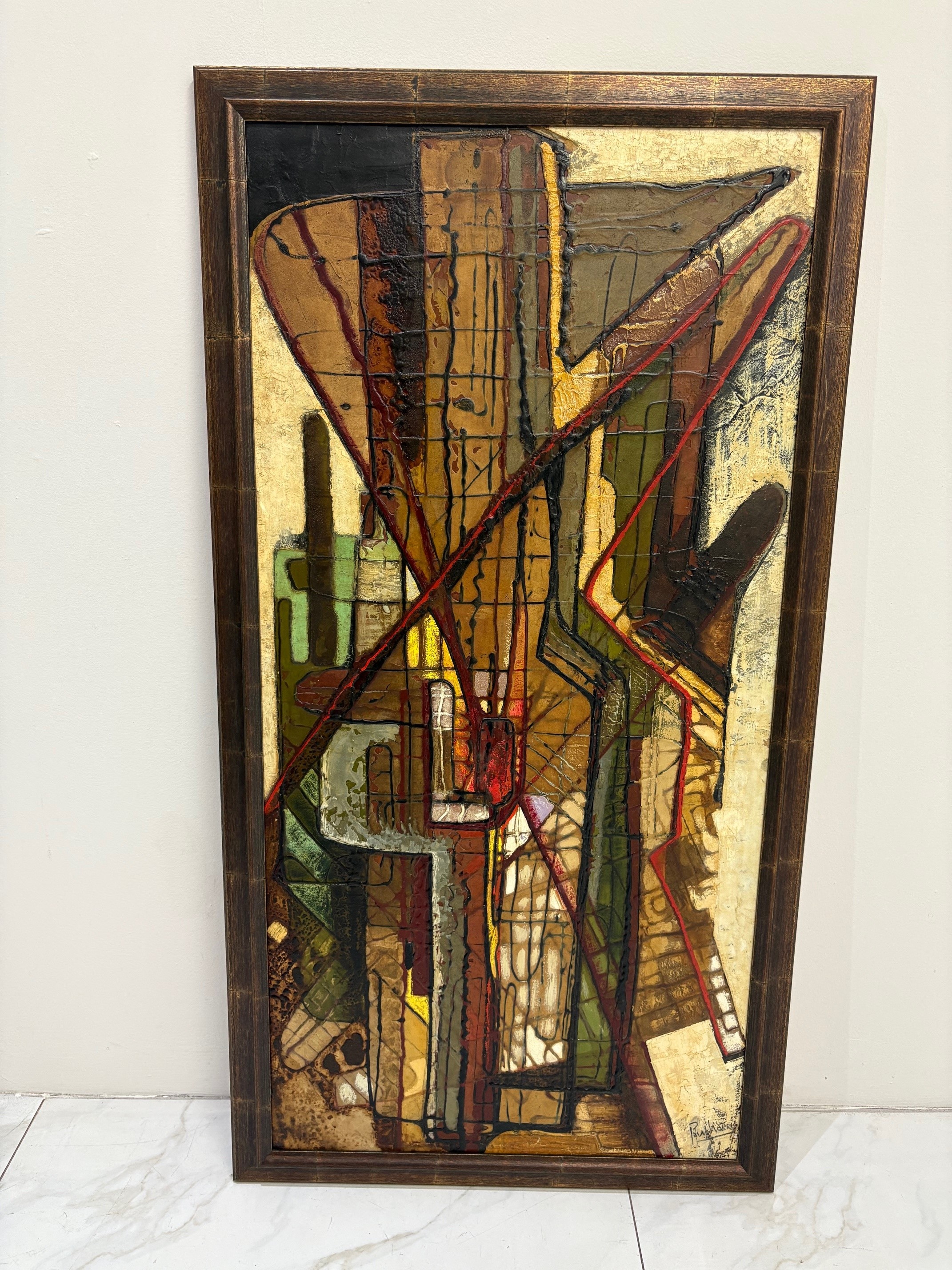 Vintage abstract painting featuring bold geometric forms, textured layers, and earthy tones with accents of red and green. Framed and ready to hang.