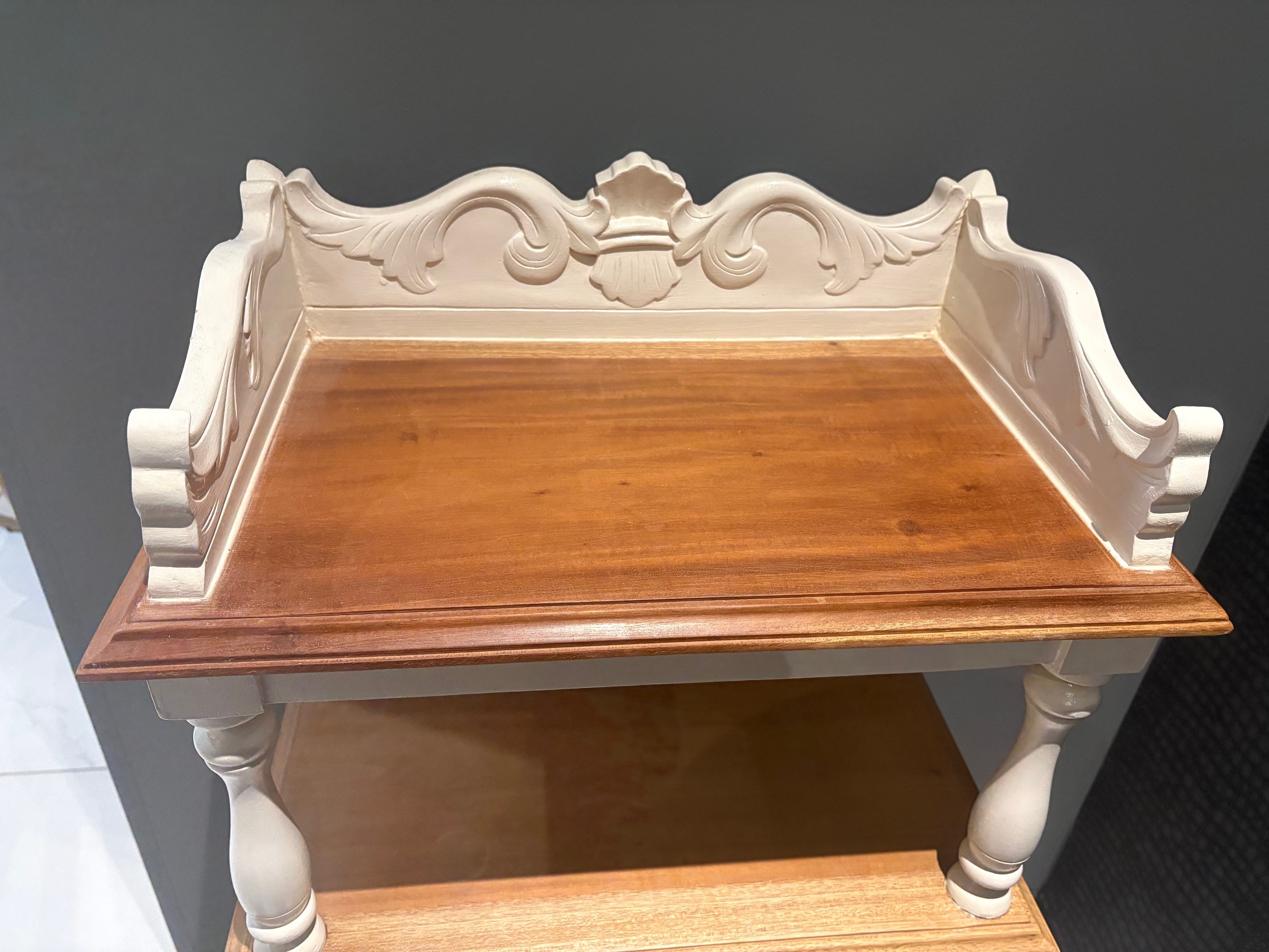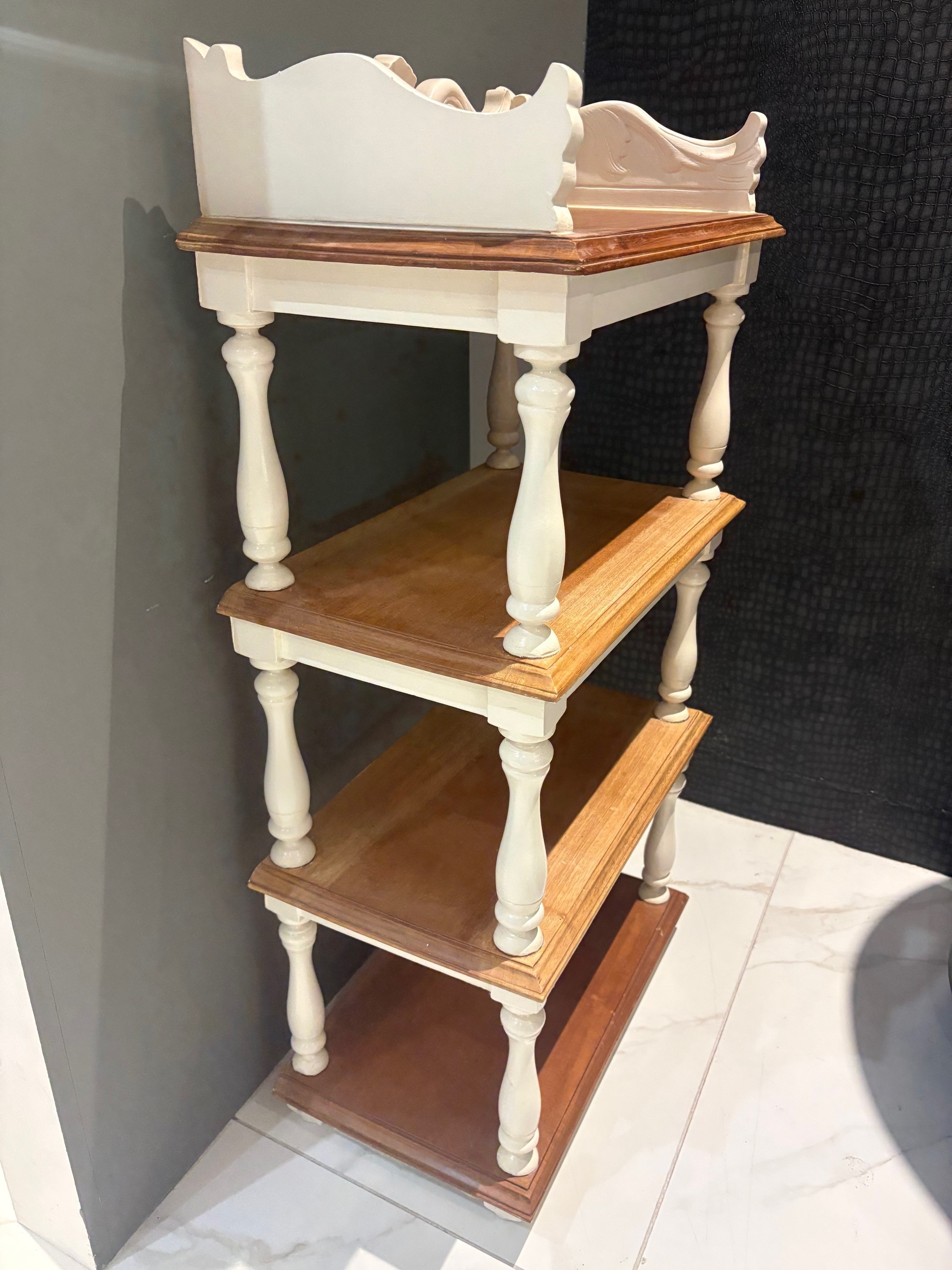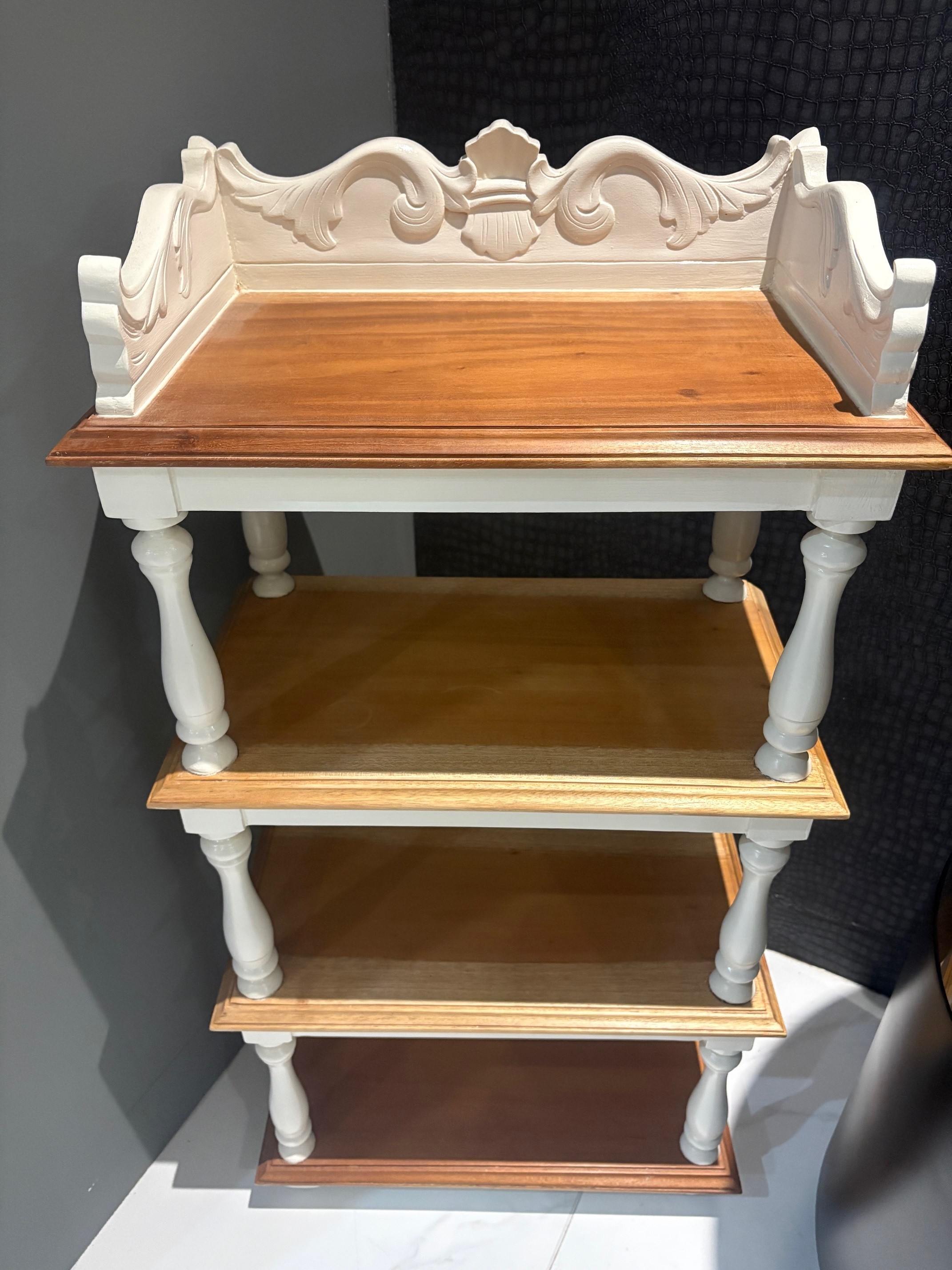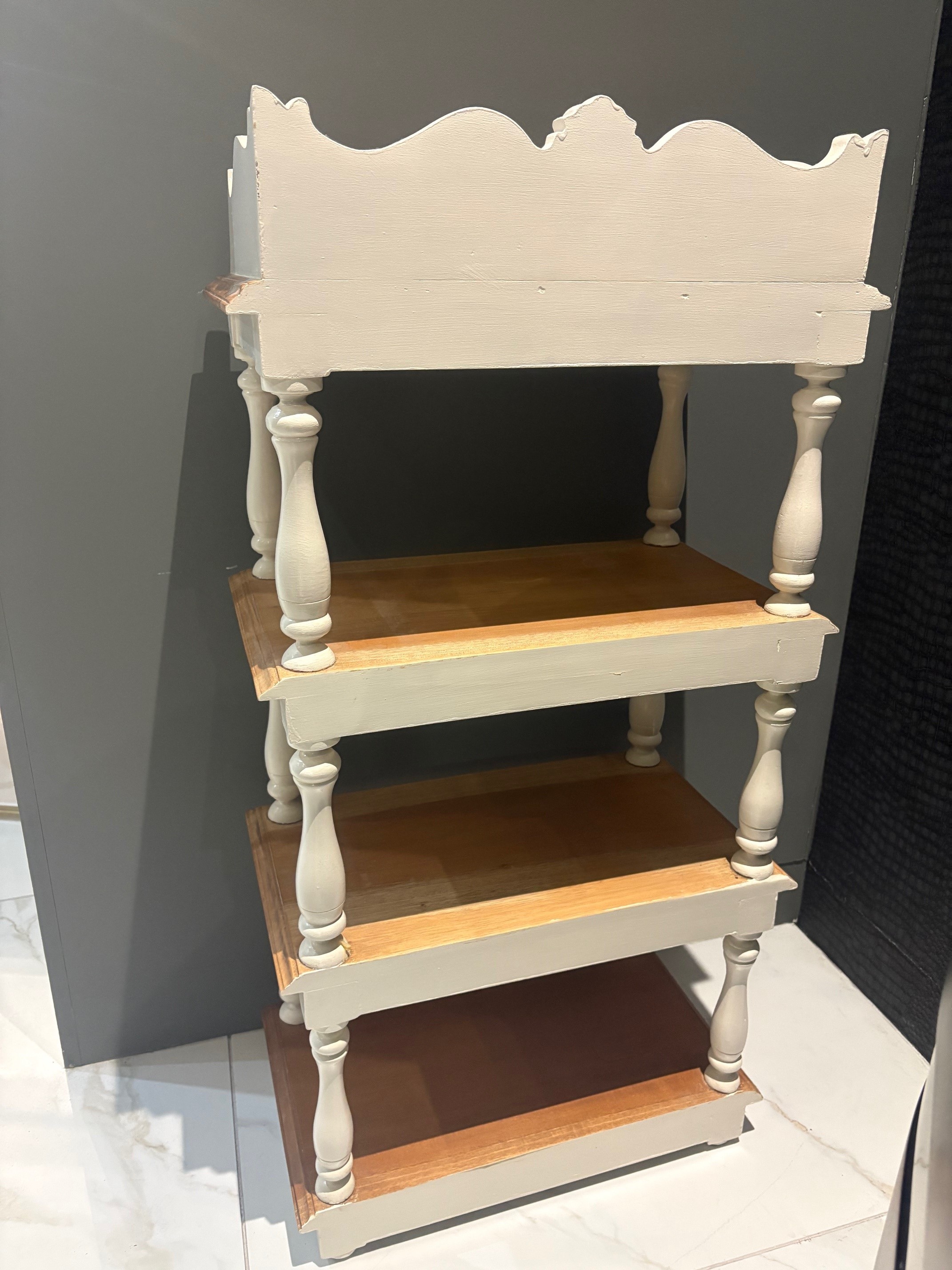 A vintage-style four tier wooden shelf unit featuring turned cream-painted legs and warm wood-stained shelves. The top shelf is framed with an ornate cream decorative back and side panels, showcasing carved scroll and shell detailing. The overall look blends classic farmhouse charm with traditional craftsmanship.