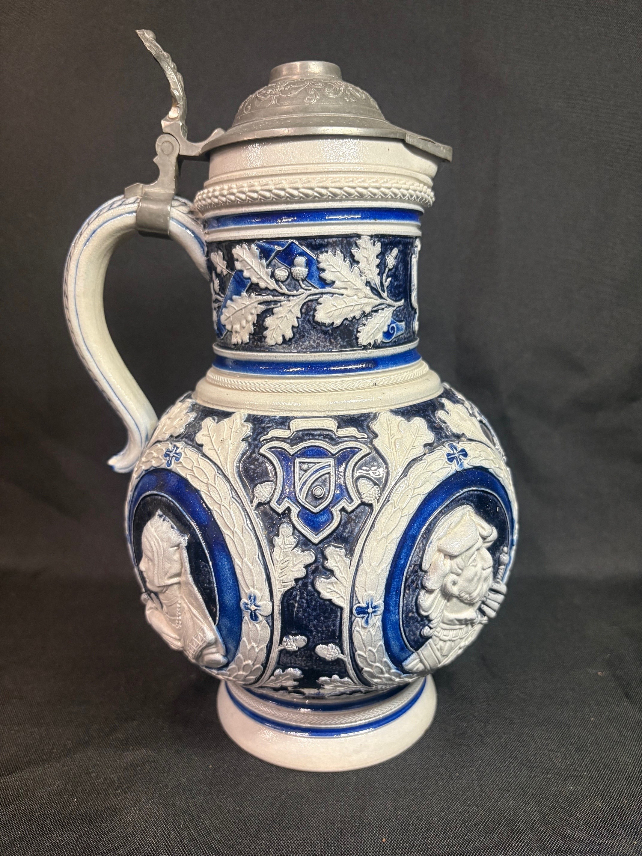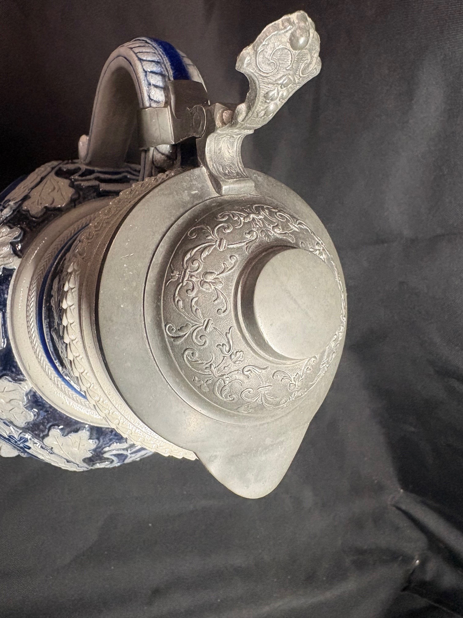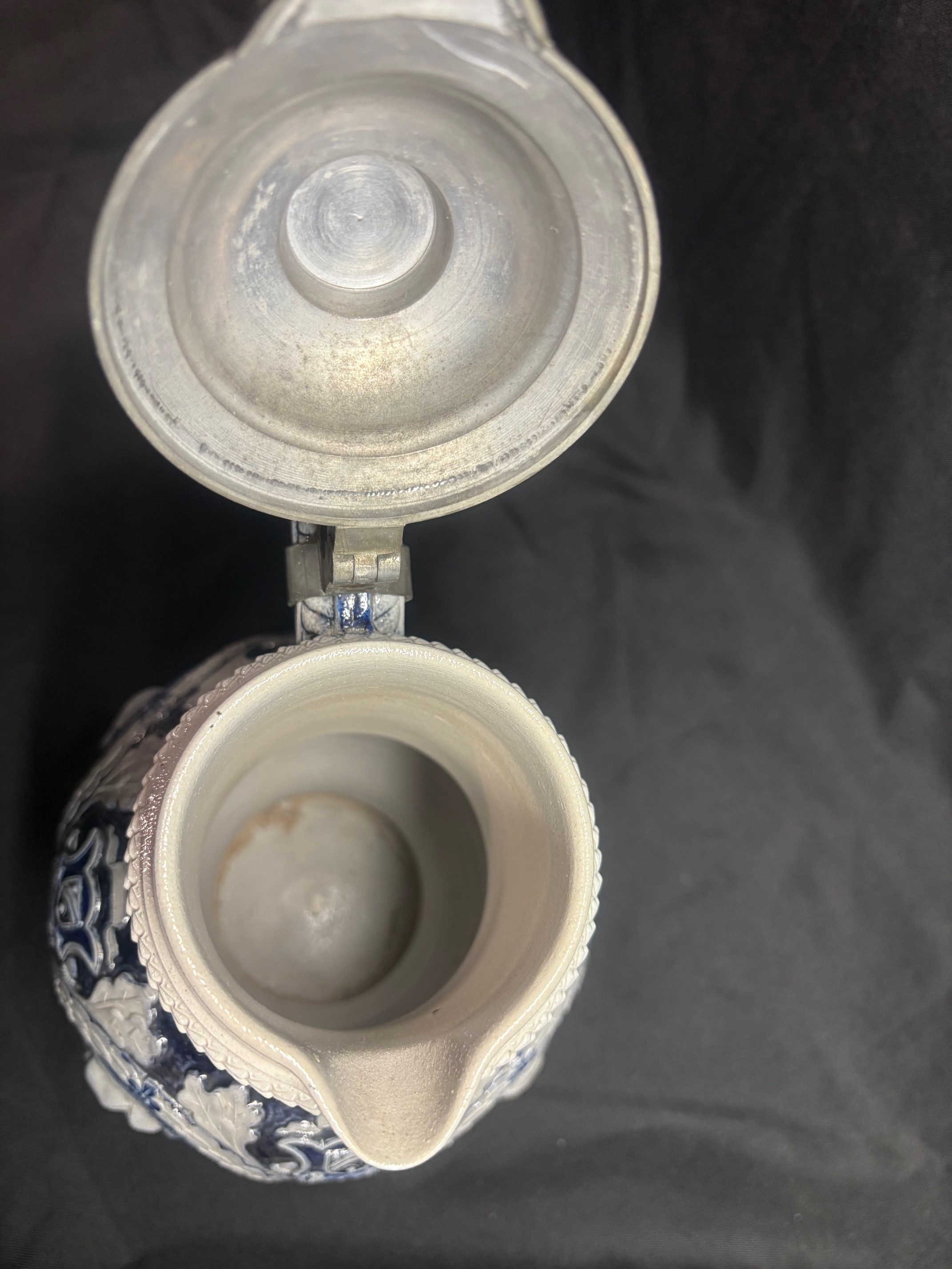 Antique cobalt blue jug/stein from Westerwald region Germany in beautiful condition depicting sharp high relief designs , complete with a pewter flip up lid.