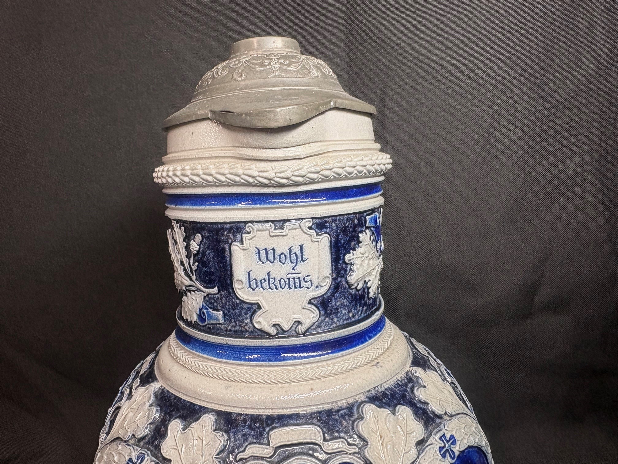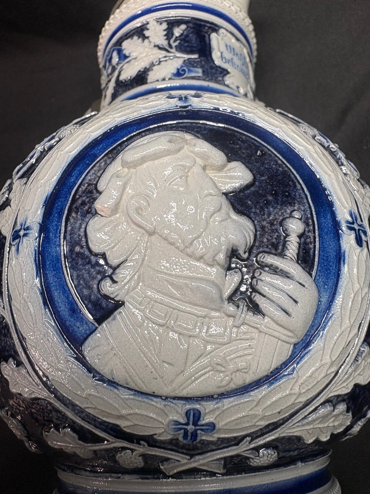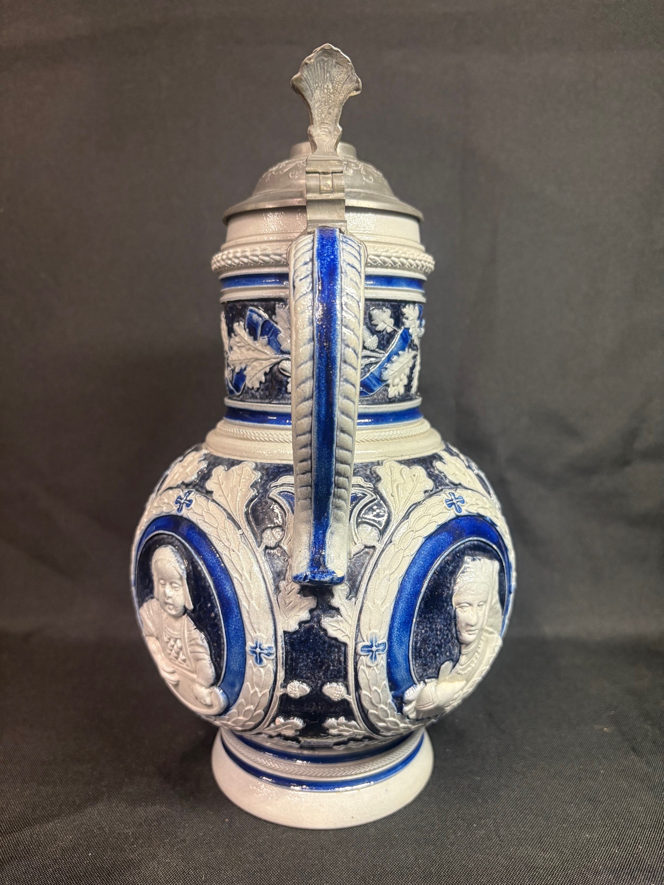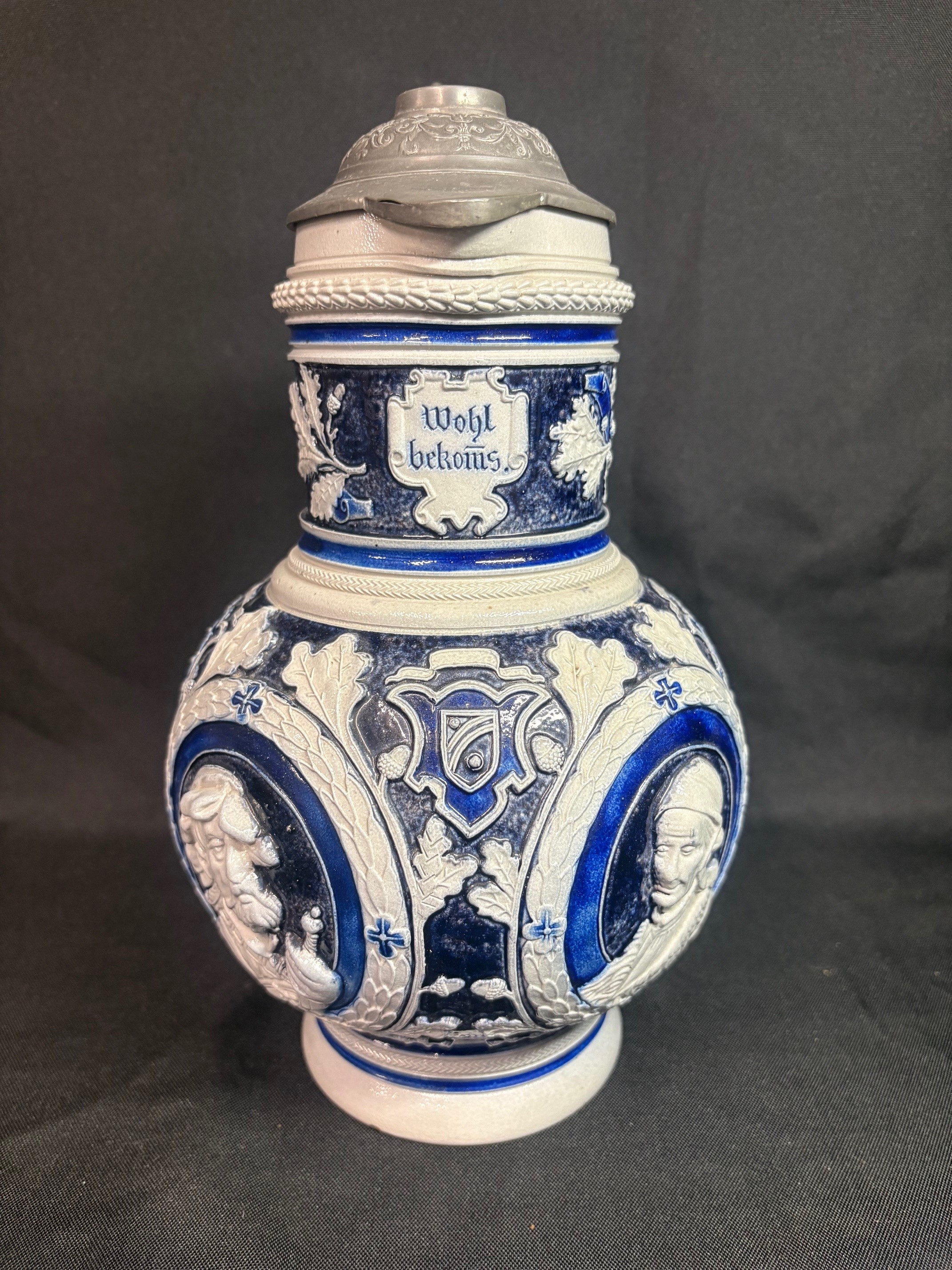 Antique cobalt blue jug/stein from Westerwald region Germany in beautiful condition depicting sharp high relief designs , complete with a pewter flip up lid.