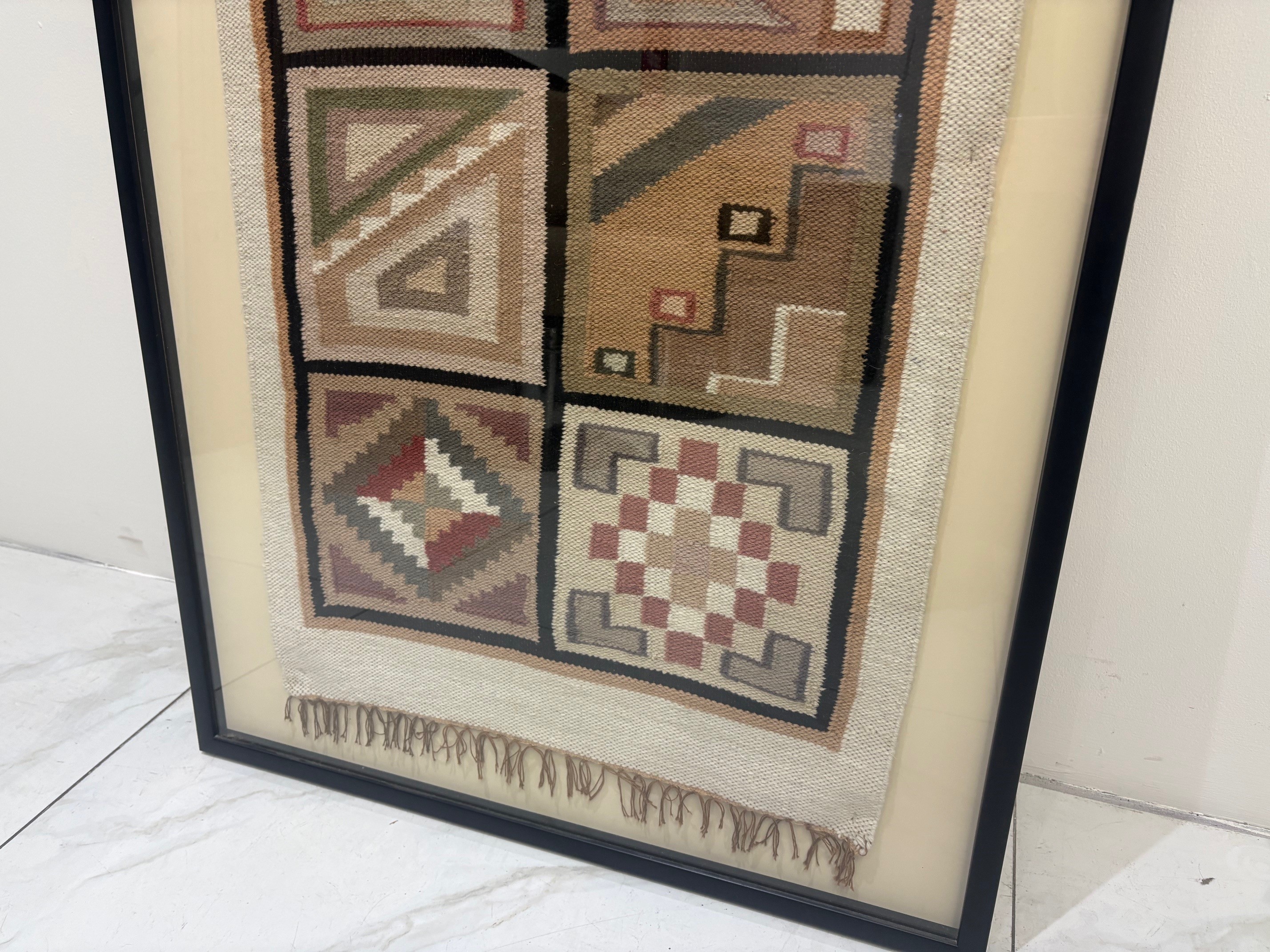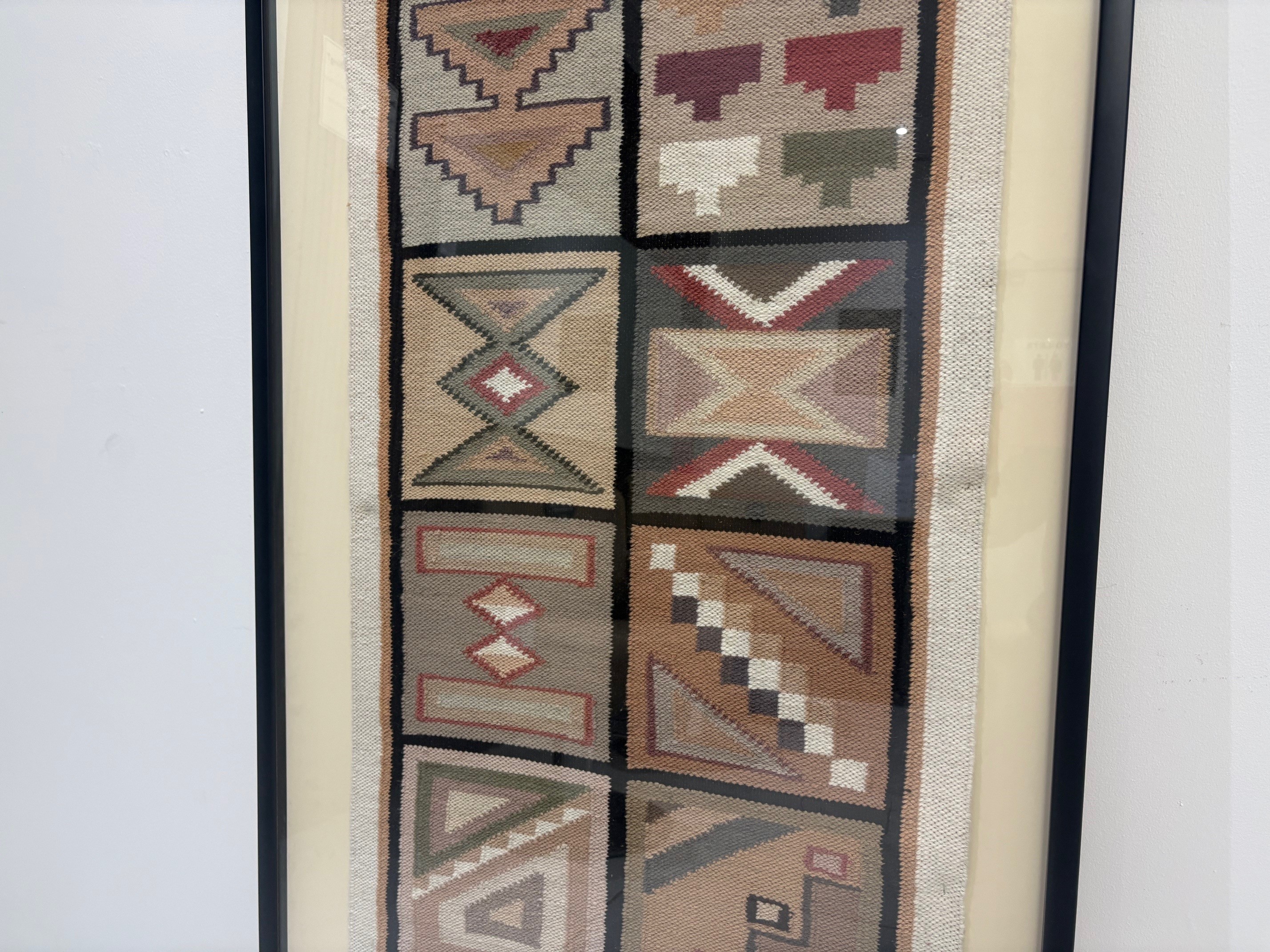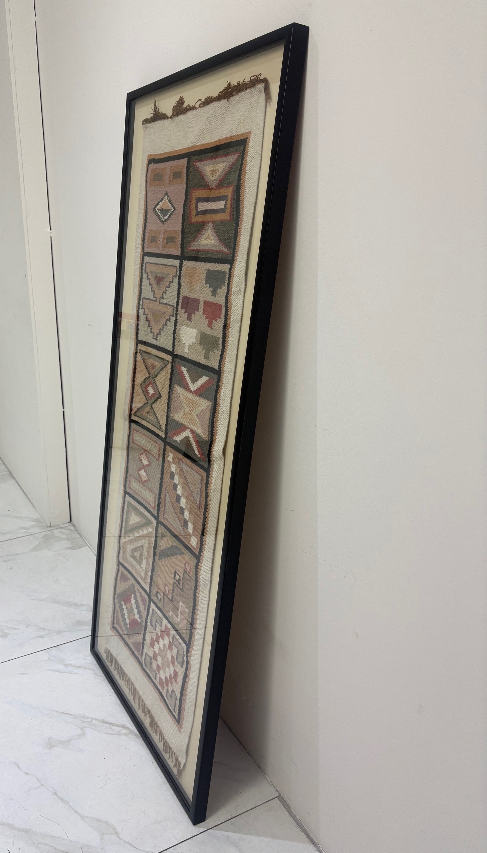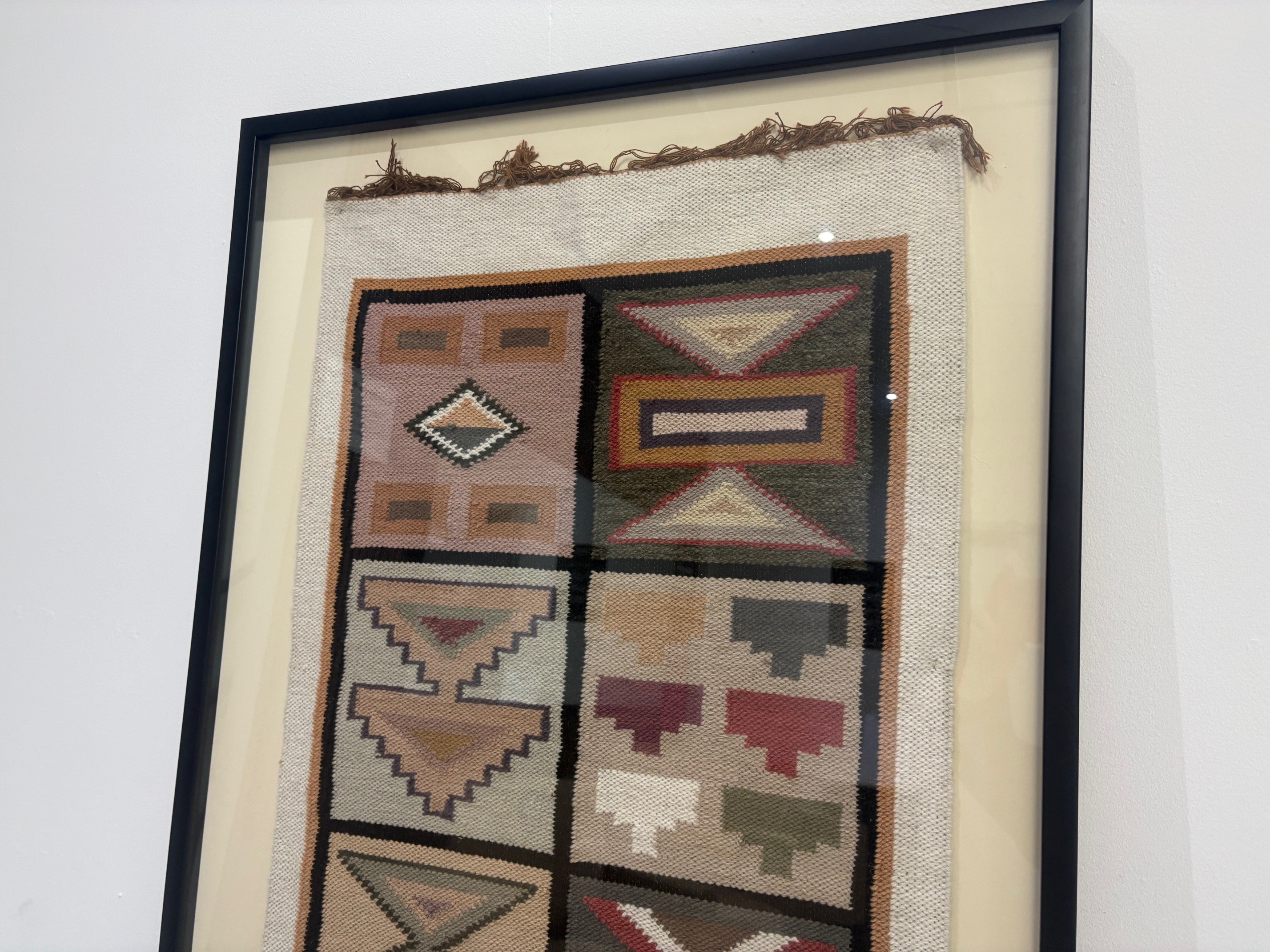A vintage Navajo style woven rug ,framed and glazed, by Artefact, ready for hanging. With geometric patterns in earth tones.