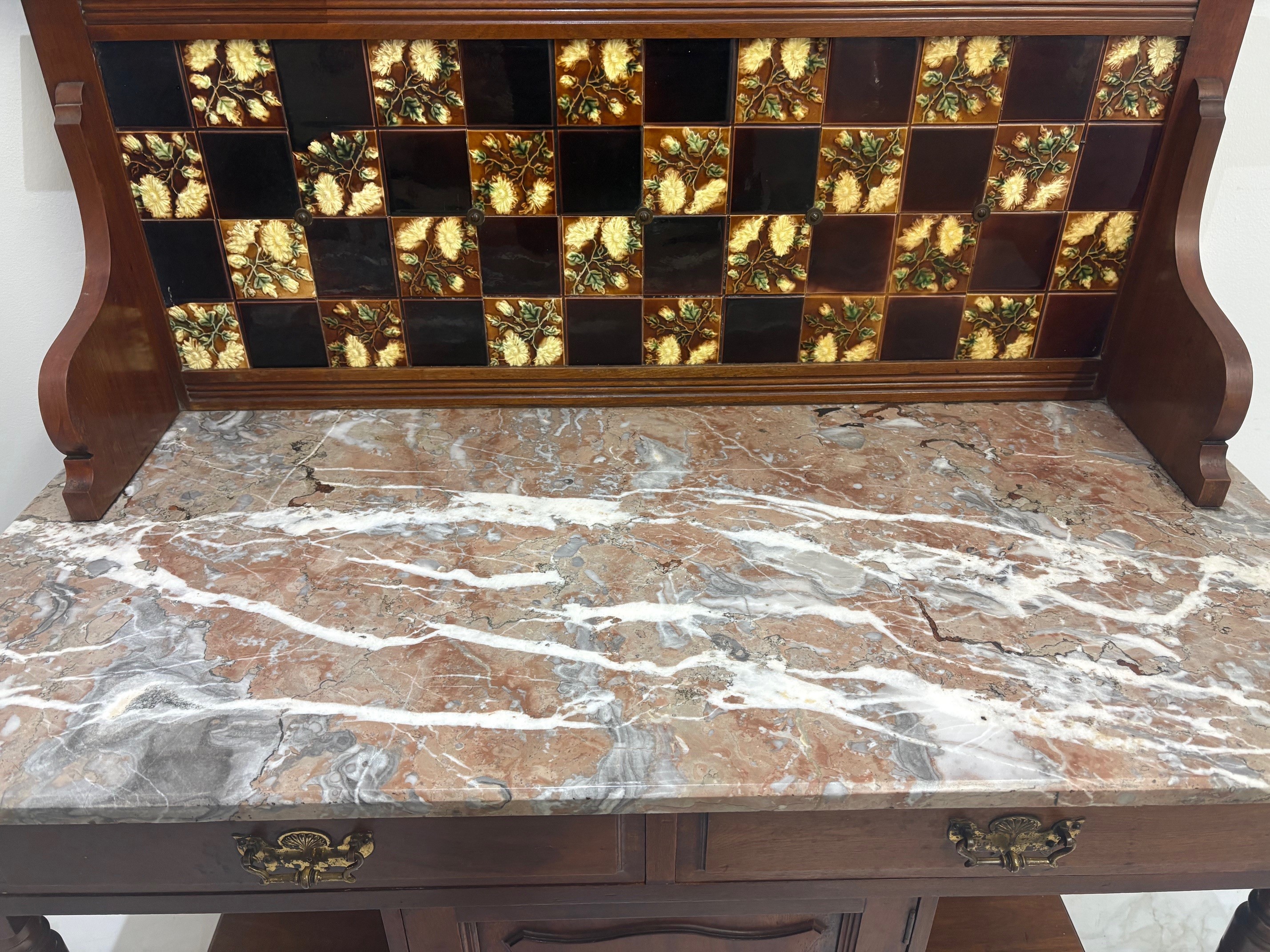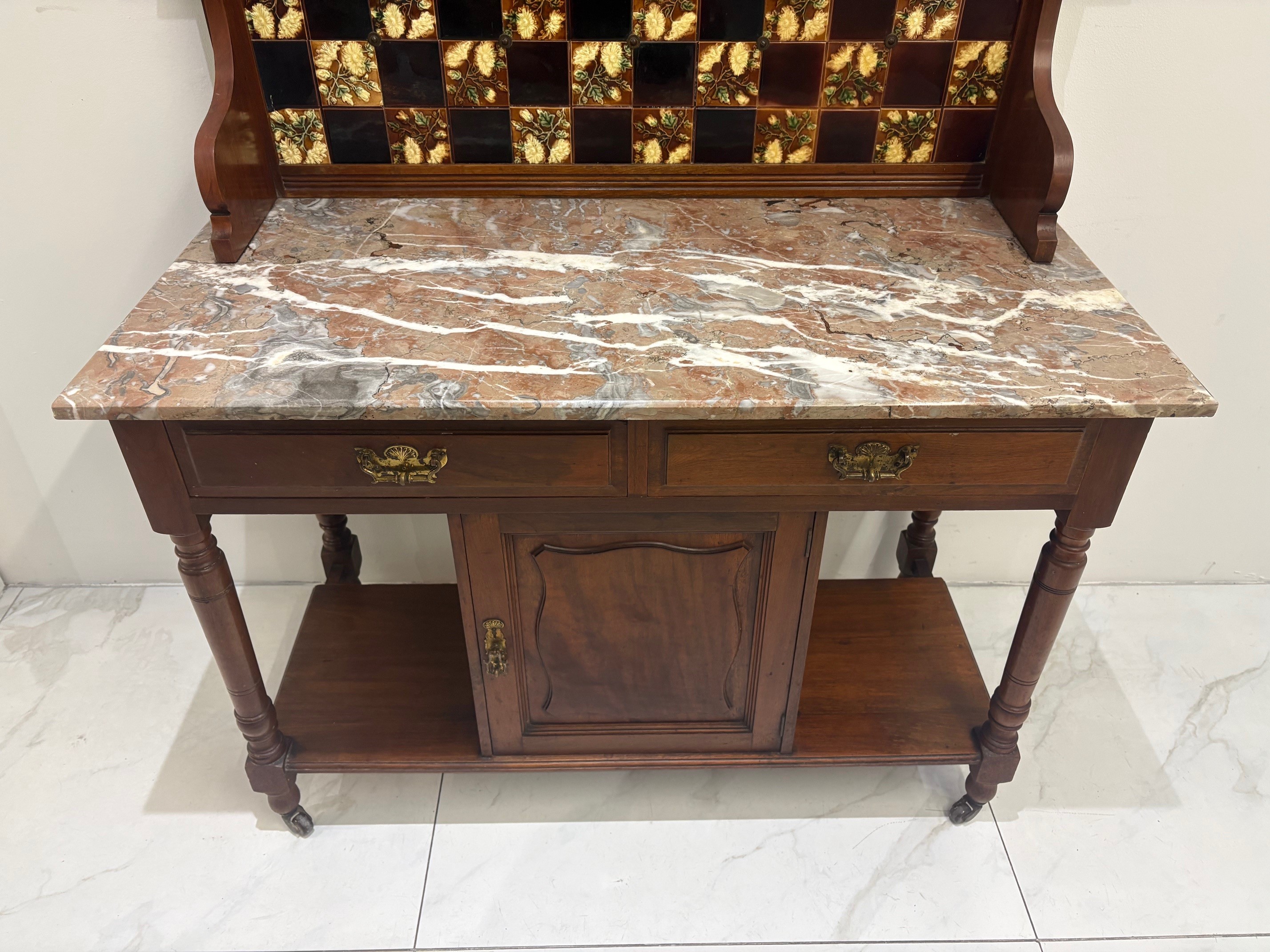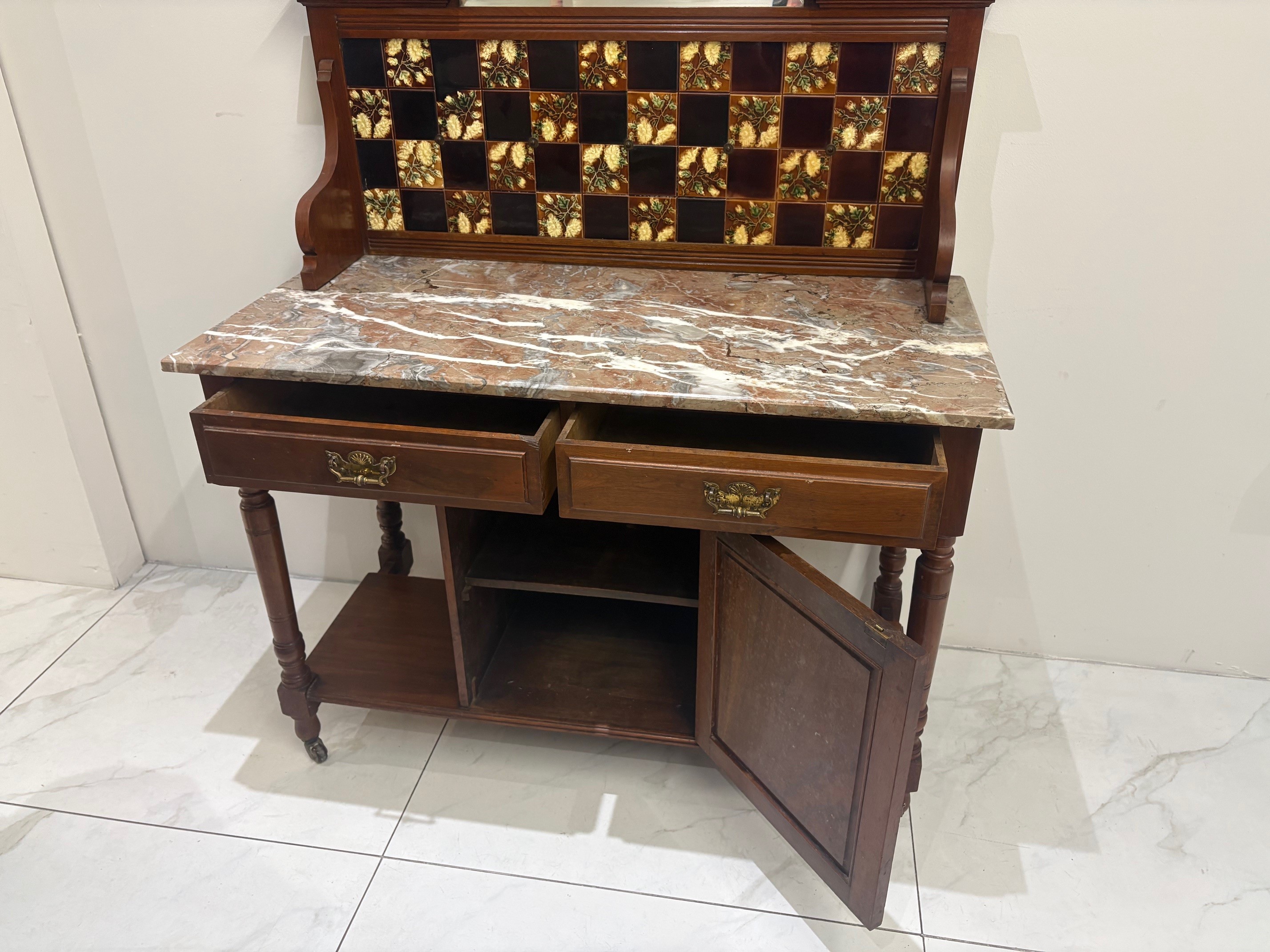 Antique Victorian Mahogany Washstand with marble top & tiled backsplash.