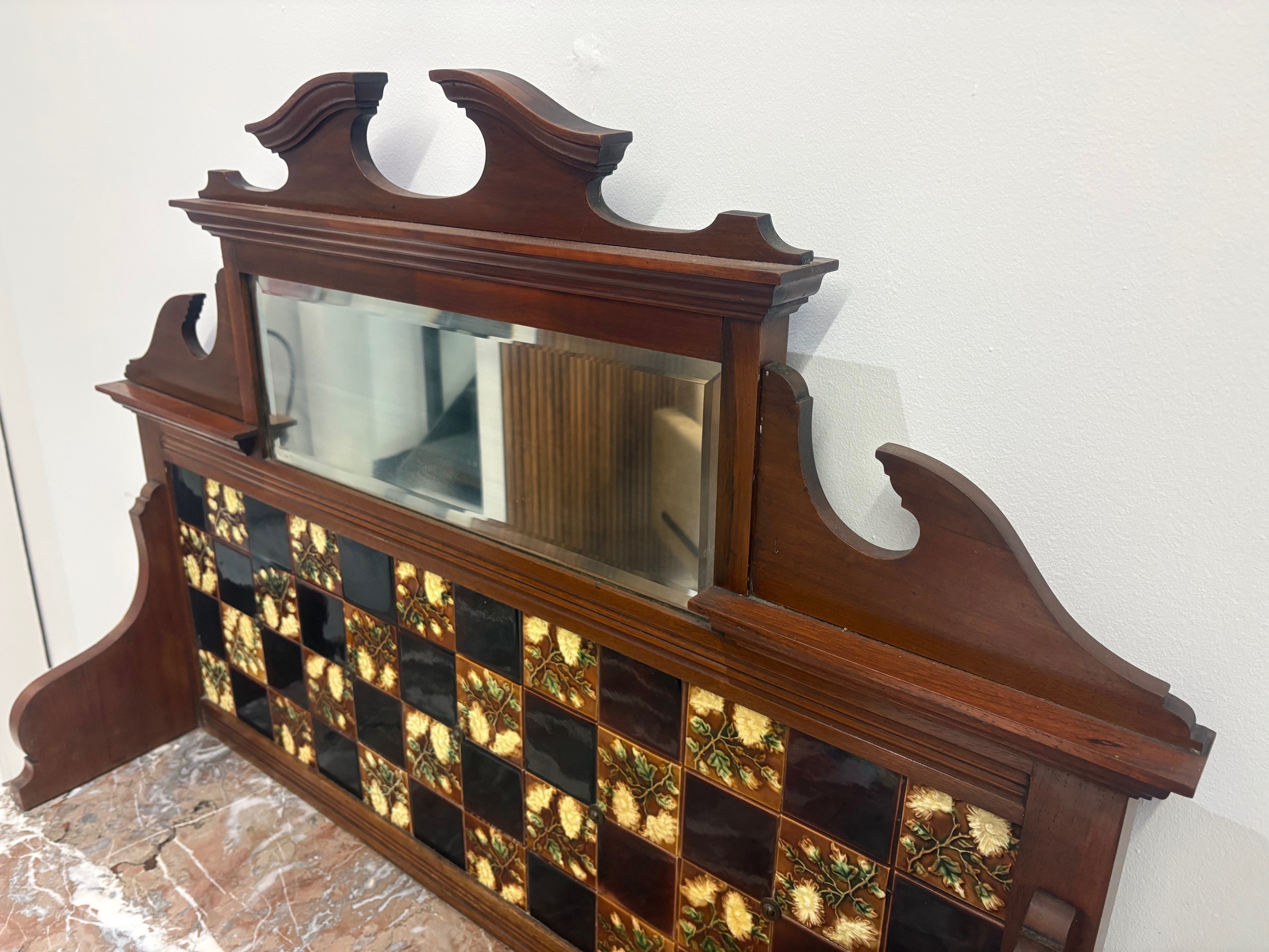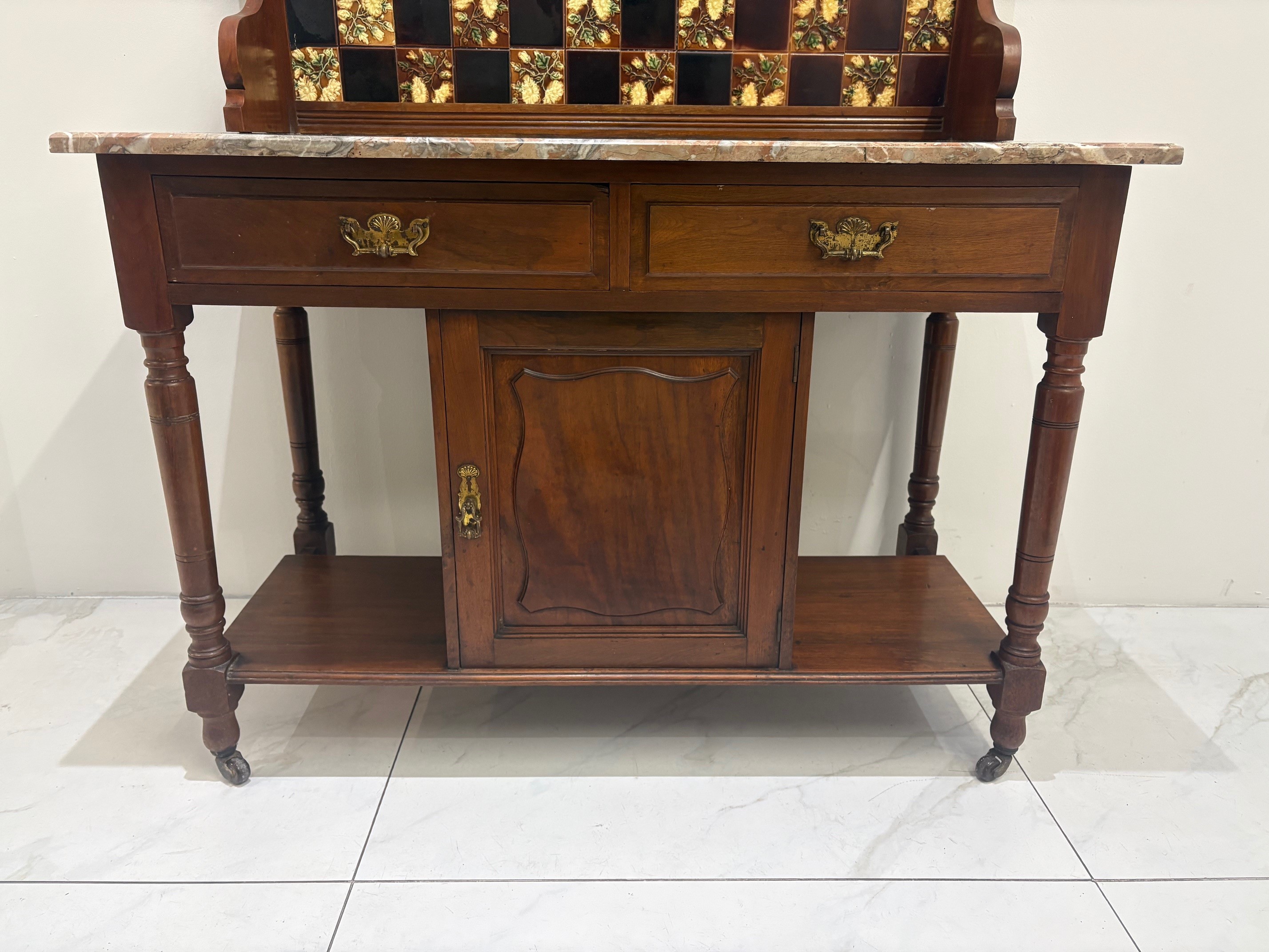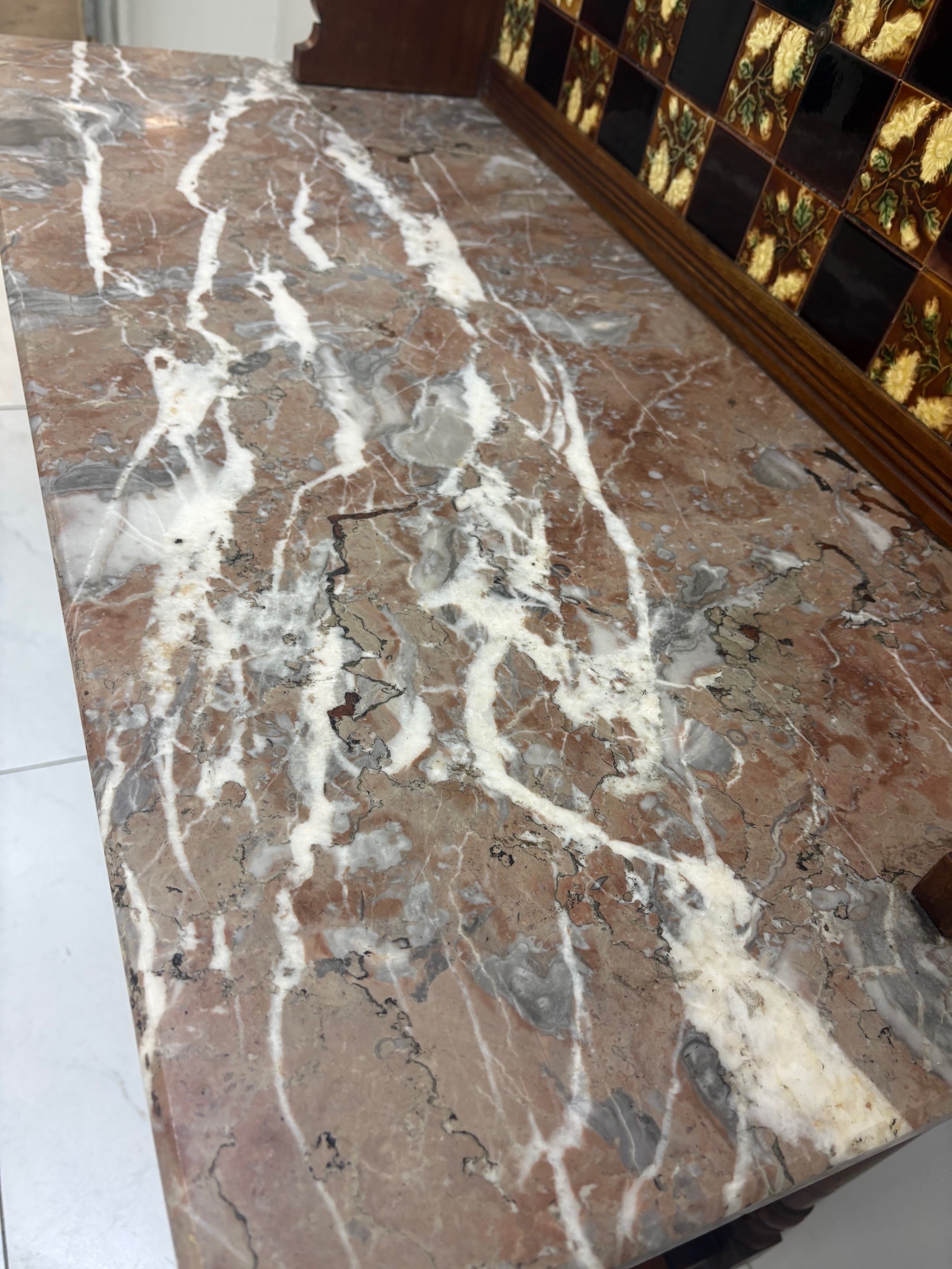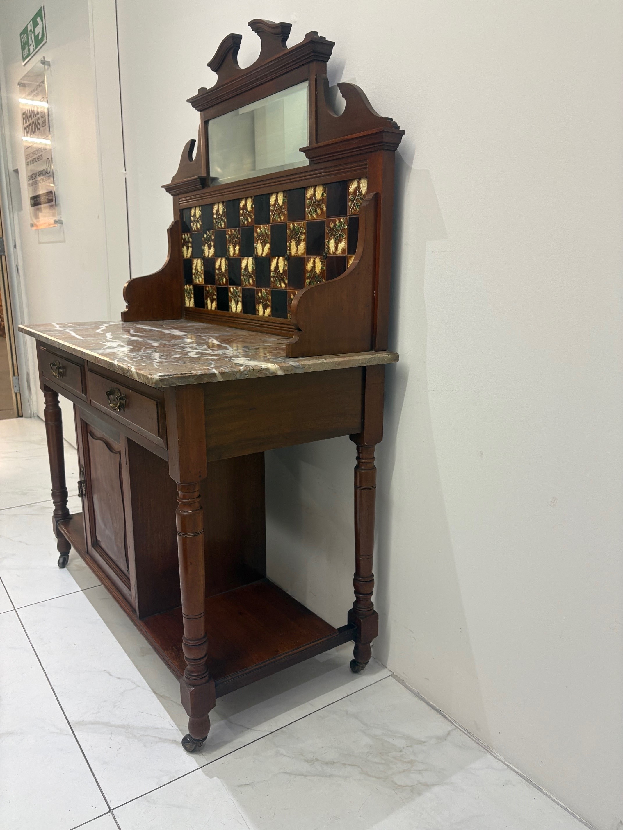 Antique Victorian Mahogany Washstand with marble top & tiled backsplash.