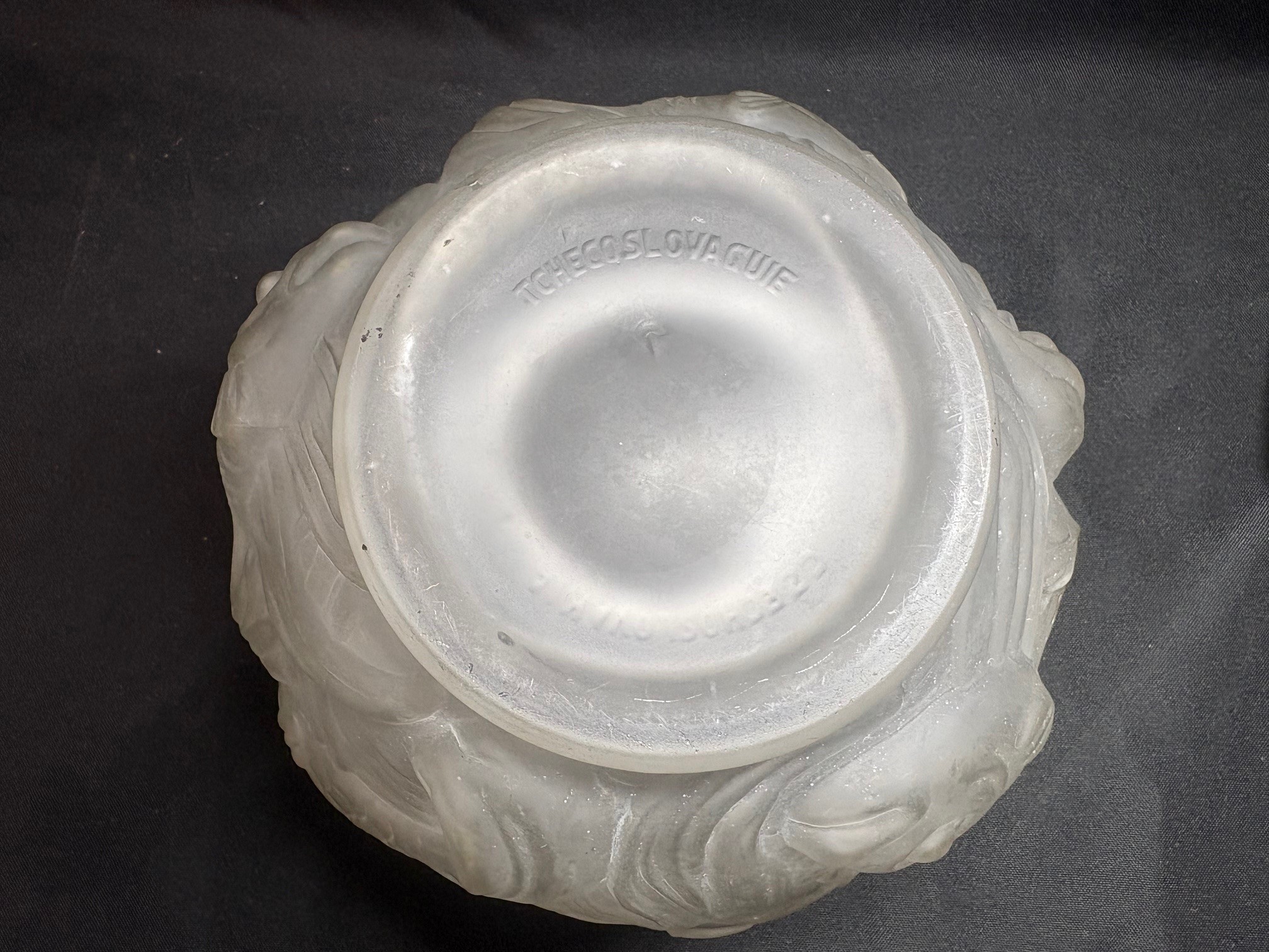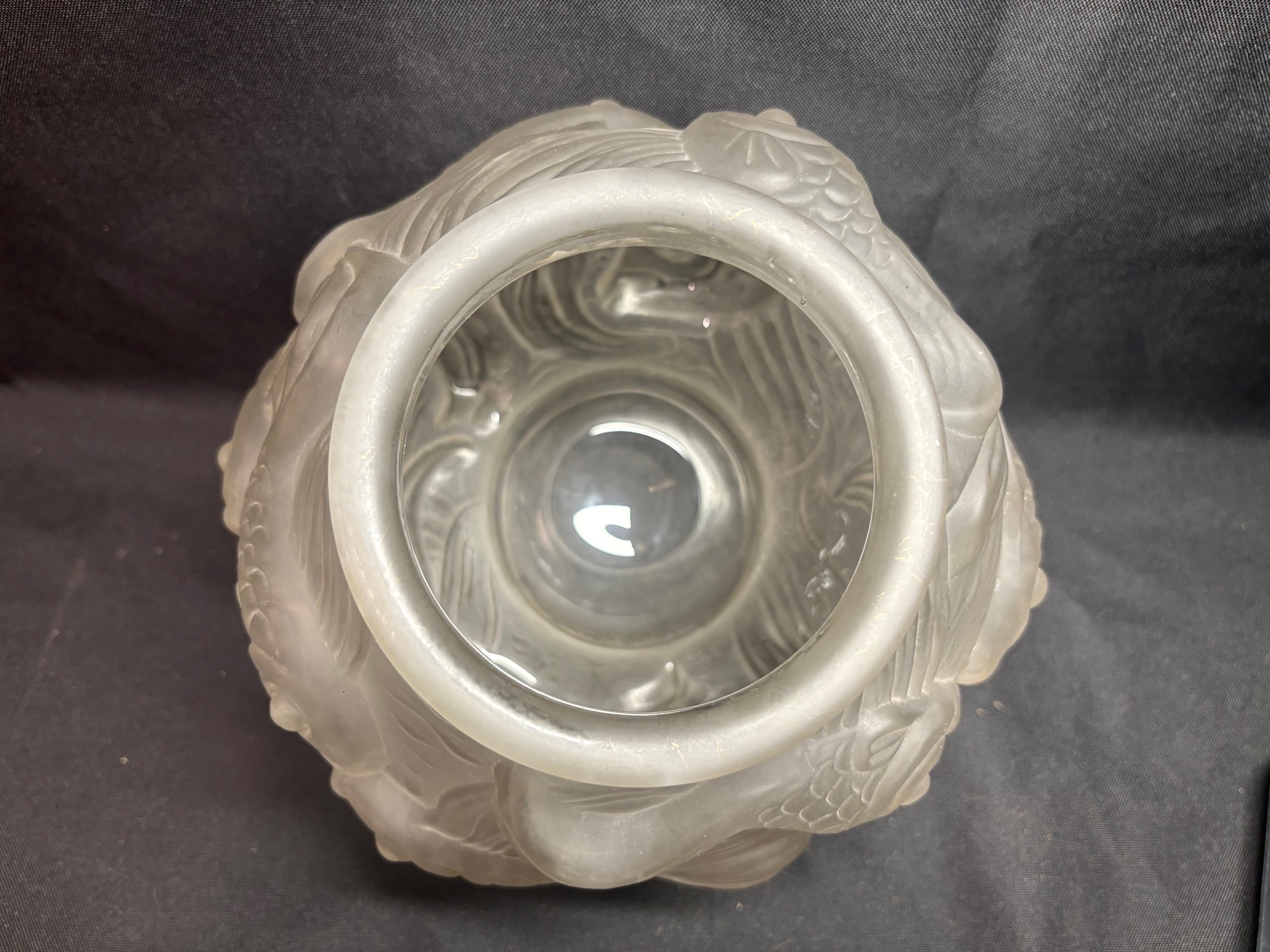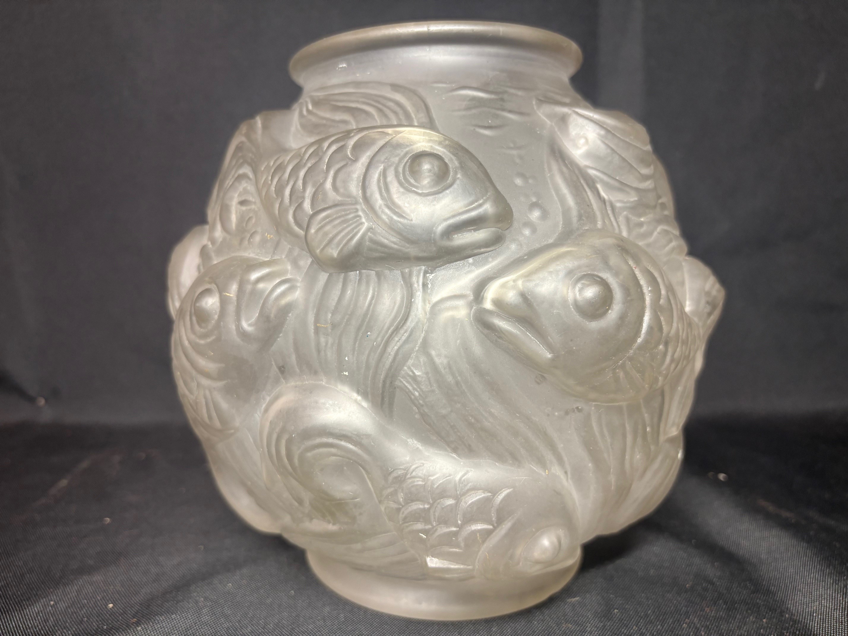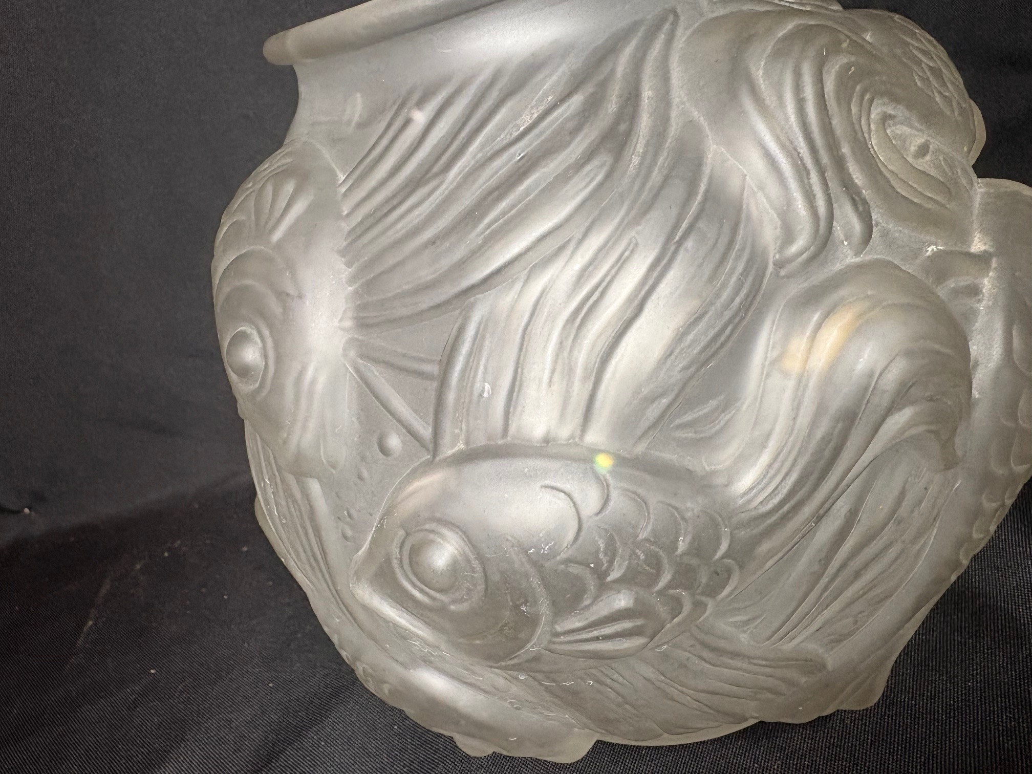 1930s pressed frosted glass vase with impressions of Koi fish , stamped on the bottom Czechoslovakia and reminiscent of Lalique.