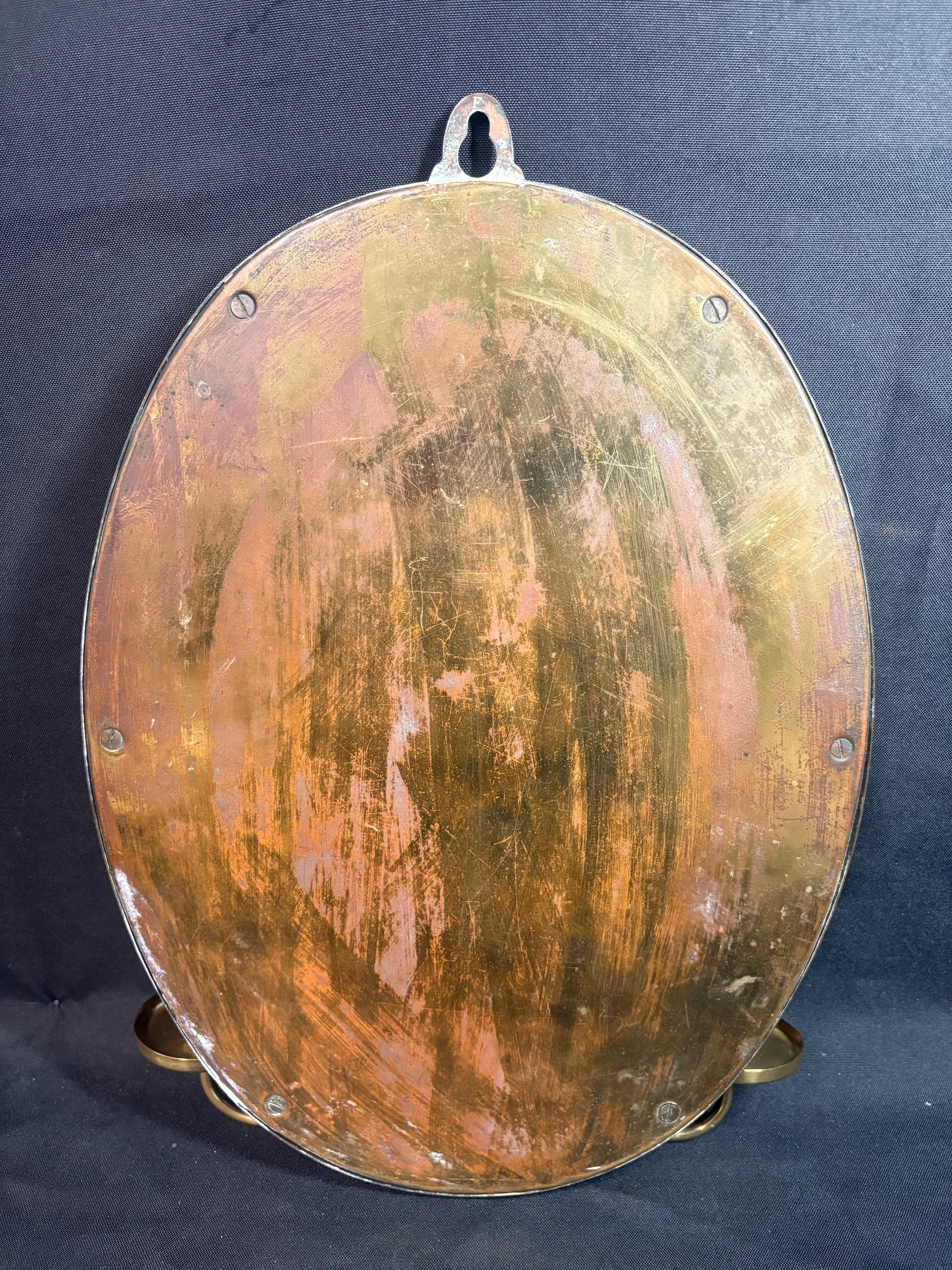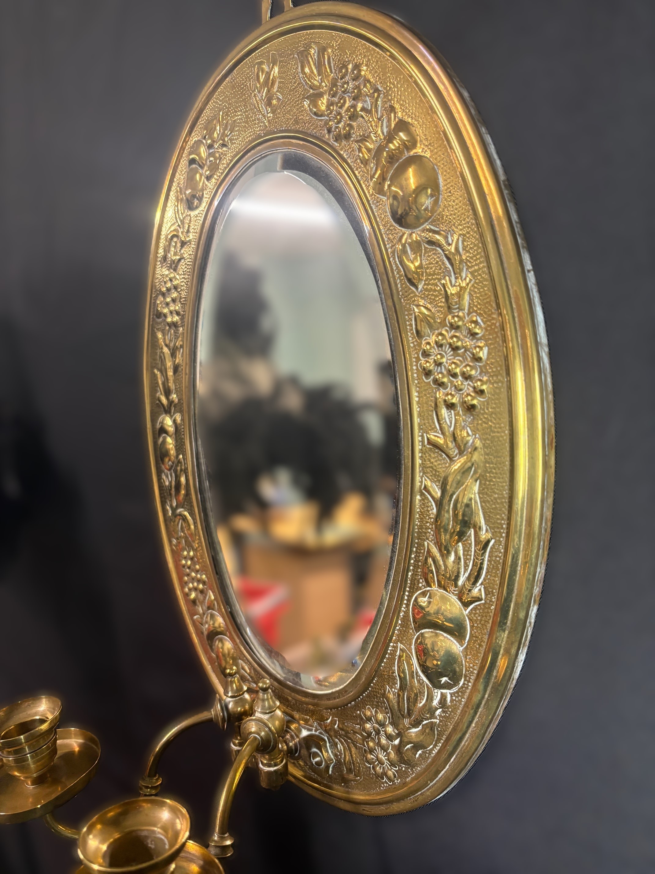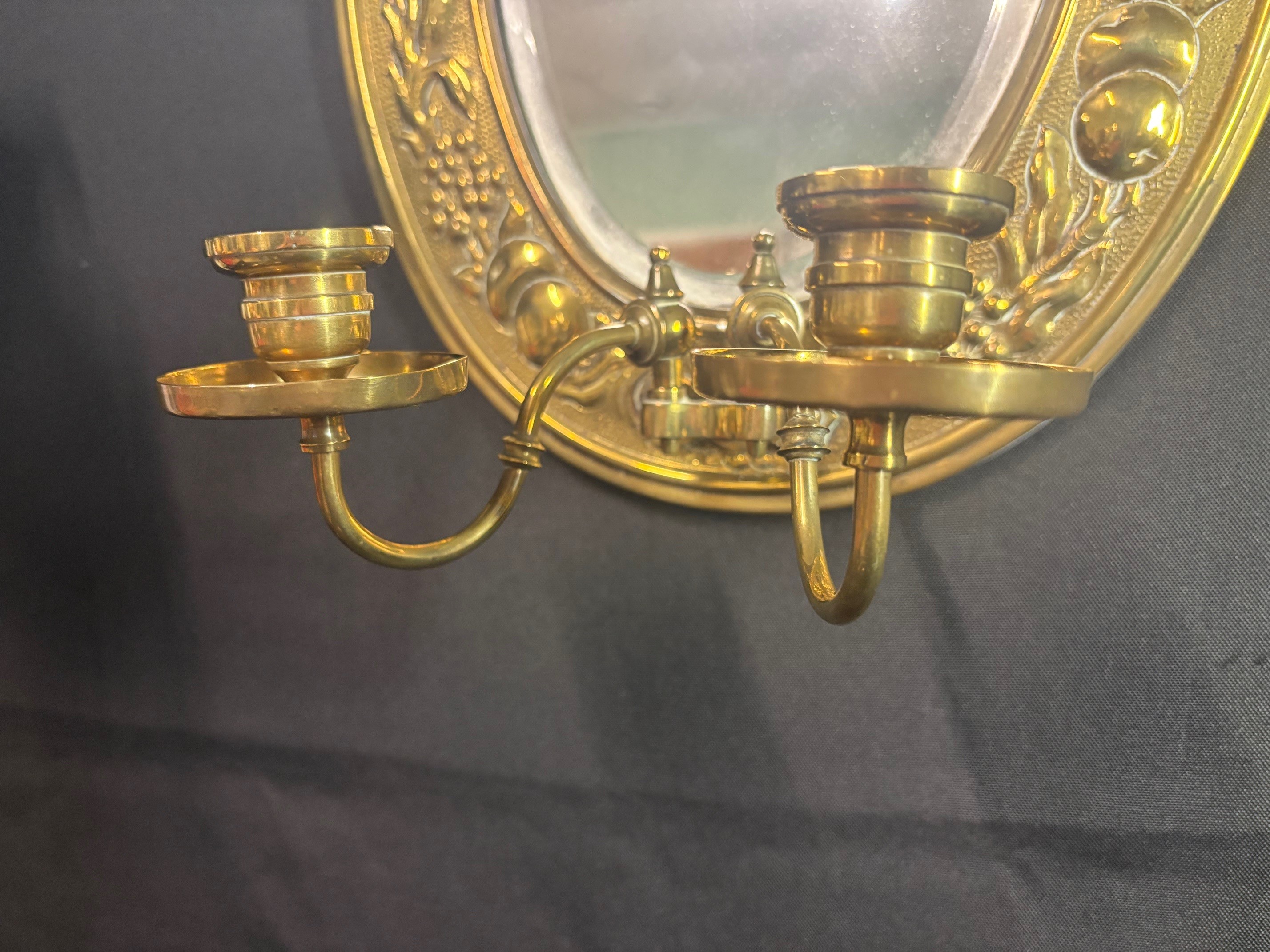 Gilt oval girandole wall mirror, featuring a chased brass frame with a continuous vine carving and two candleholders.