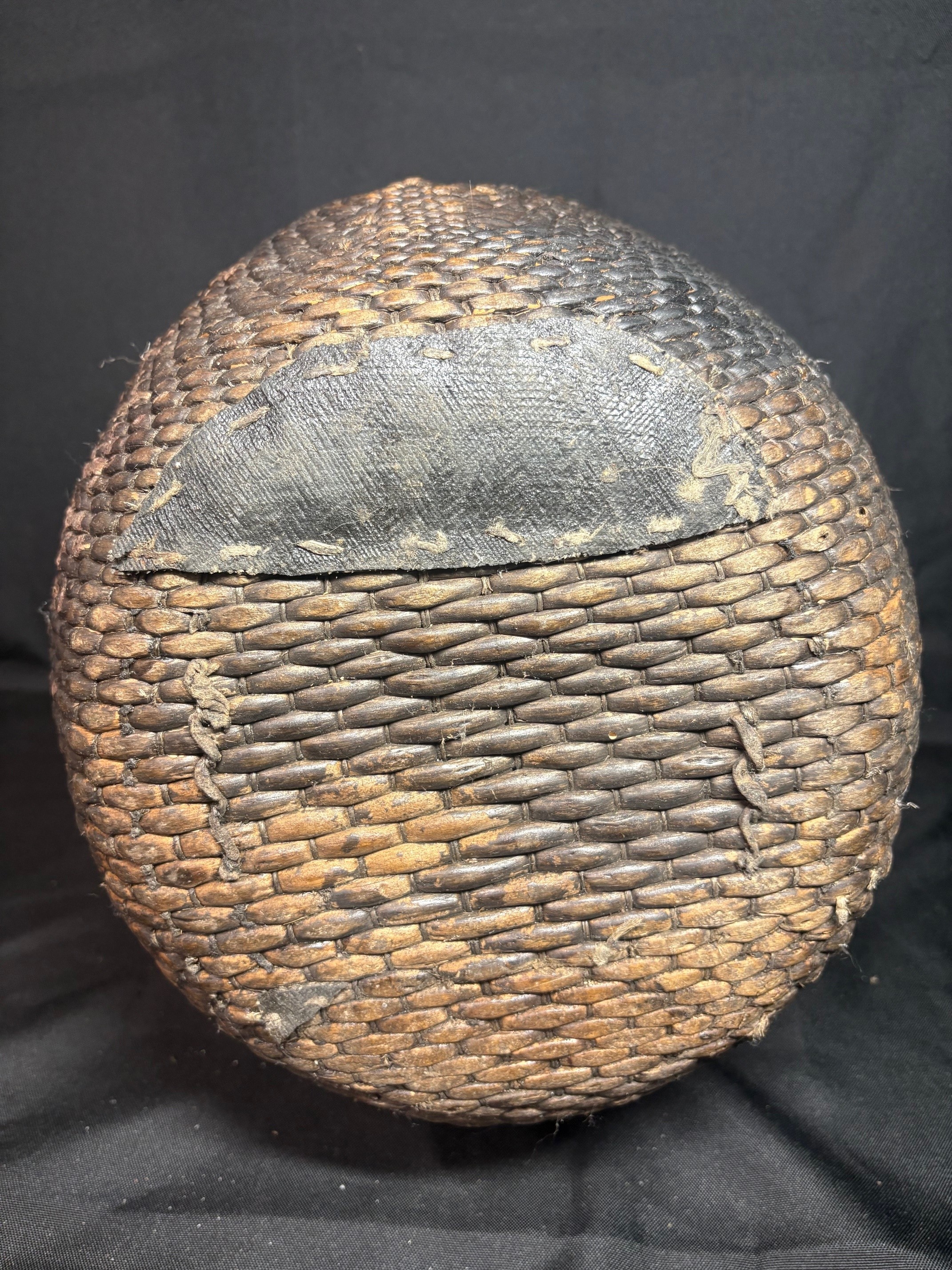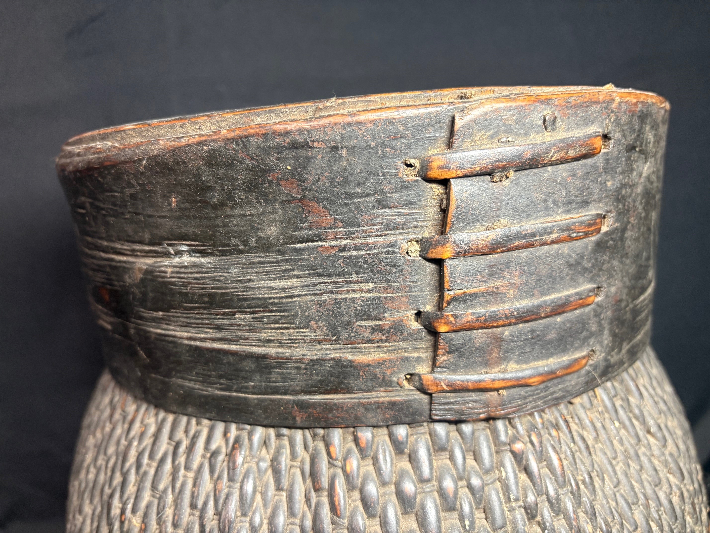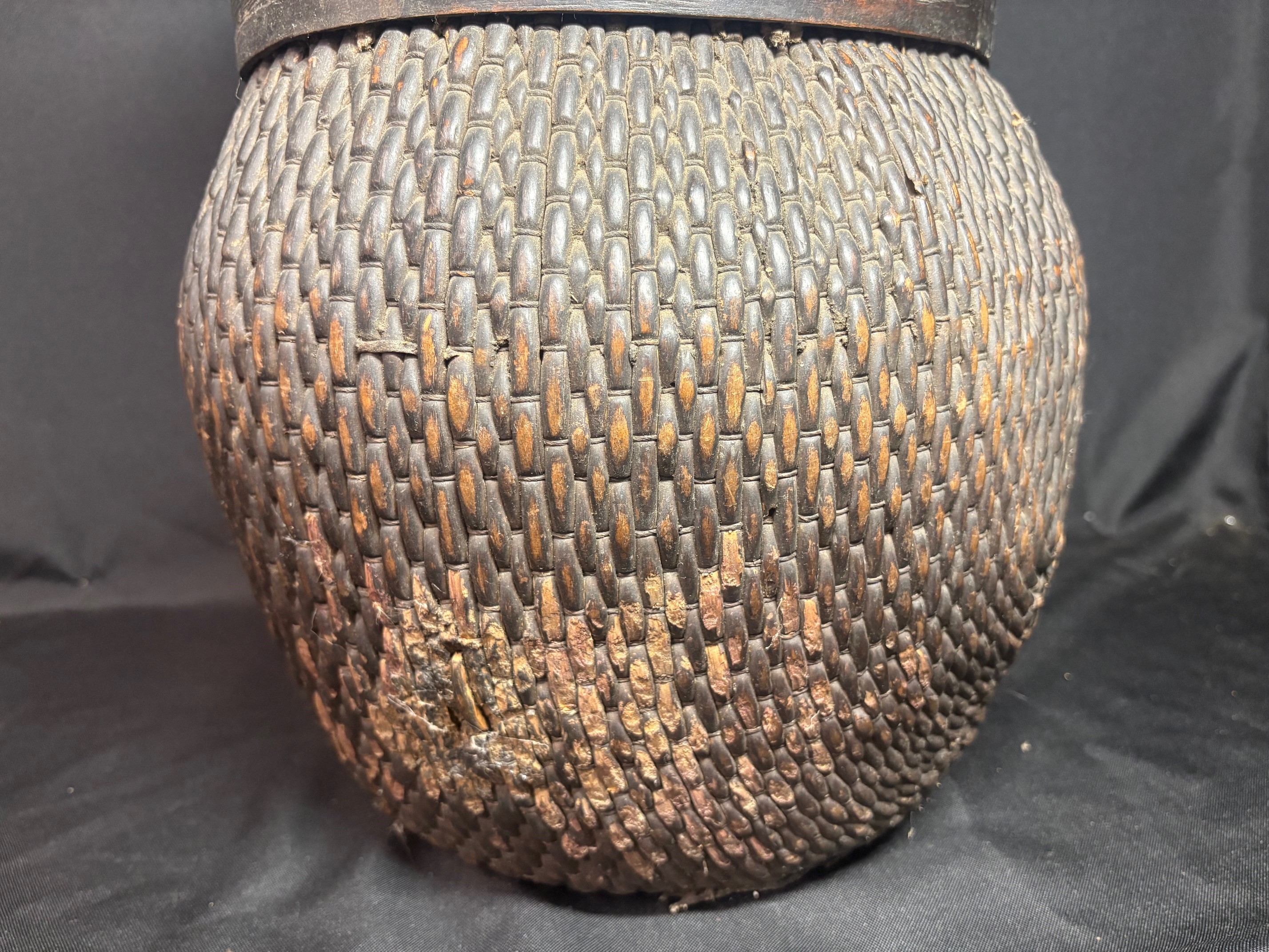 Antique rustic Far Eastern intricately woven rattan container for everyday use carrying rice, fish or other essentials. Shows wear from age but generally survived in good condition - VIN1222H
