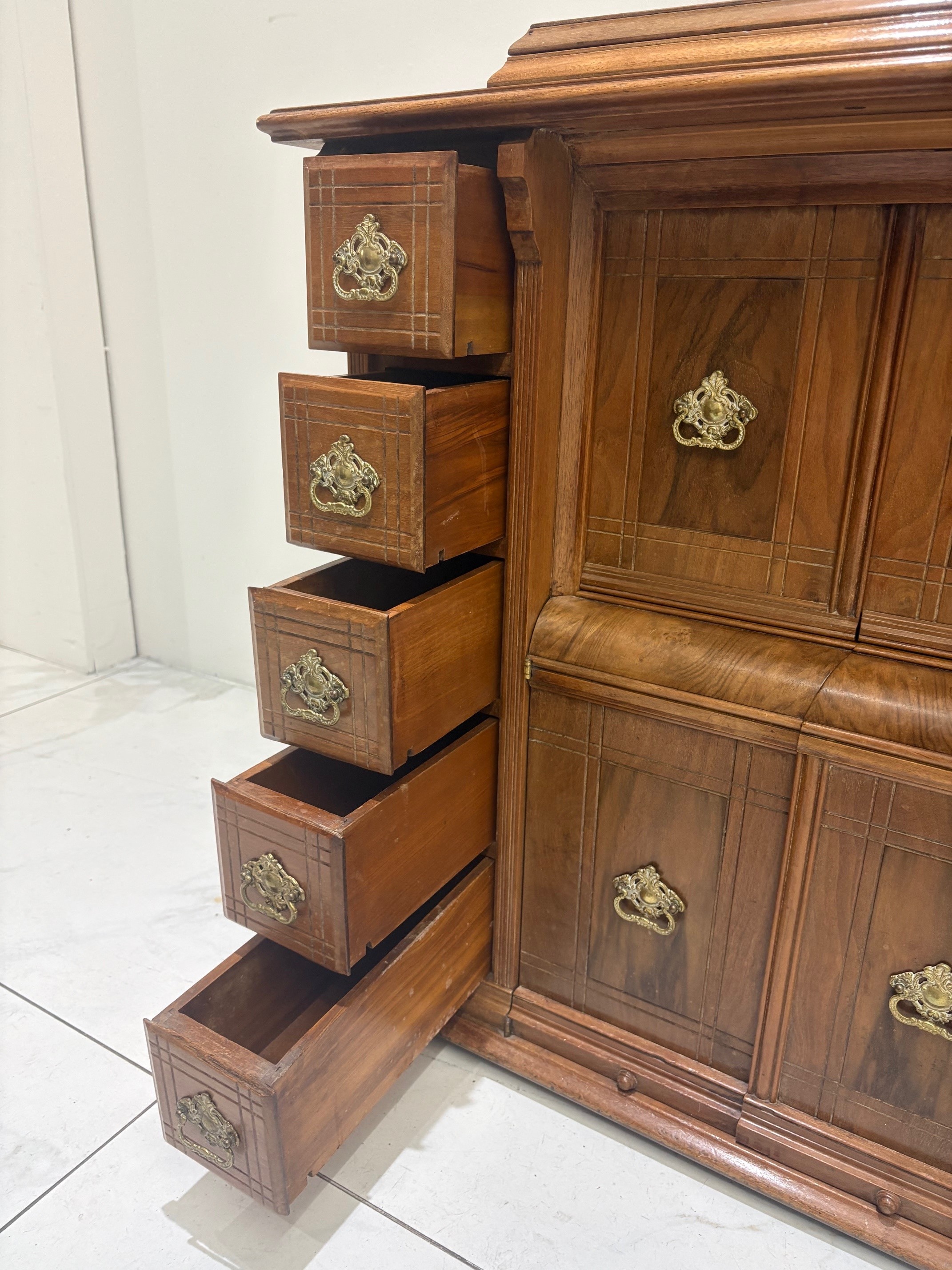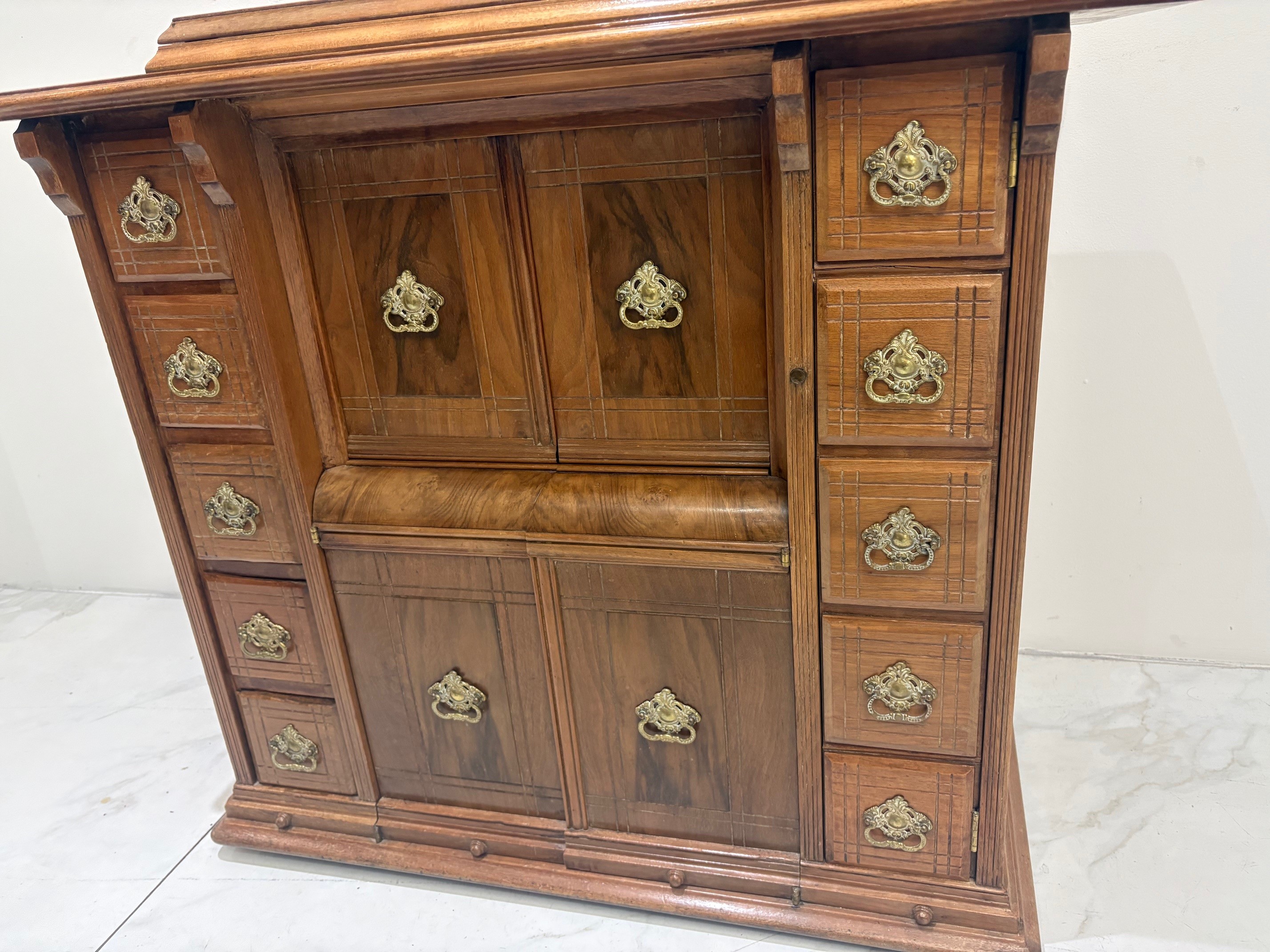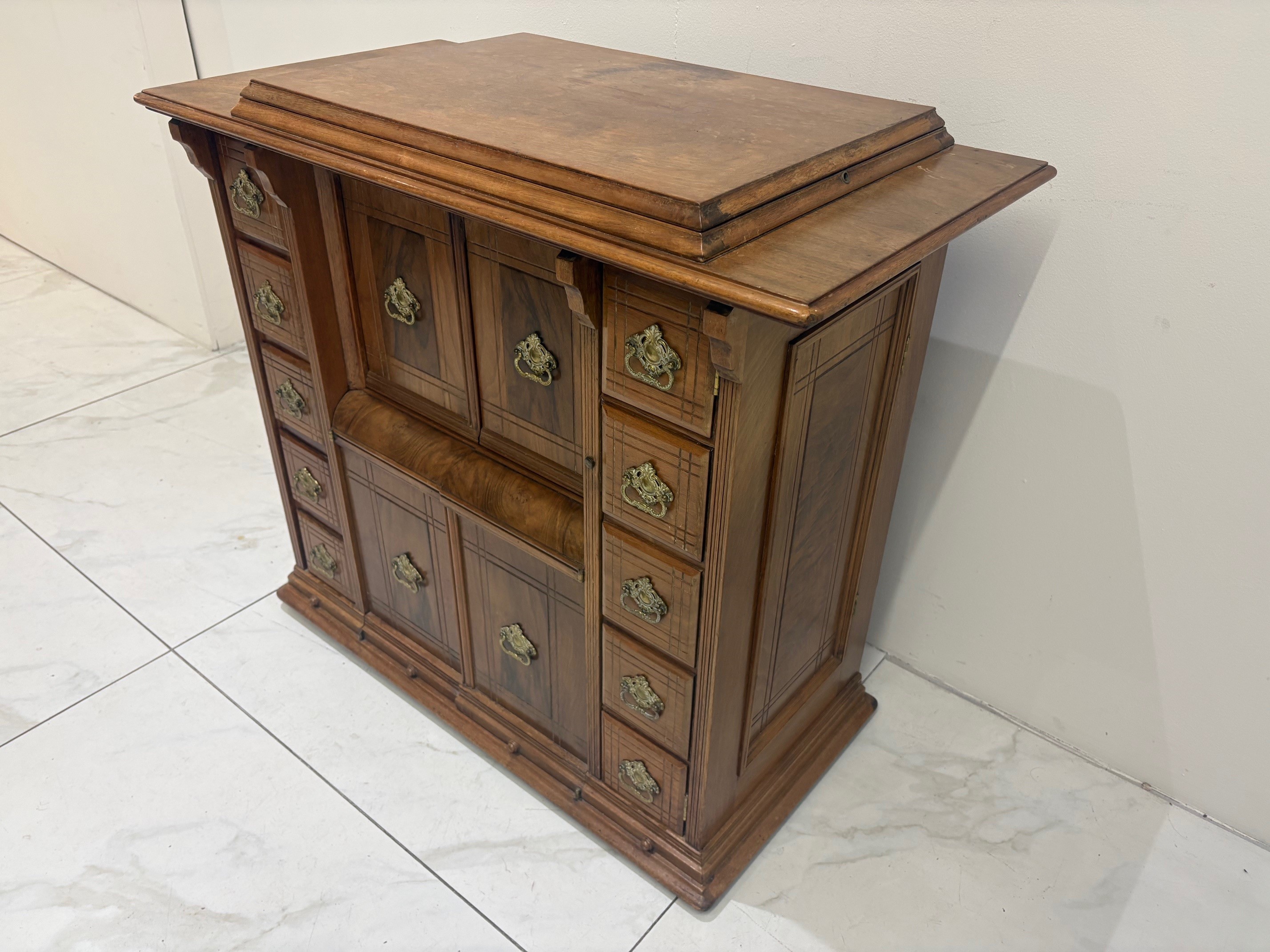 Hinged, moulded, rectangular top over a combination of various doors and drawers with gilt metal handles.