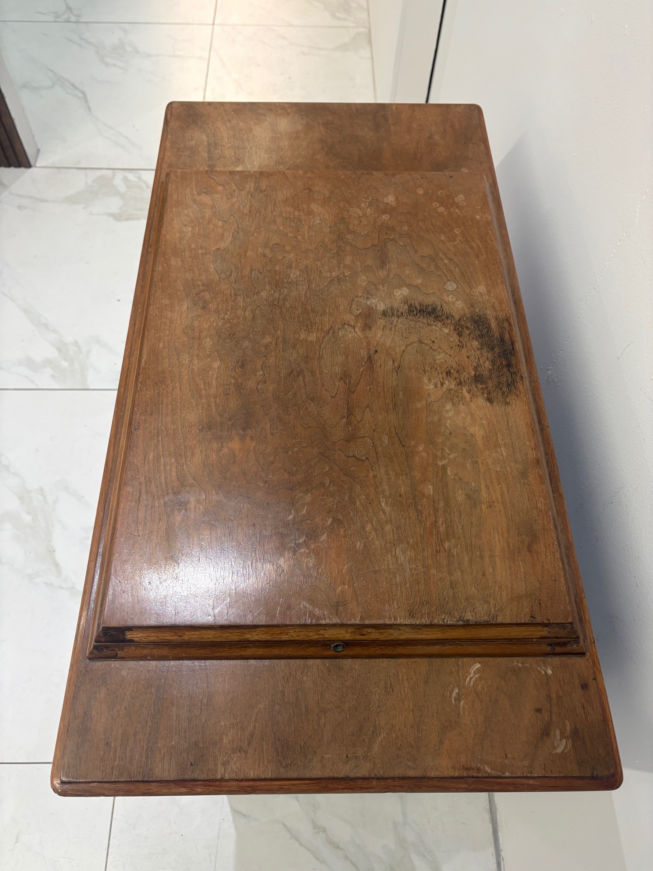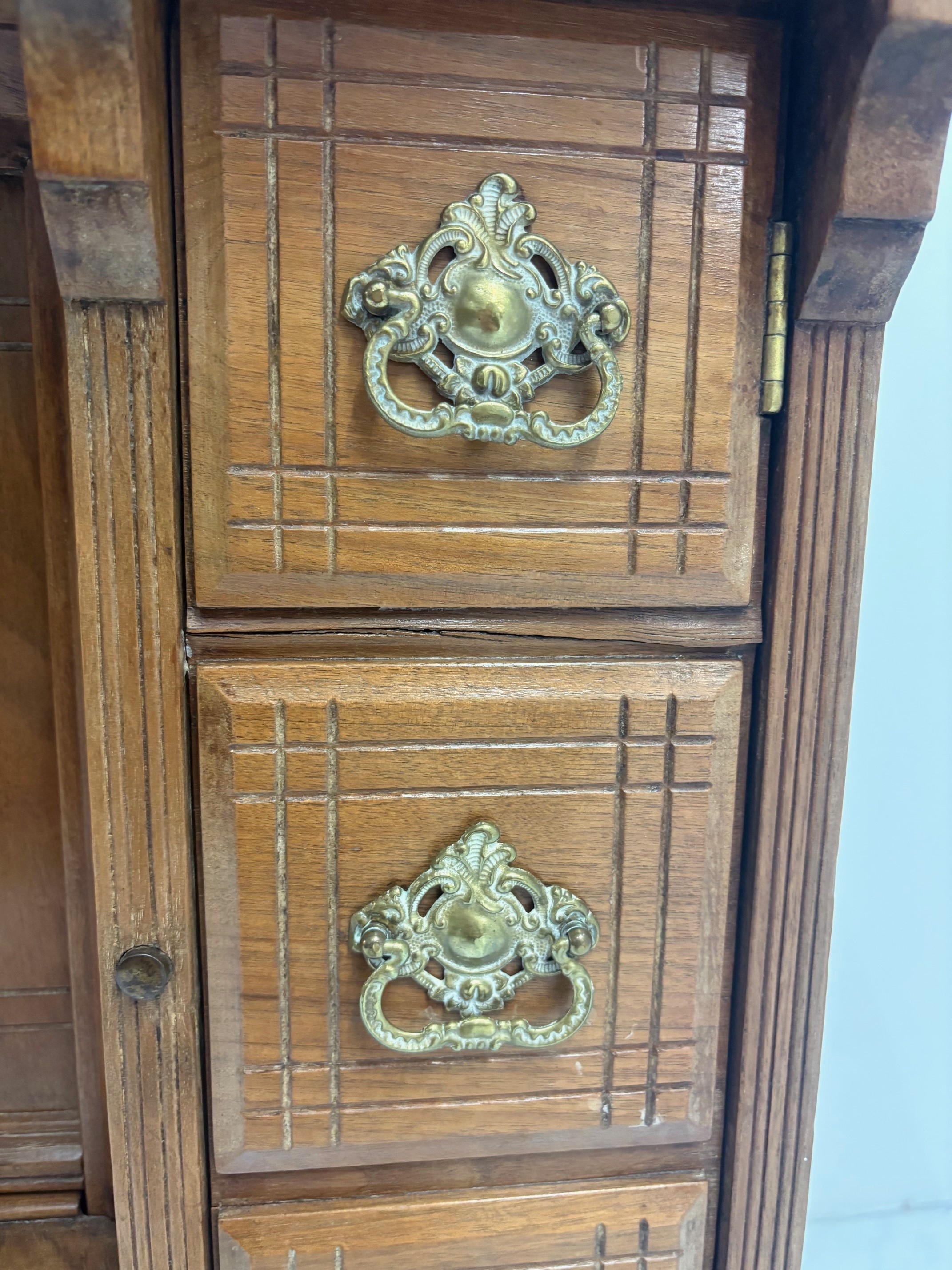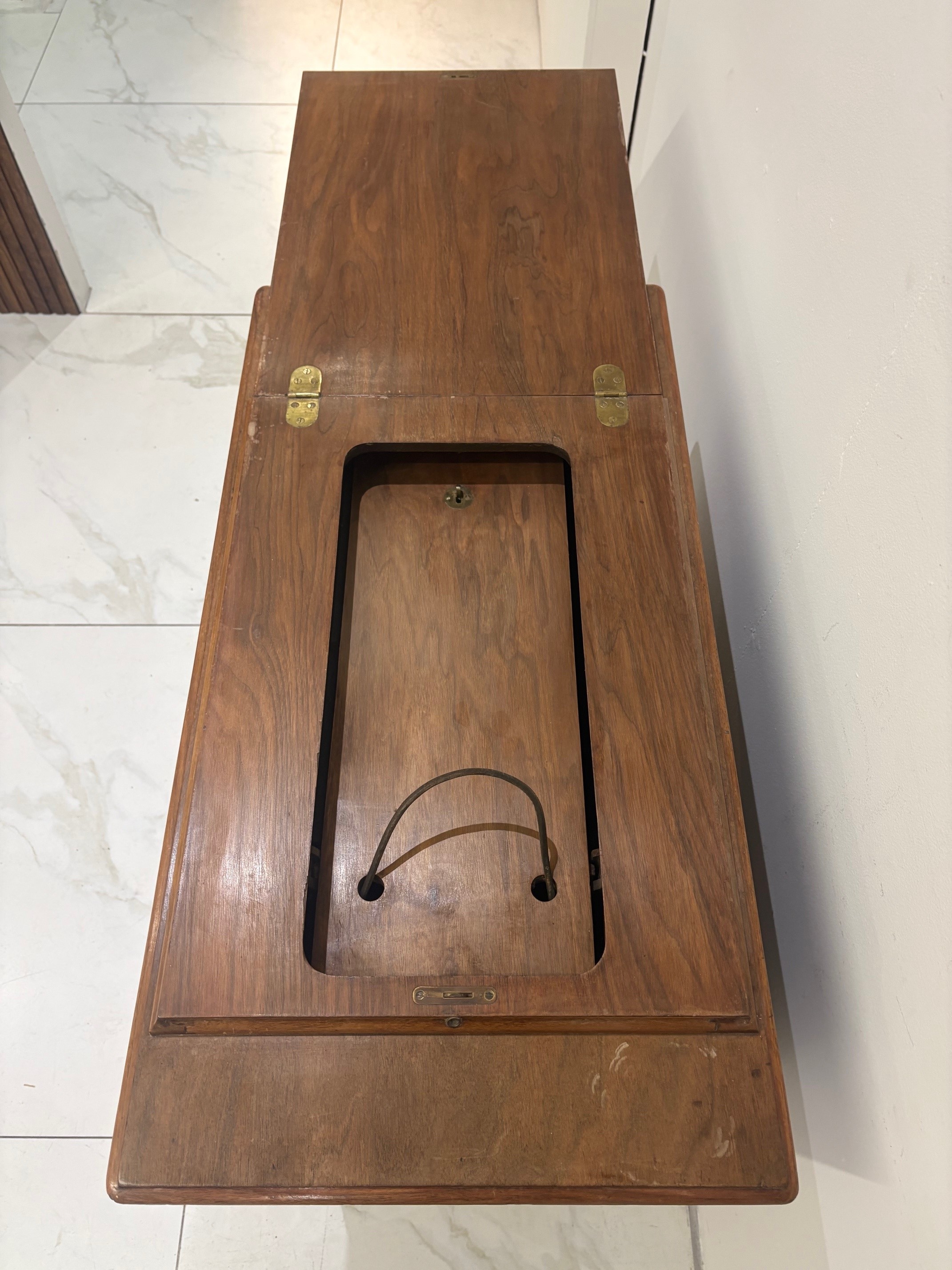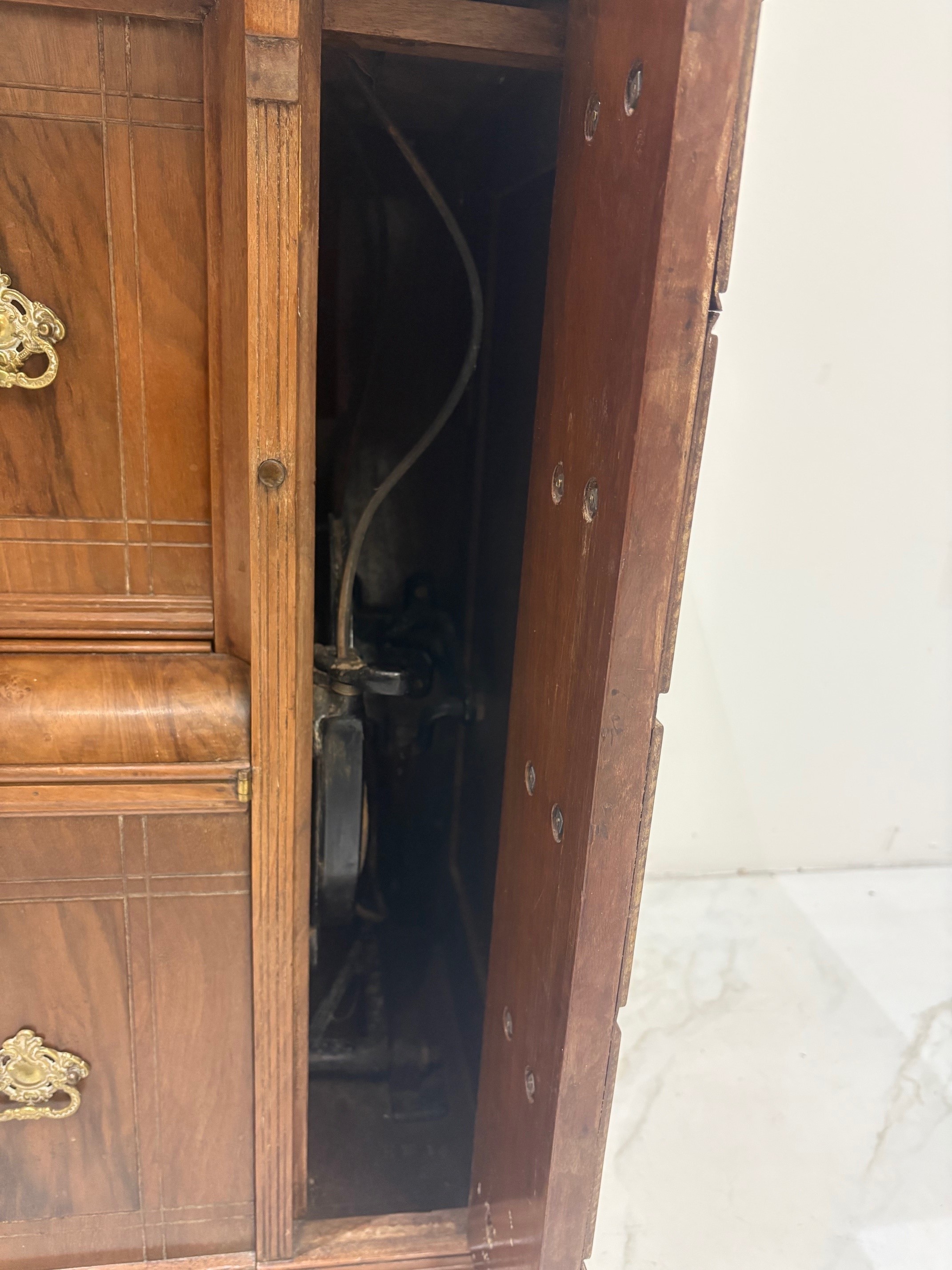 Antique Walnut Singer Sewing Machine Cabinet with rise and fall mechanism.