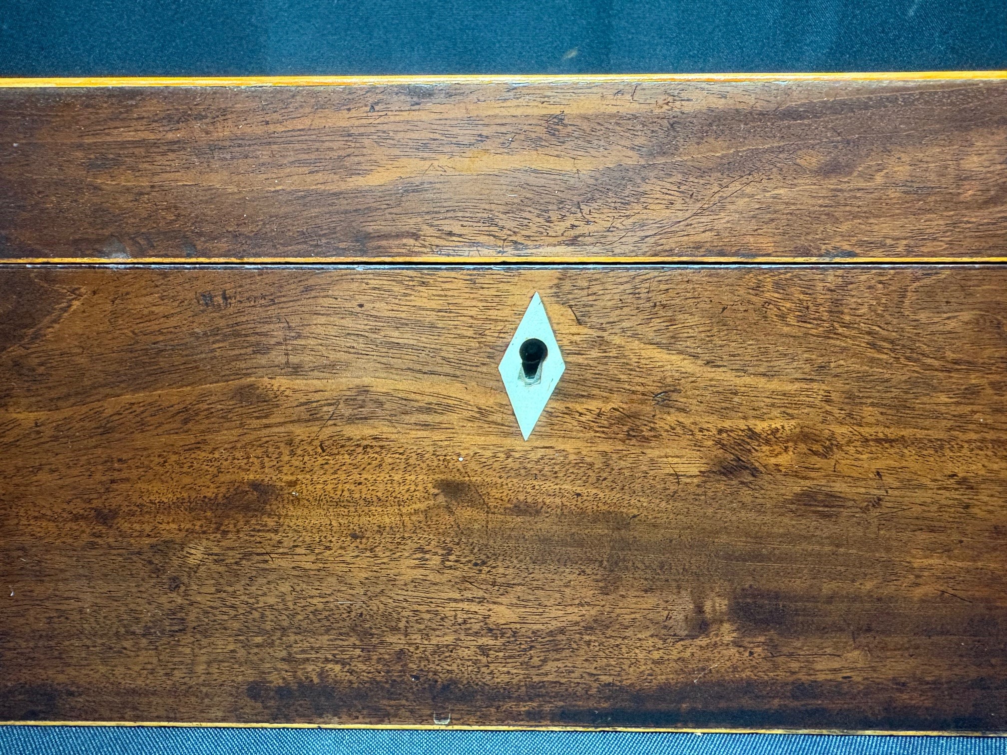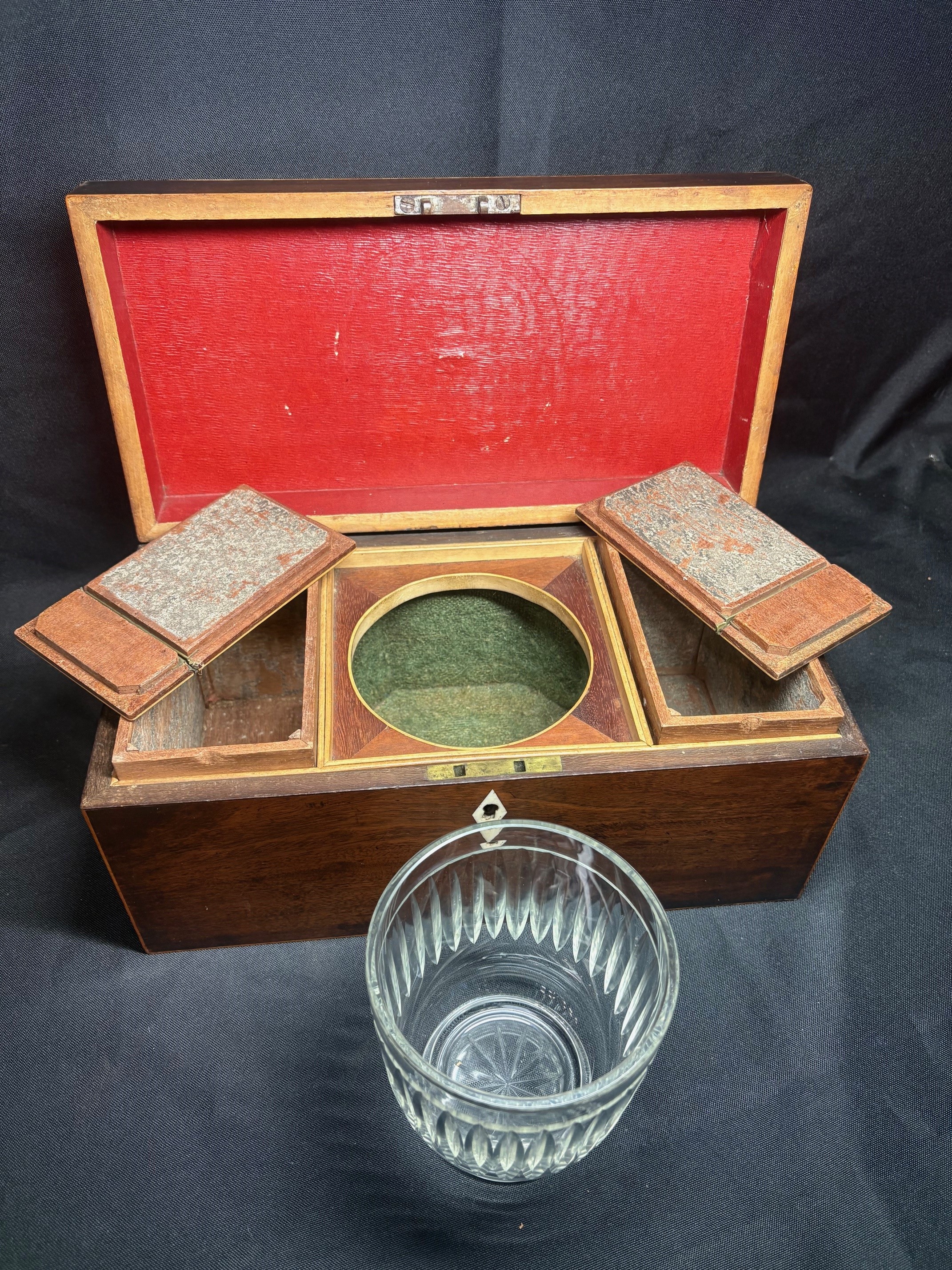 19th century rosewood tea caddy complete with two internal compartments with lids for different types of tea and the cut glass tea mixing bowl.