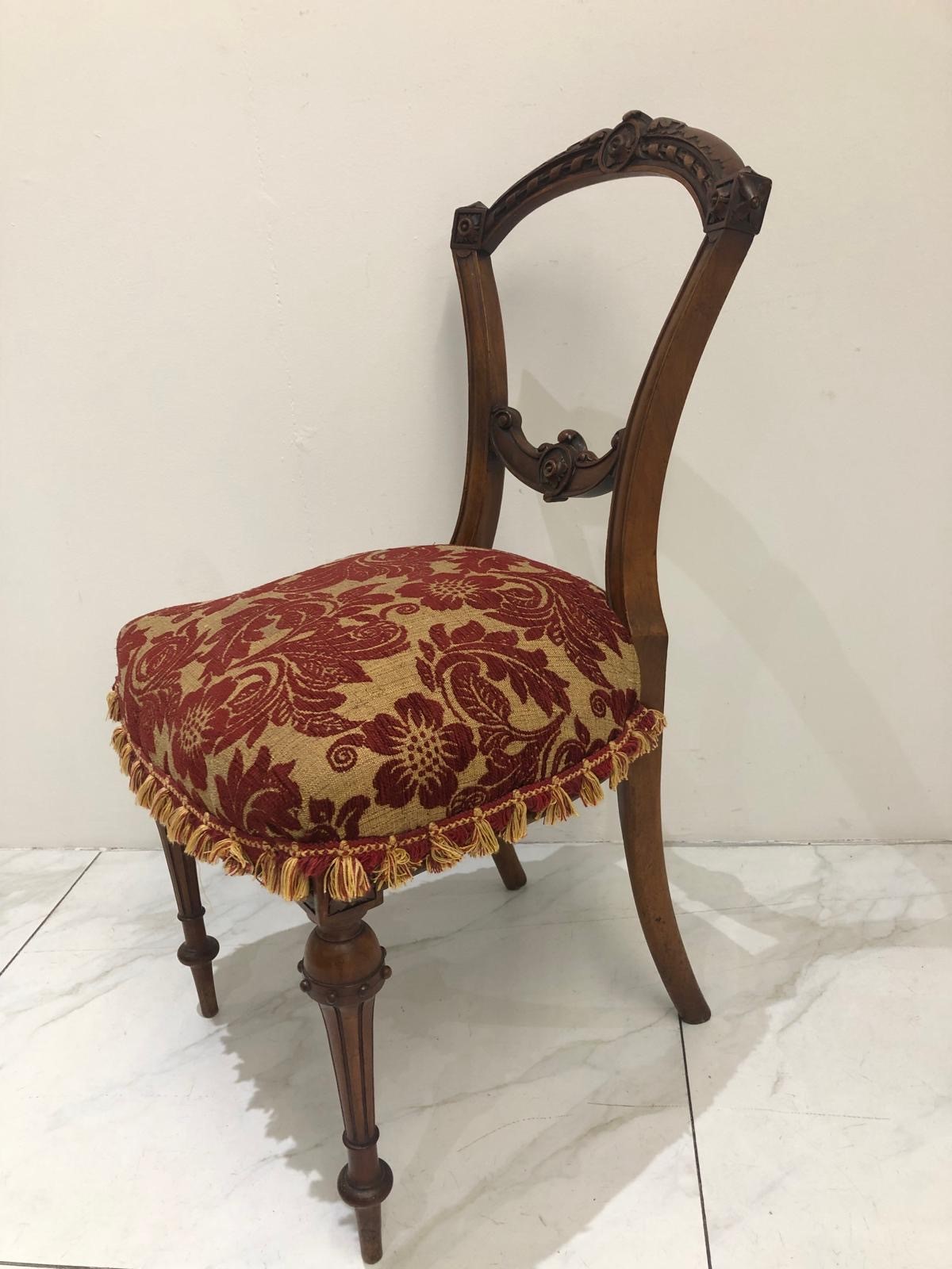 Antique Victorian ladies chair in walnut with considerable carved detail afforded to the legs and back . Finished in a red golden fabric adorned with tassels.
