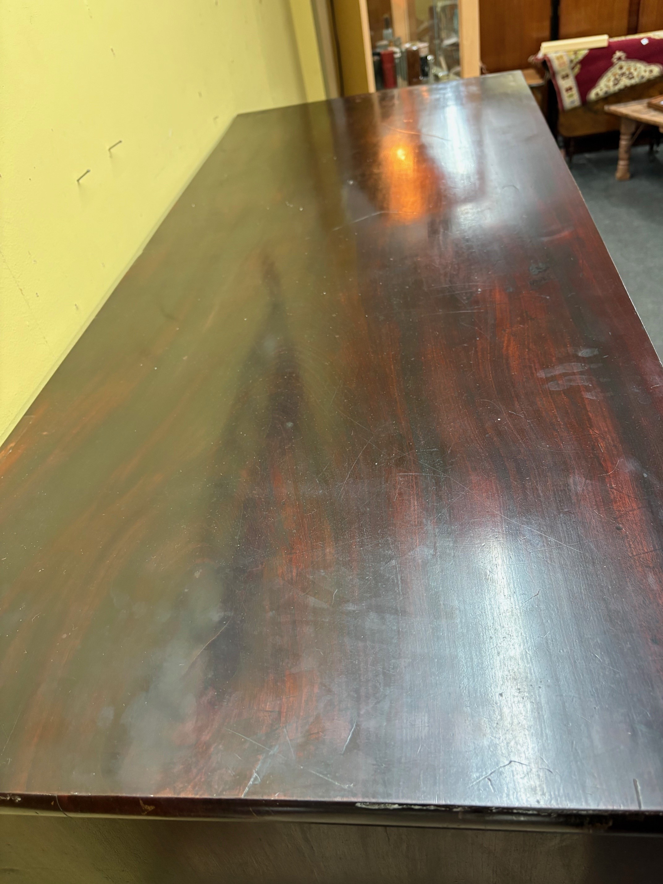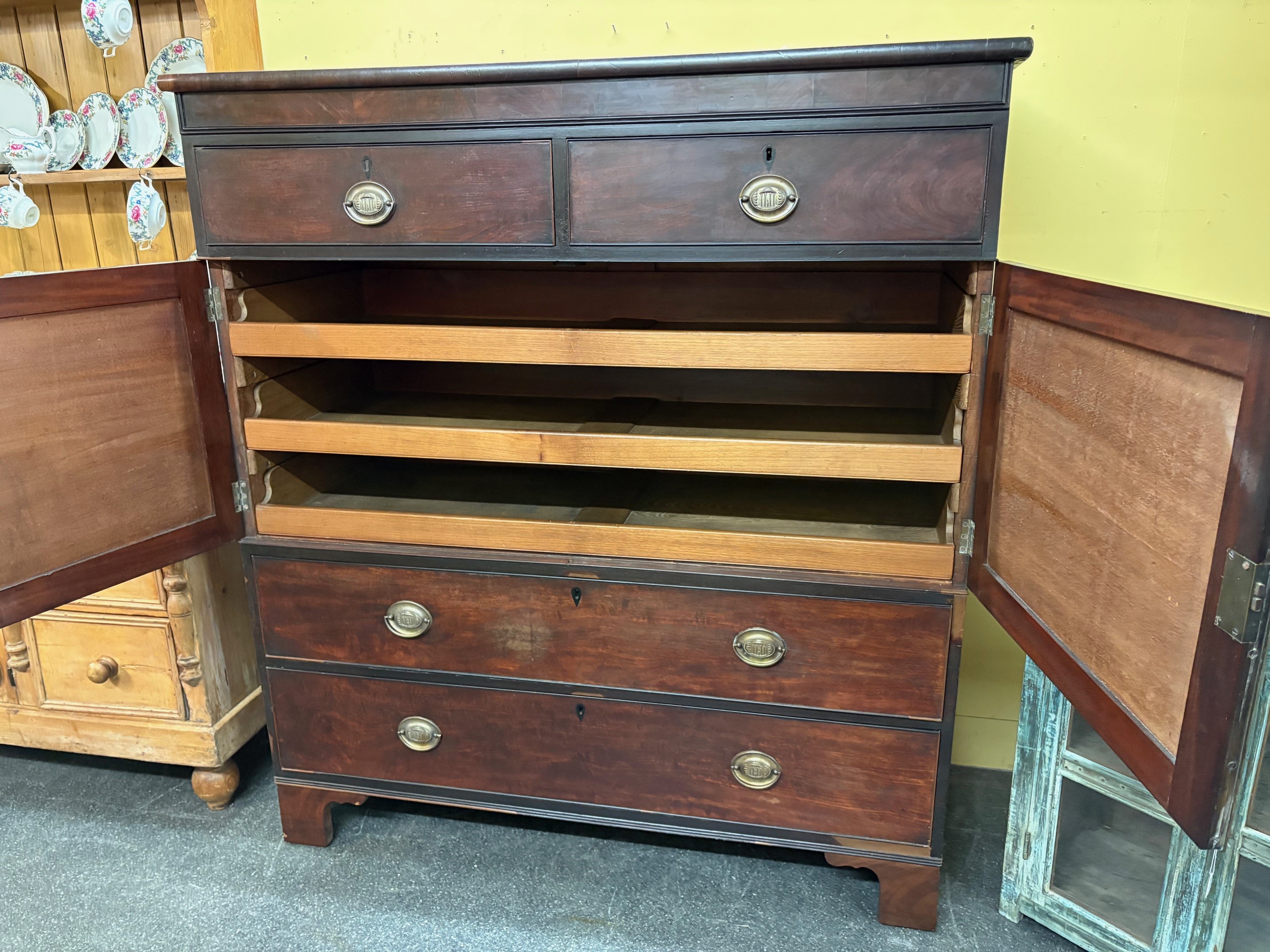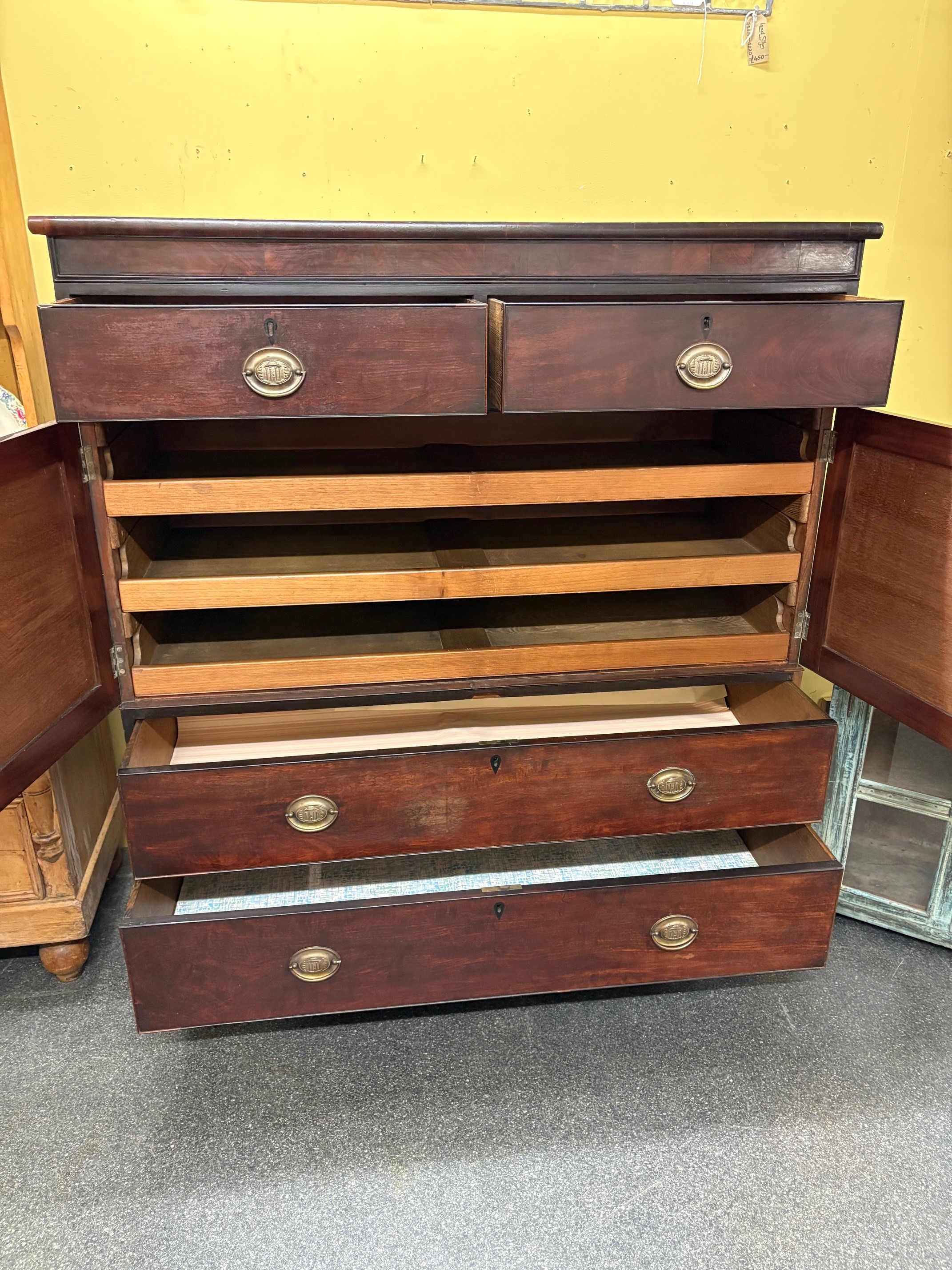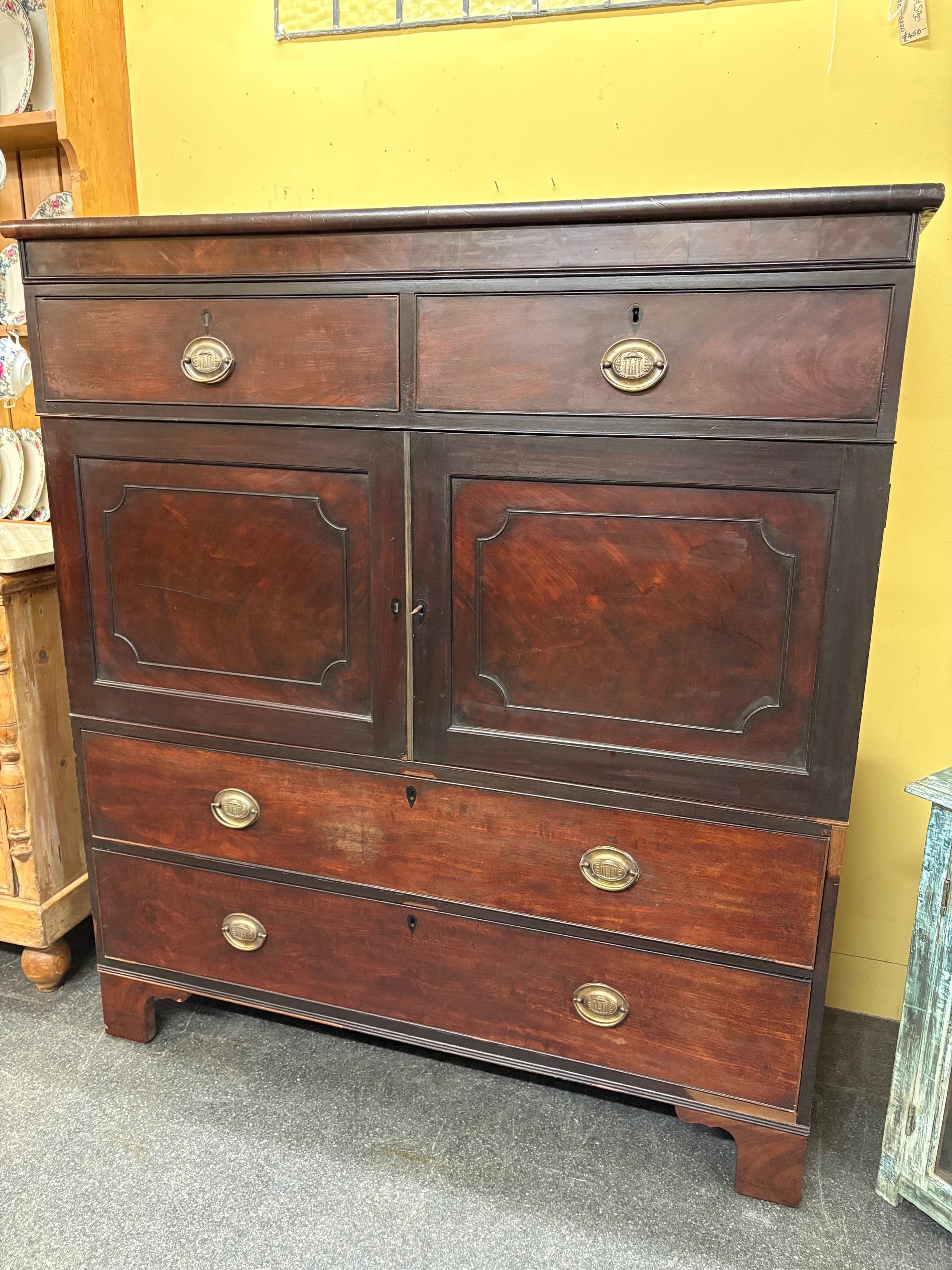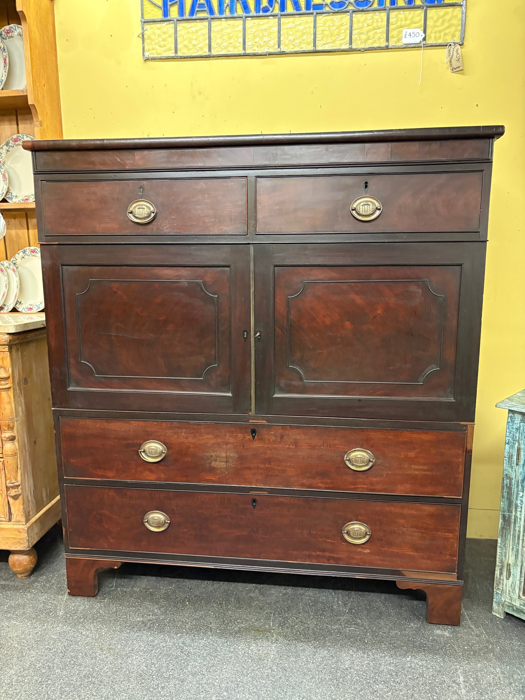 Antique English flame mahogany George III rare linen press/drawers. A substantial piece of furniture, unusually with two small drawers above twin opening doors to reveal three slide out press drawers , above two large lower drawers.