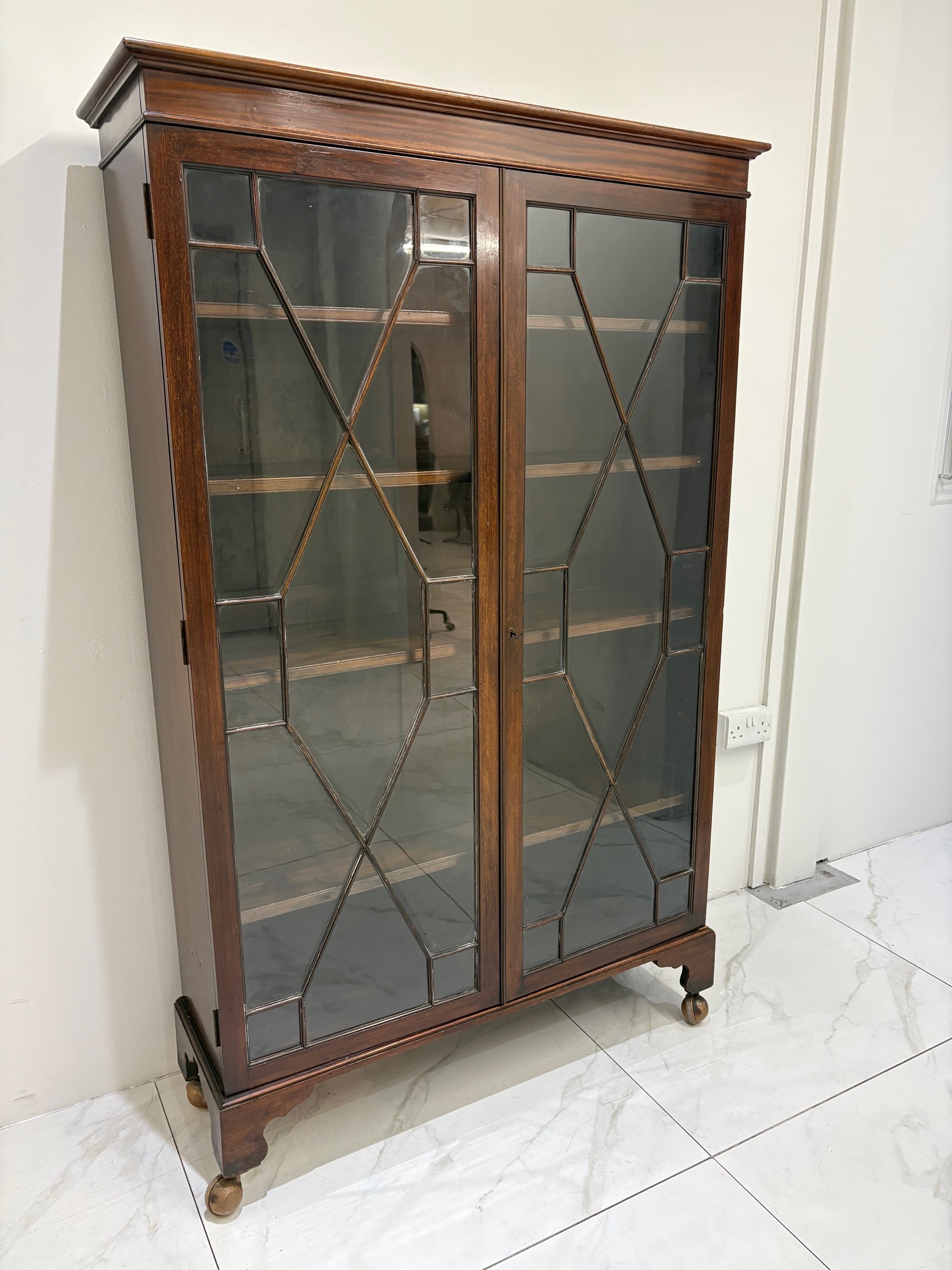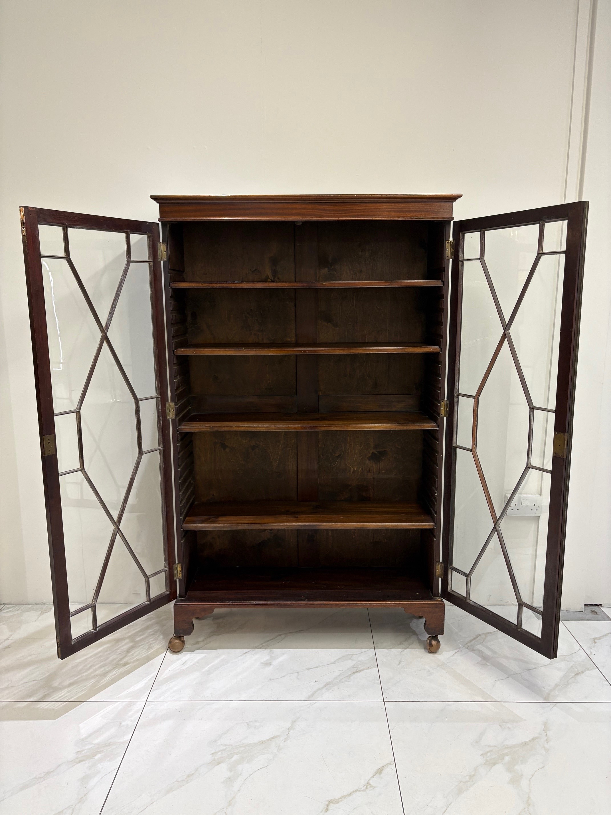 Elegant Antique Georgian or Early Victorian decorative astral glazed bookcase. Geometric patterns adorn two large glazed doors opening to four substantial shelves.