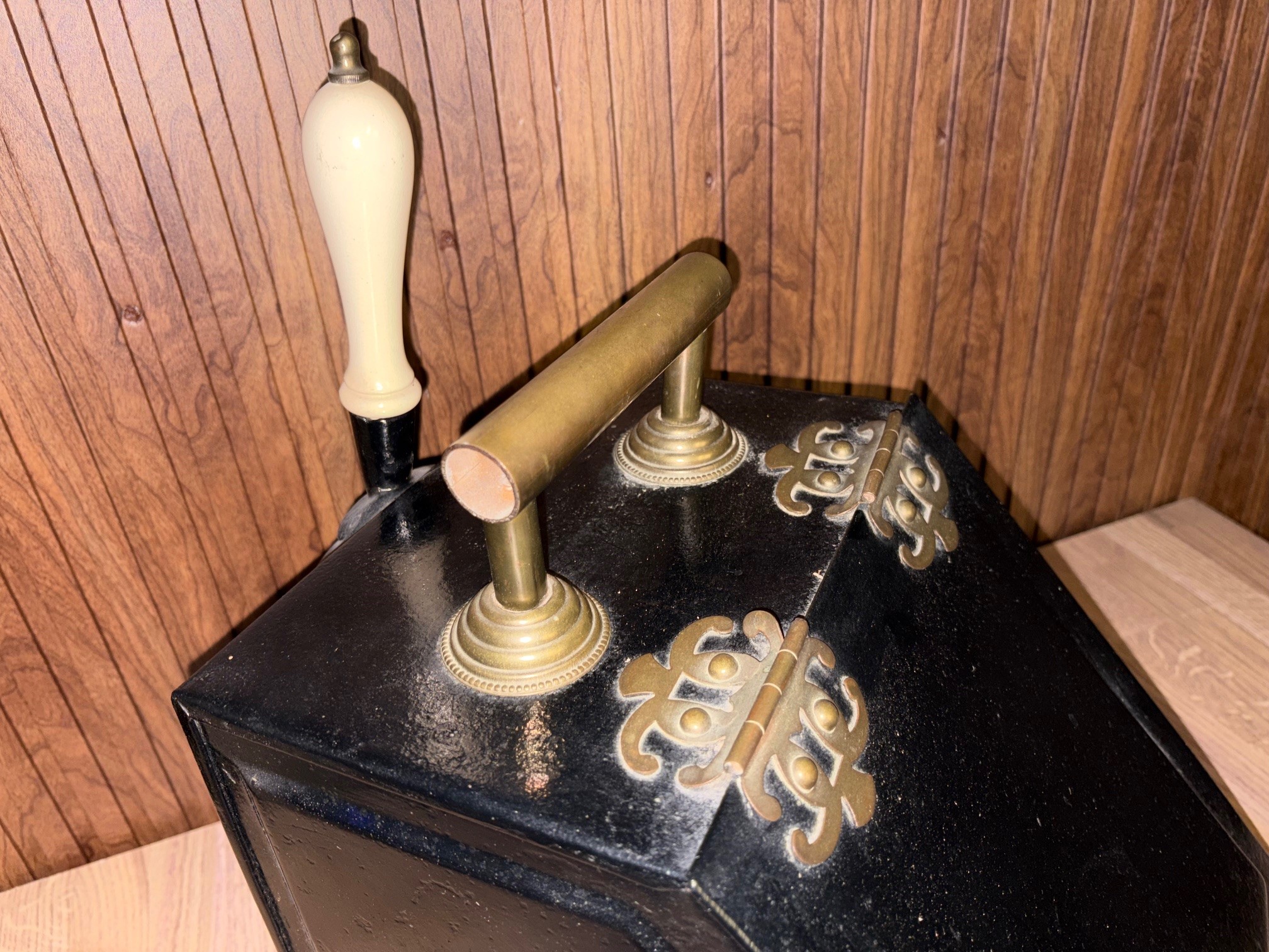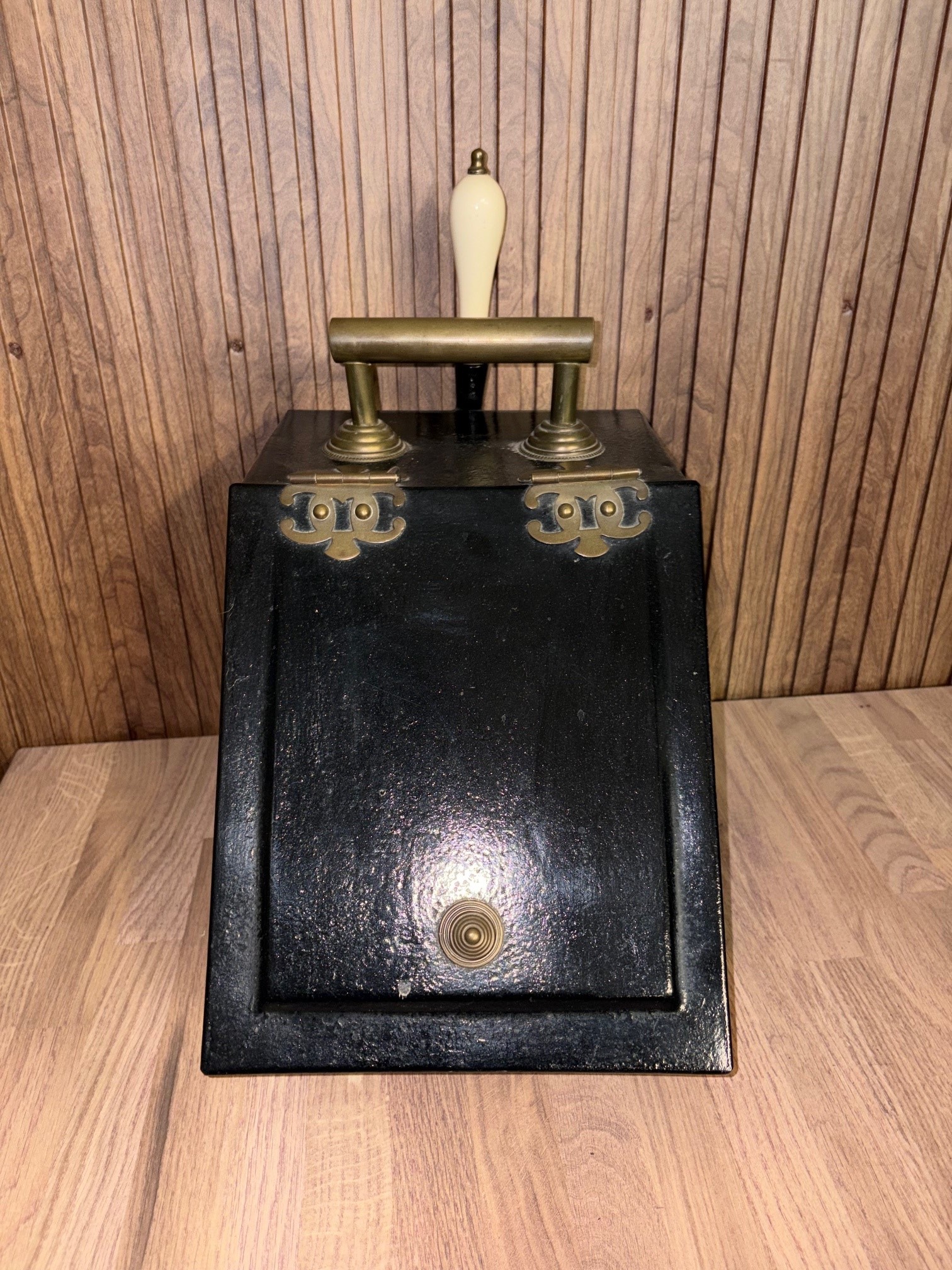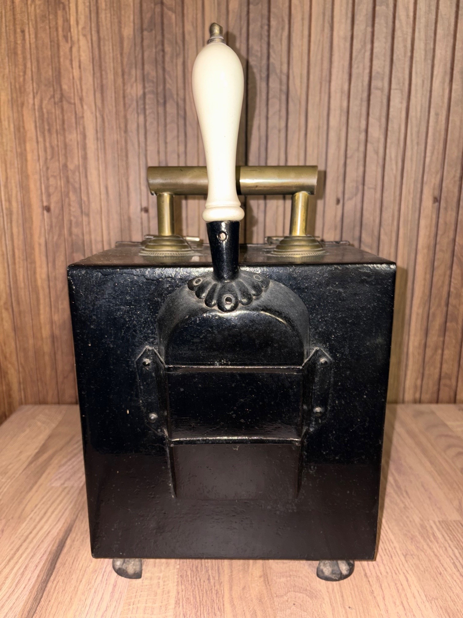 Antique coal scuttle with original shovel, decorative metal feet, brass carrying handle and inner metal sleeve - VIN1225Z