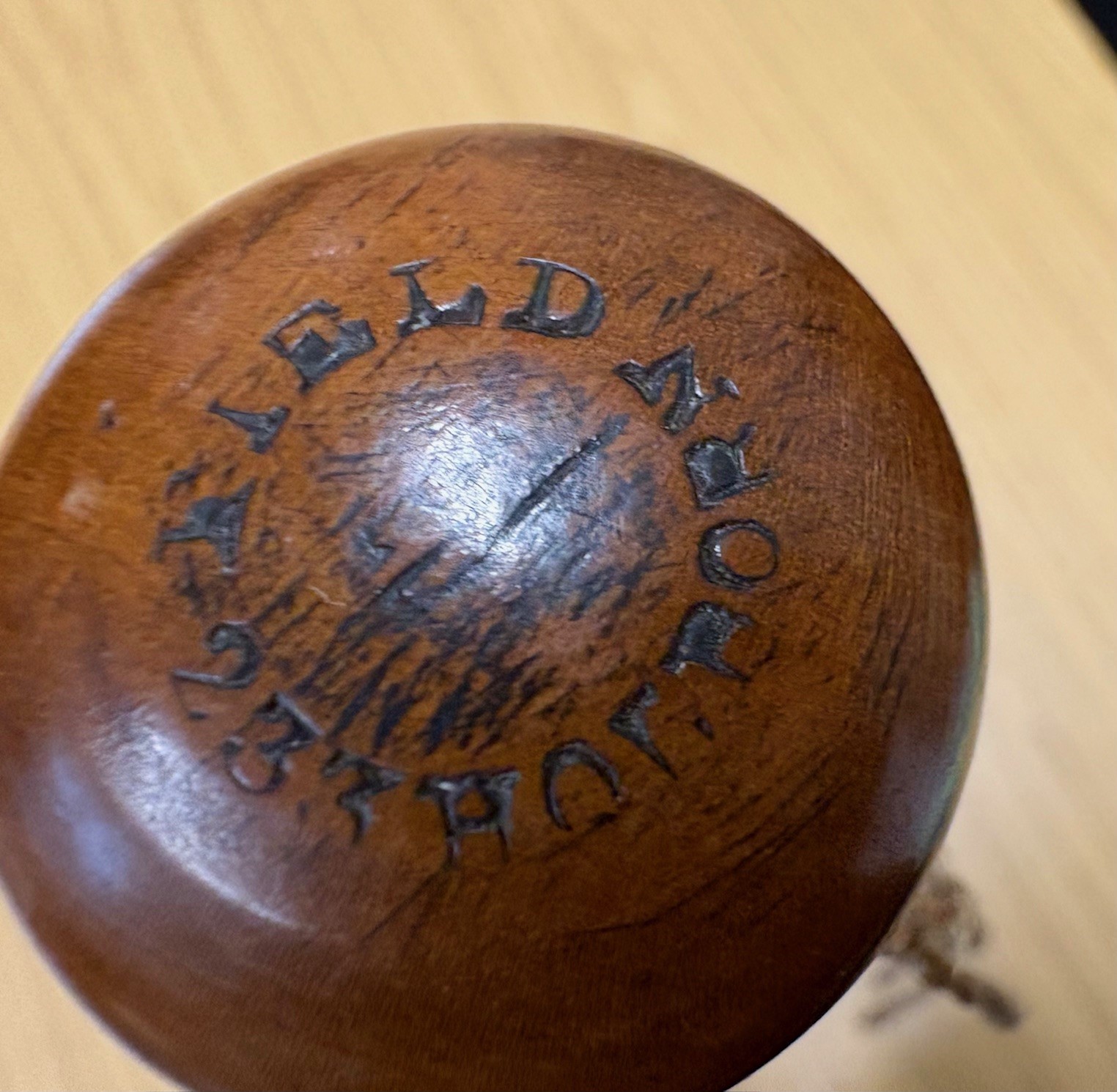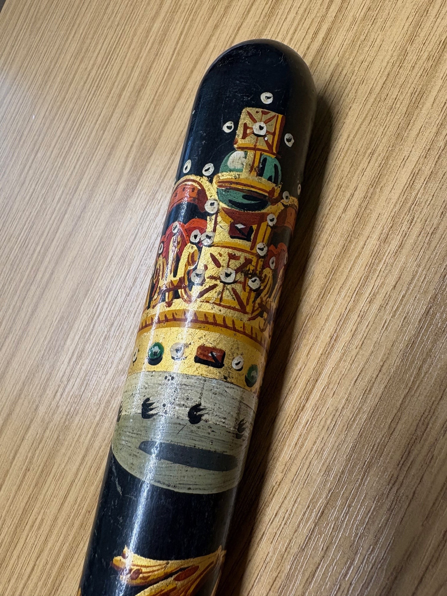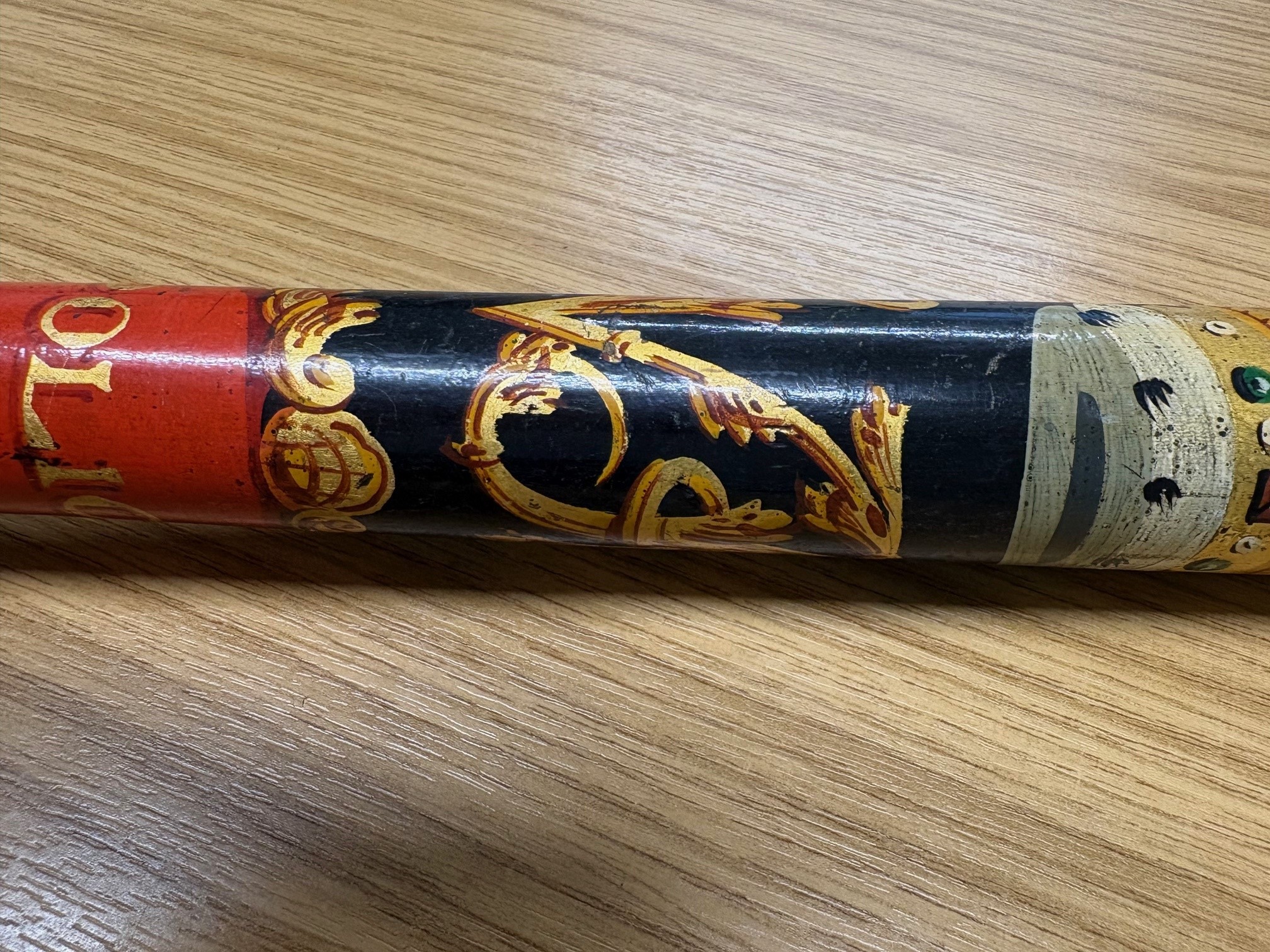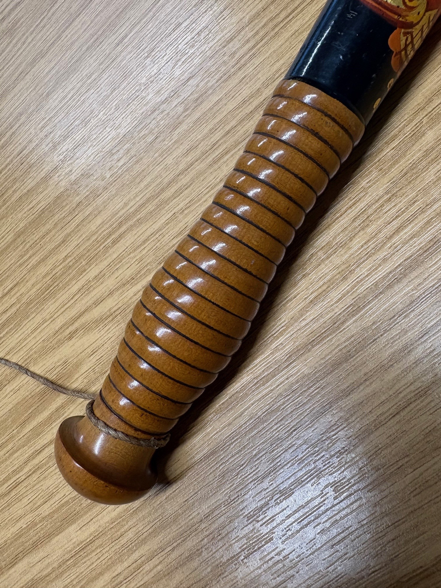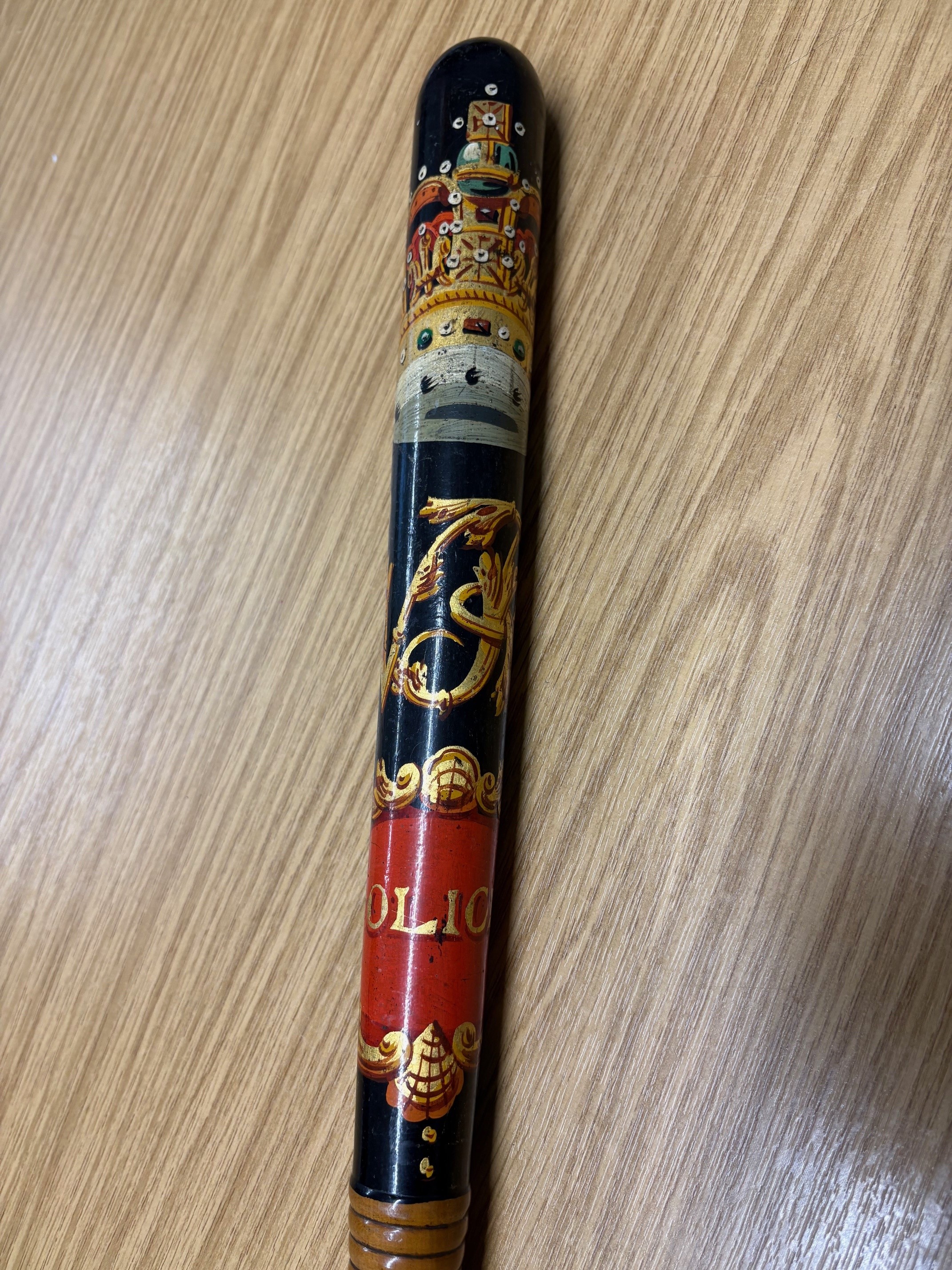 Original 19th century Victorian police truncheon. Stamped on the handle is “Field (the maker) 233 Holborn (the address). Victorian police truncheons were commonly hand painted in colours red, gold, blue to signified the monarch’s authority and also helped identify each police officer and constabulary and the degree of different painted designs is vast.