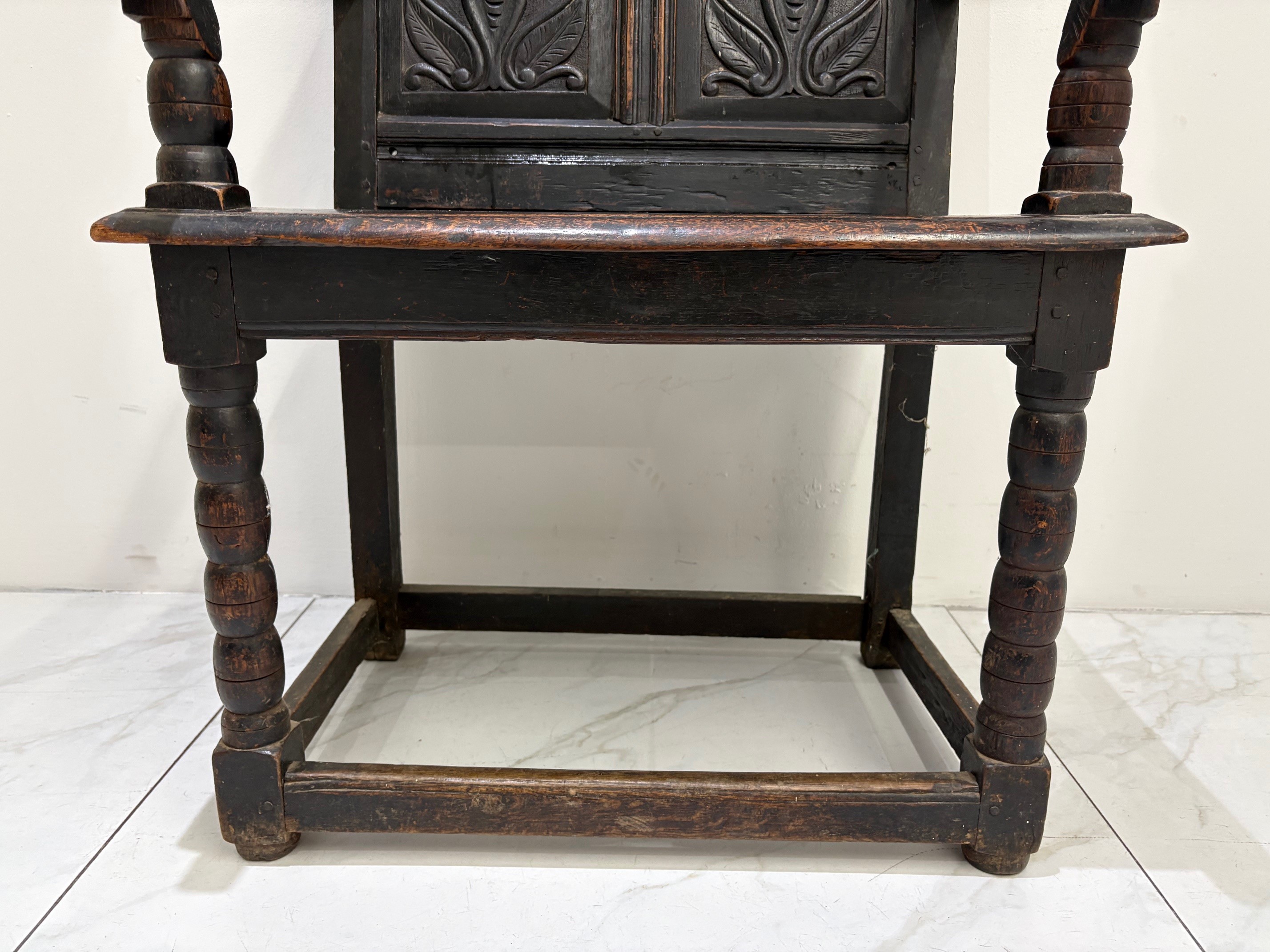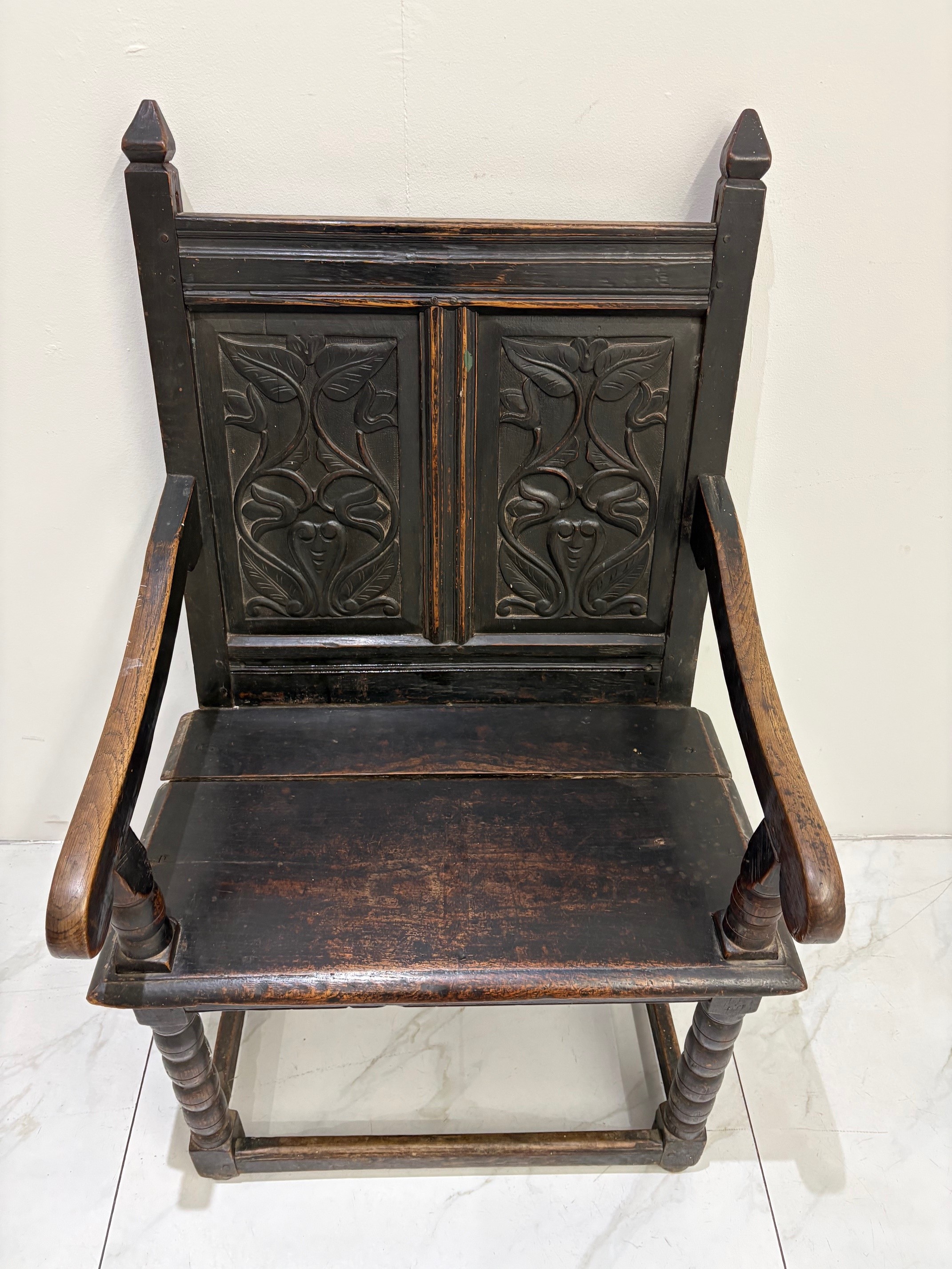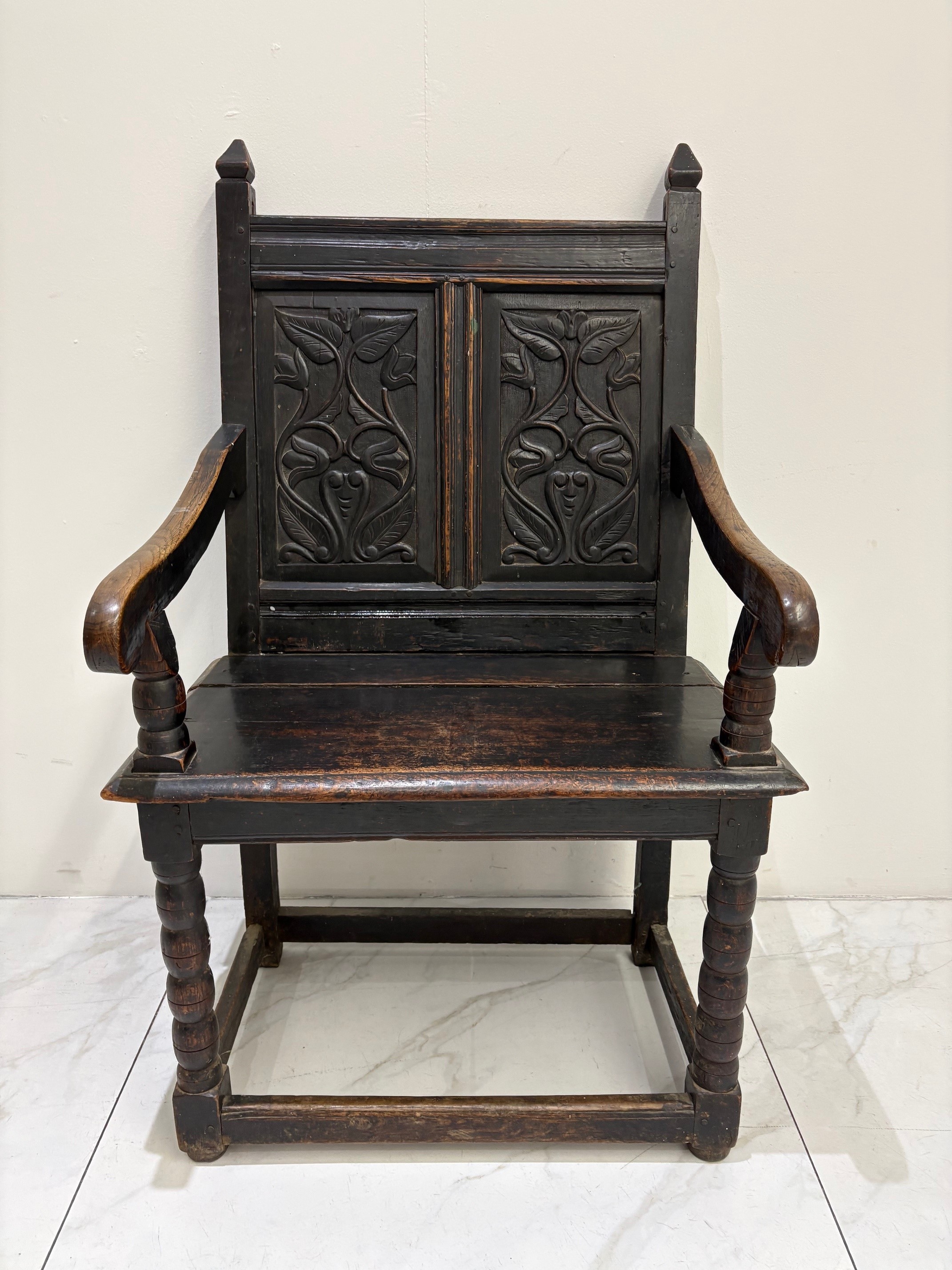 Fine example of an original oak Wainscot chair, probably 18th century. The plain oak panelled seat contrasts with the finely carved solid oak panelled back. Sweeping arms are secured by turned supports running down through the seat to the base where four straight stretchers form the typical characteristics of this fabulous original antique early chair.