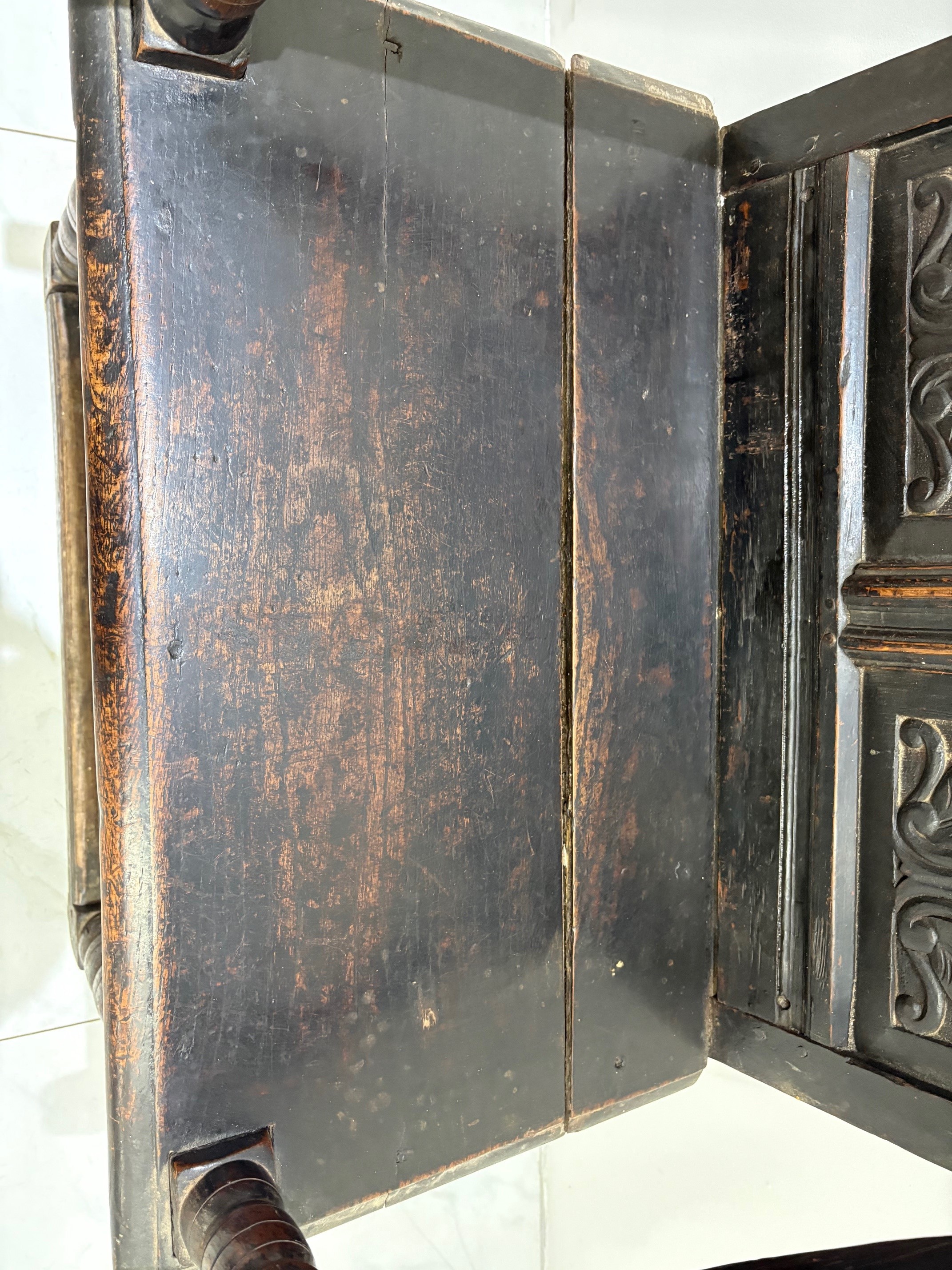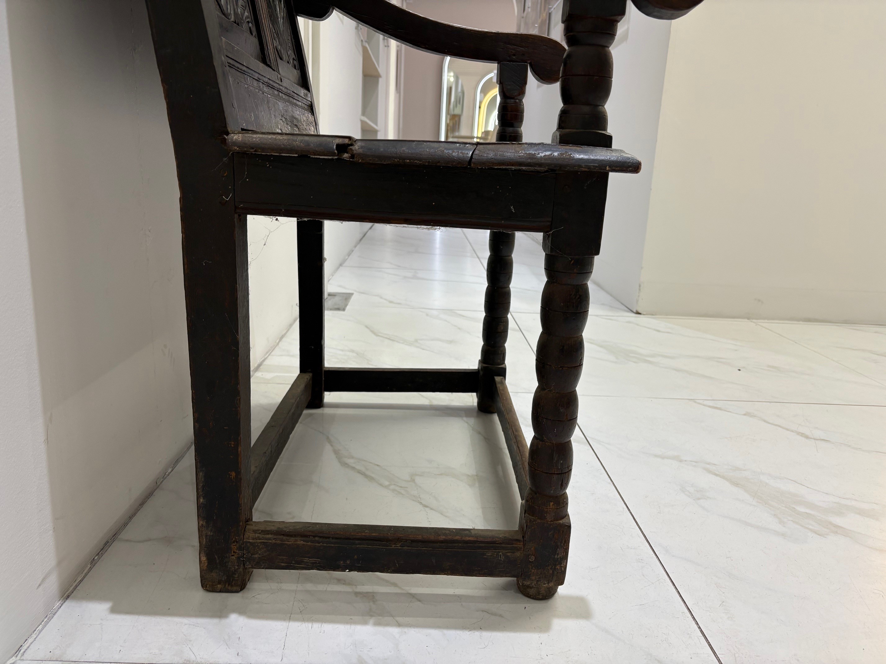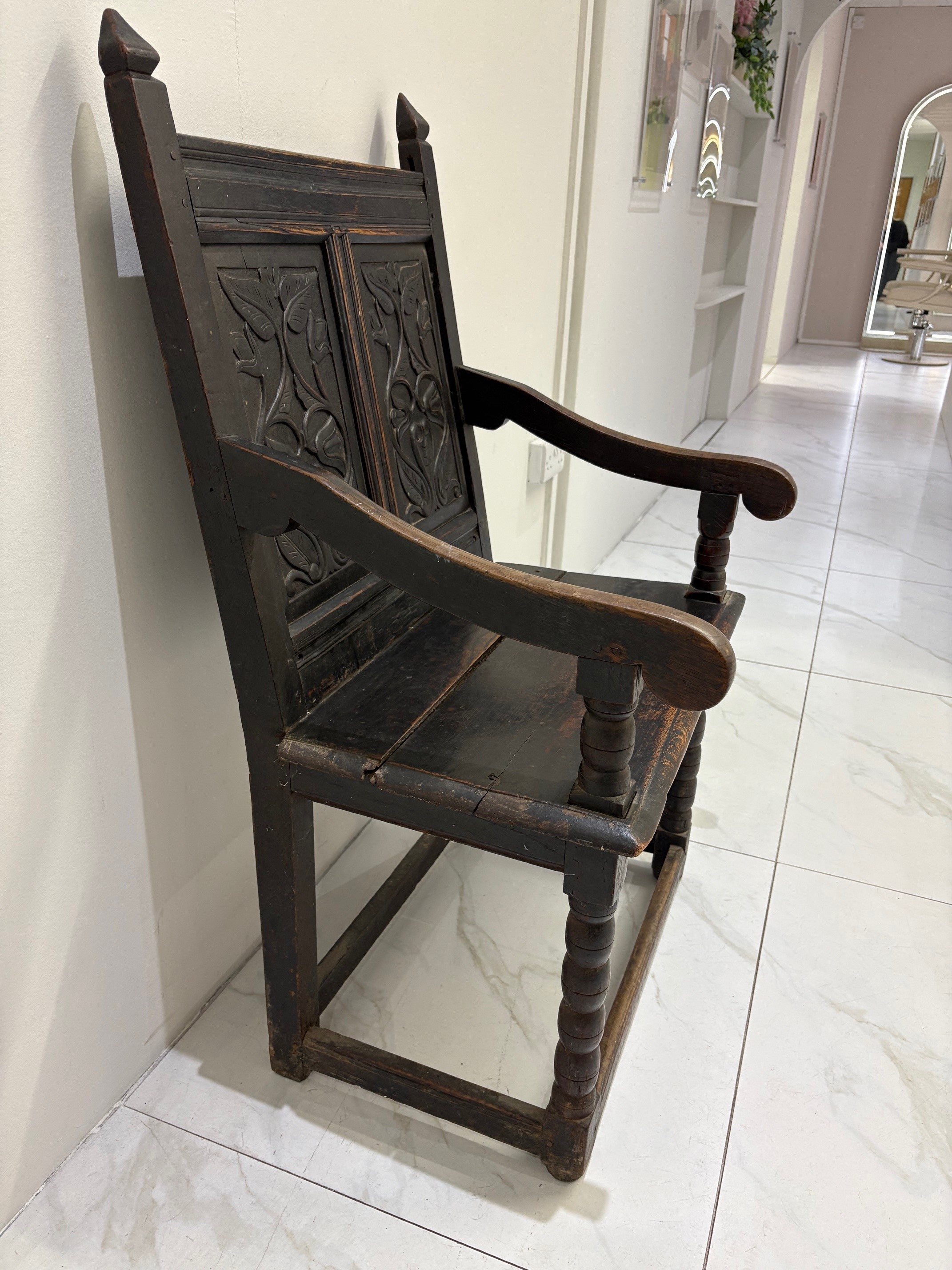 Fine example of an original oak Wainscot chair, probably 18th century. The plain oak panelled seat contrasts with the finely carved solid oak panelled back. Sweeping arms are secured by turned supports running down through the seat to the base where four straight stretchers form the typical characteristics of this fabulous original antique early chair.