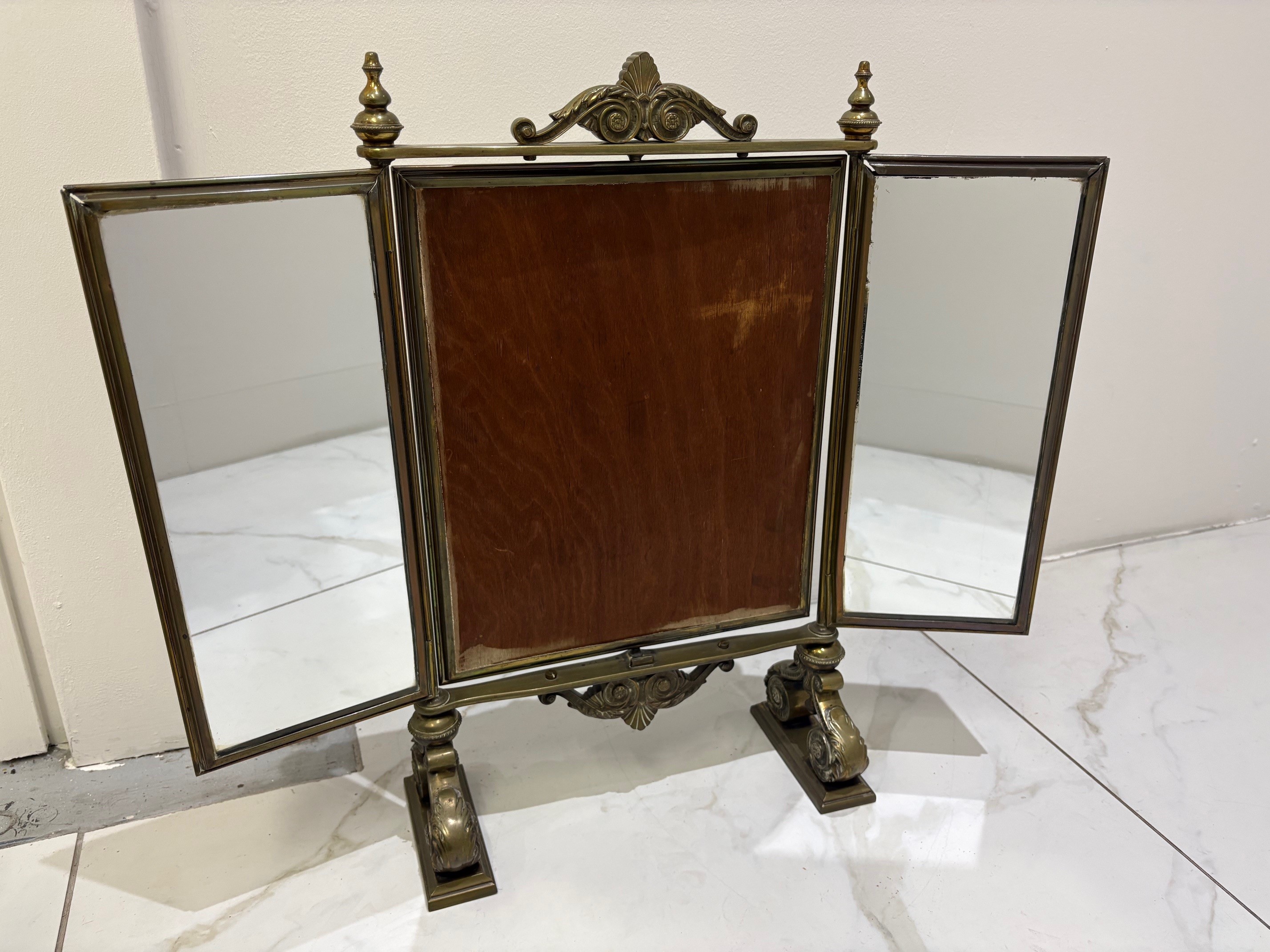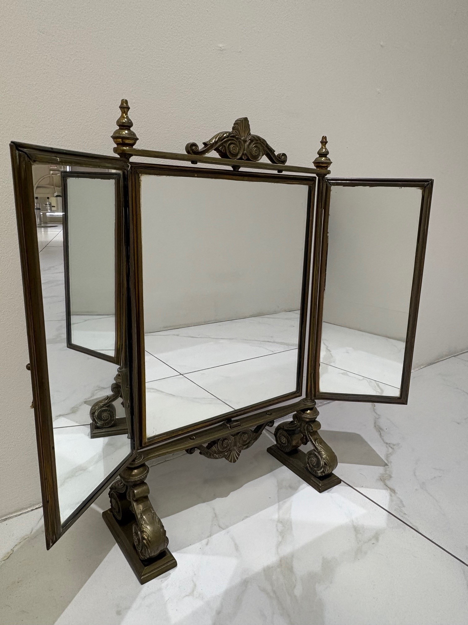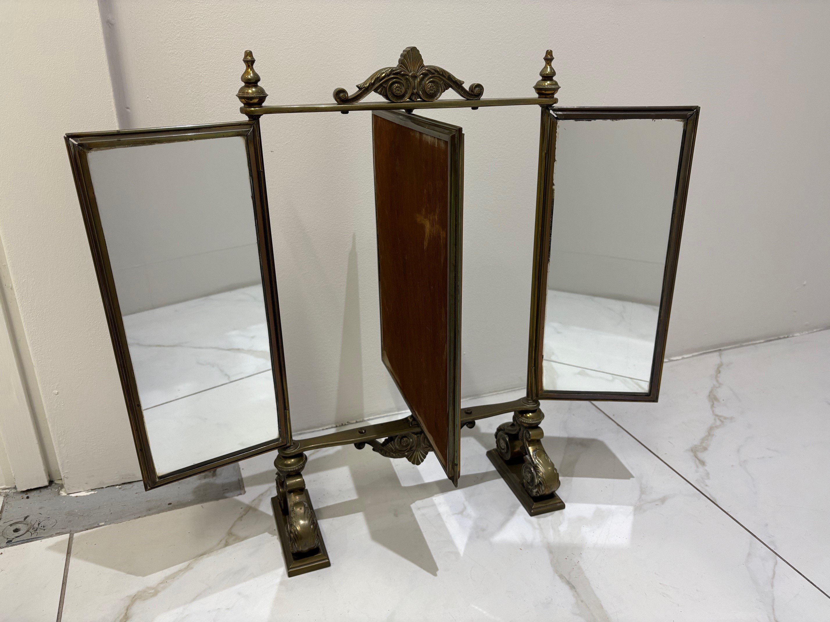 Beautiful Antique 3 panel dressing table mirror with ornate brass frame and decorative scrolls.