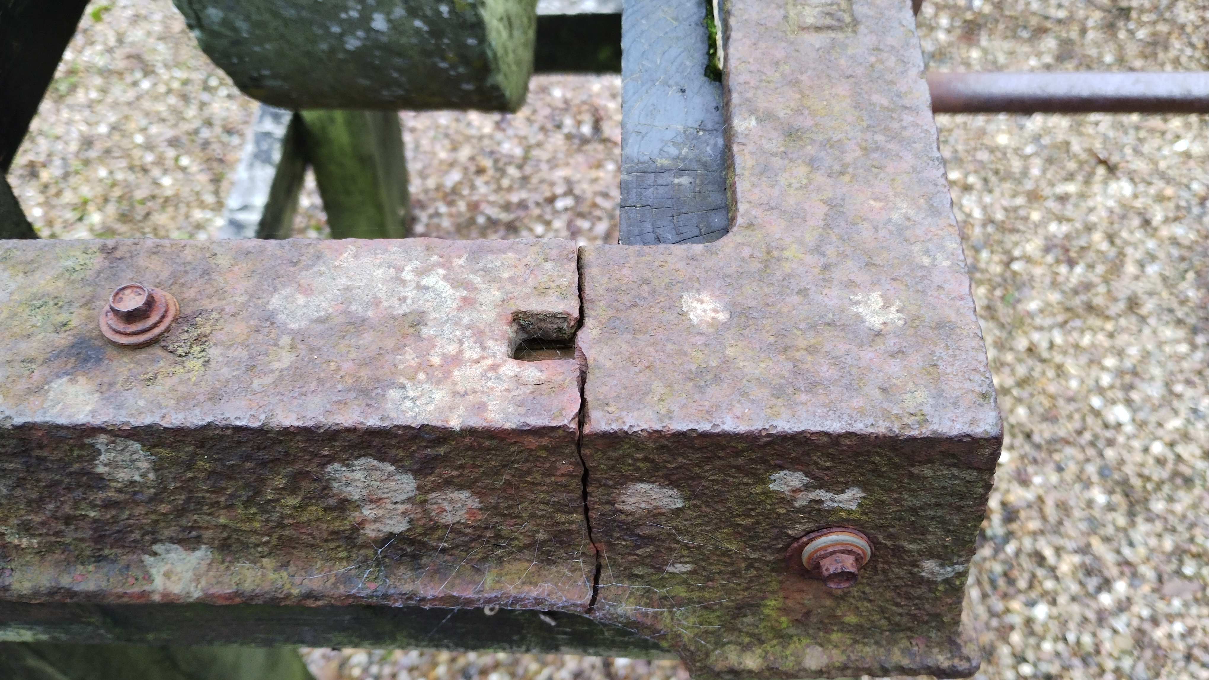The large stone wheel (51cm diameter by 13cm) is mounted on a cast iron frame supported on a sturdy wooden support. Please see photograph of the crack in the iron frame