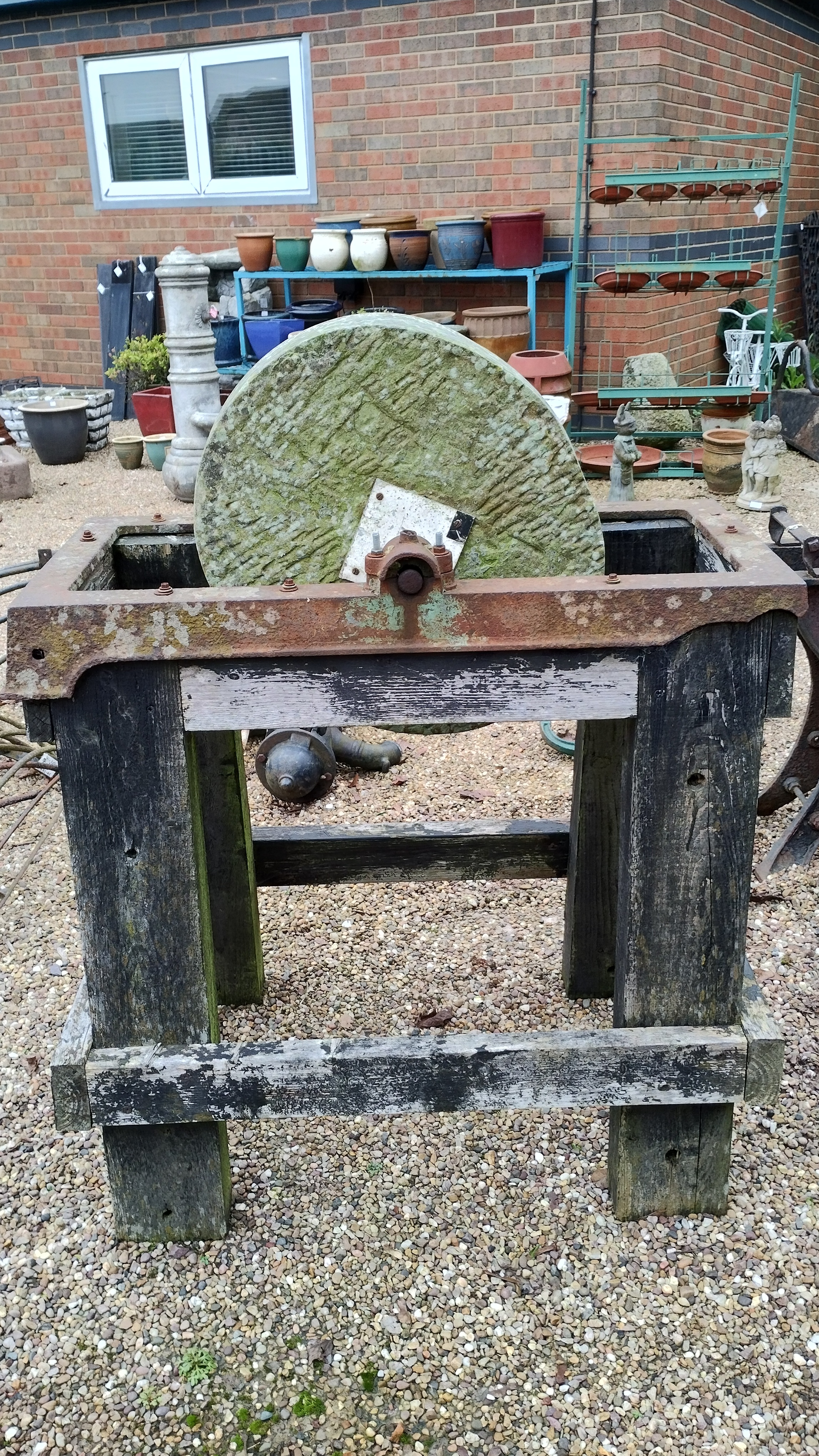 The large stone wheel (51cm diameter by 13cm) is mounted on a cast iron frame supported on a sturdy wooden support.