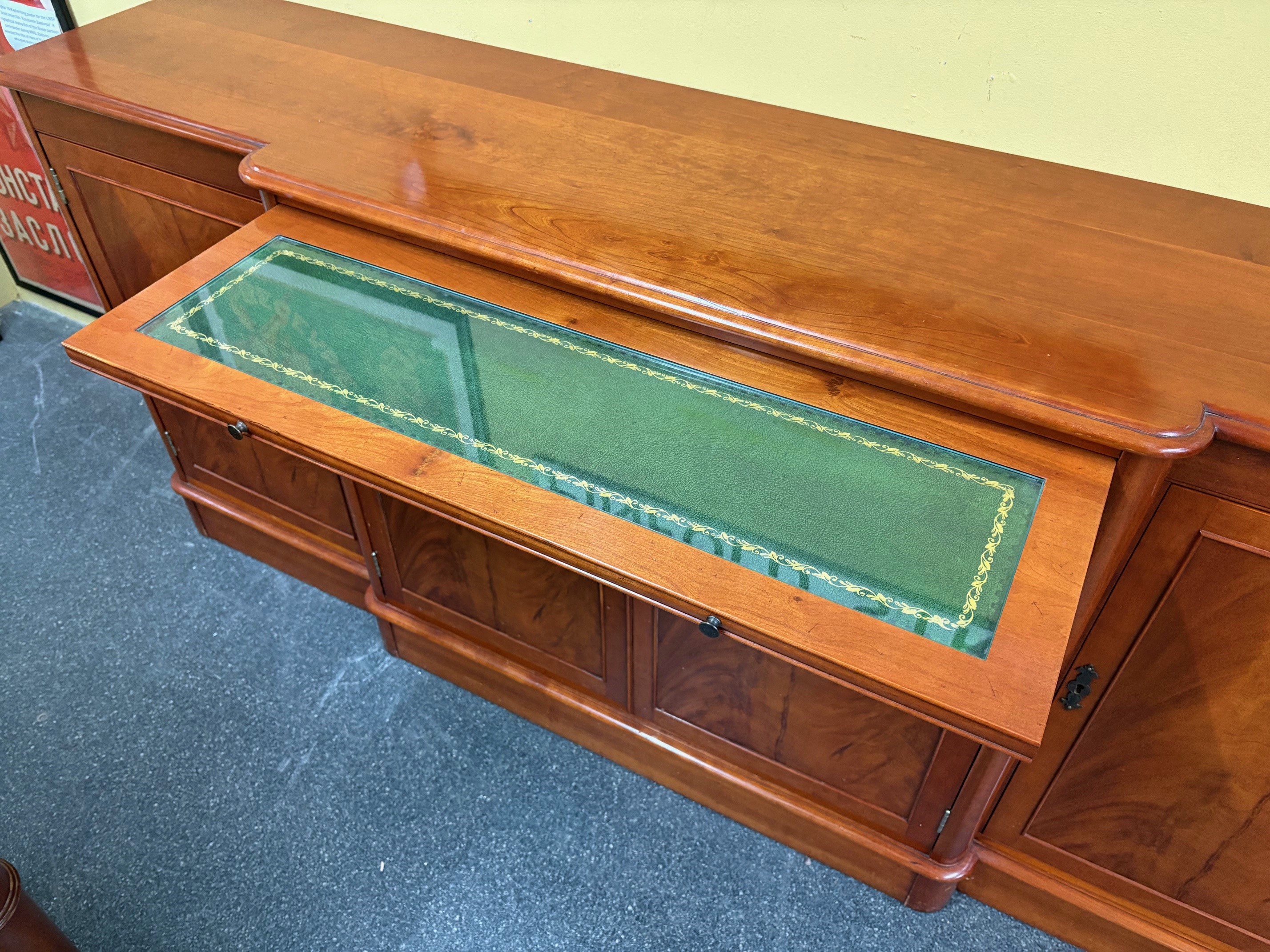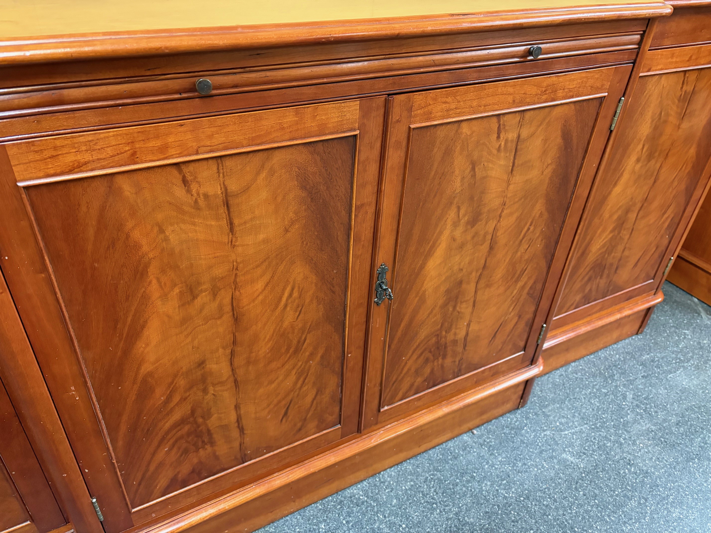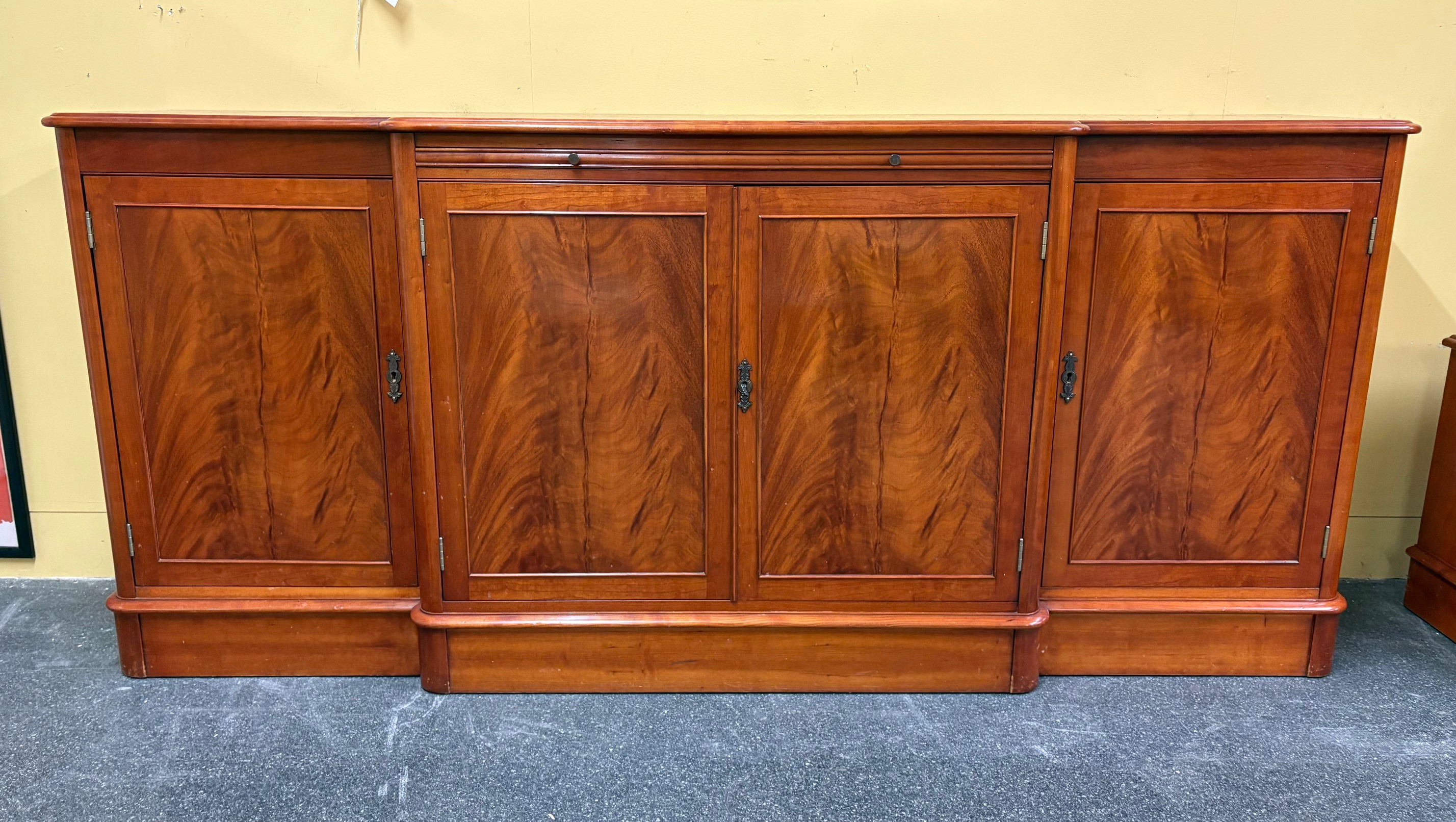 Reproduction Charles Barr Four Door Sideboard / Breakfast Cabinet featuring a breakfront design and flame mahogany panels. Internal shelving within the multiple cupboards along with internal central drawers and a pull out serving slide with inset green leather, topped with glass for protection.