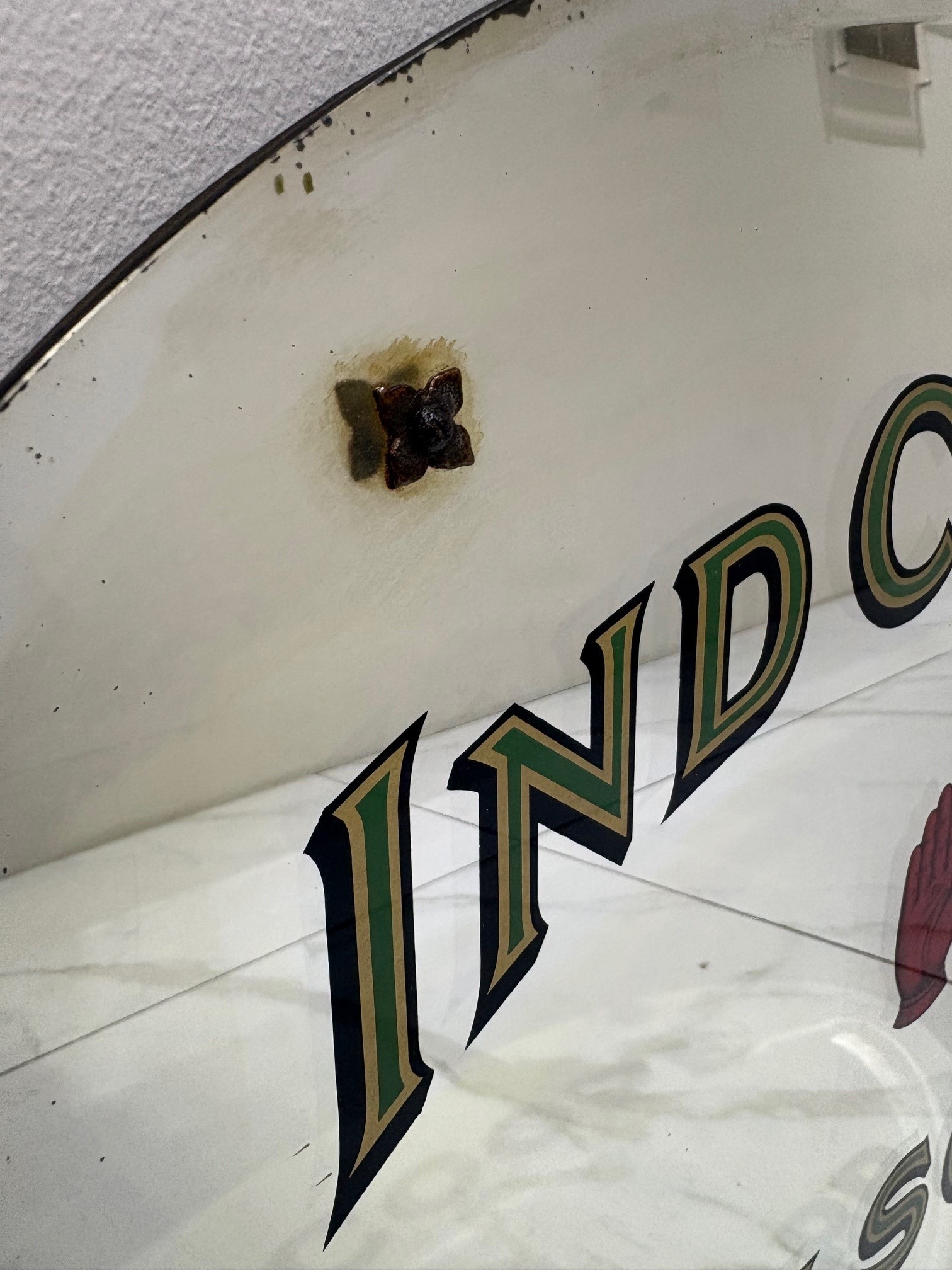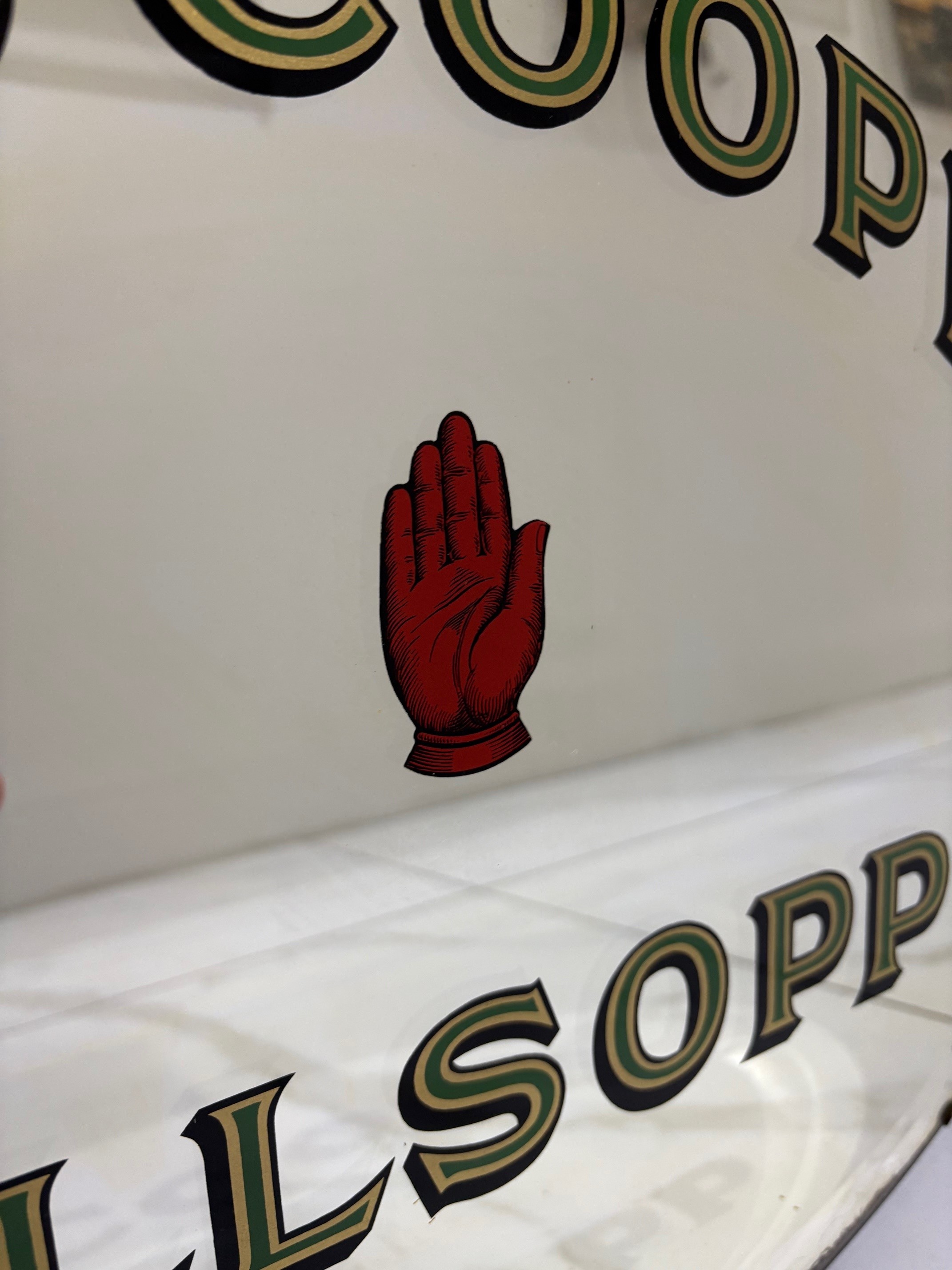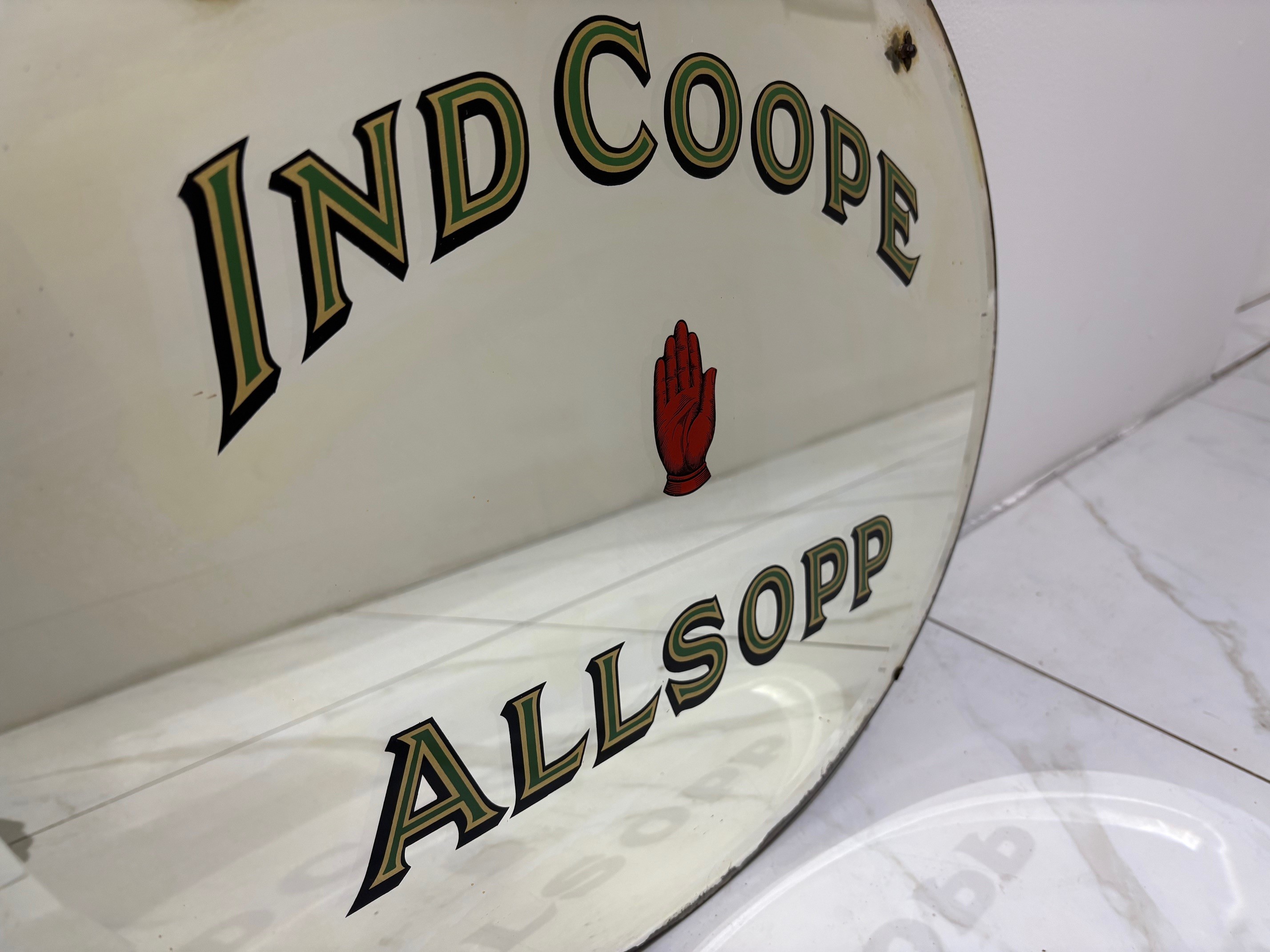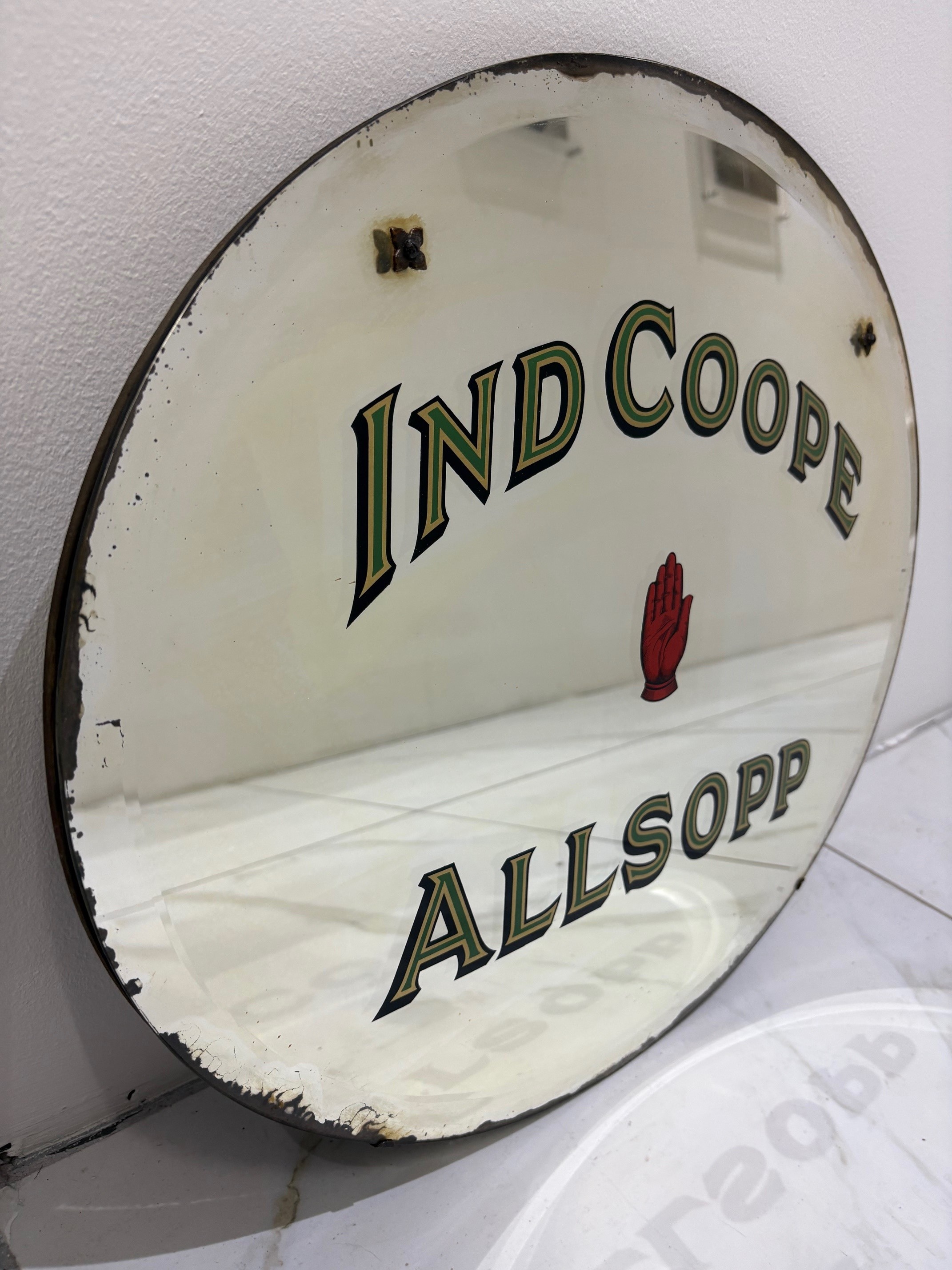Original 1930/40’s Ind Coope/Allsopp brewery advertising mirror. Allsopp was started in 1730 in Burton on Trent and merged with Ind Coope in 1934, eventually the name being phased out in the 1950’s after being one of the largest breweries in the Victorian period.