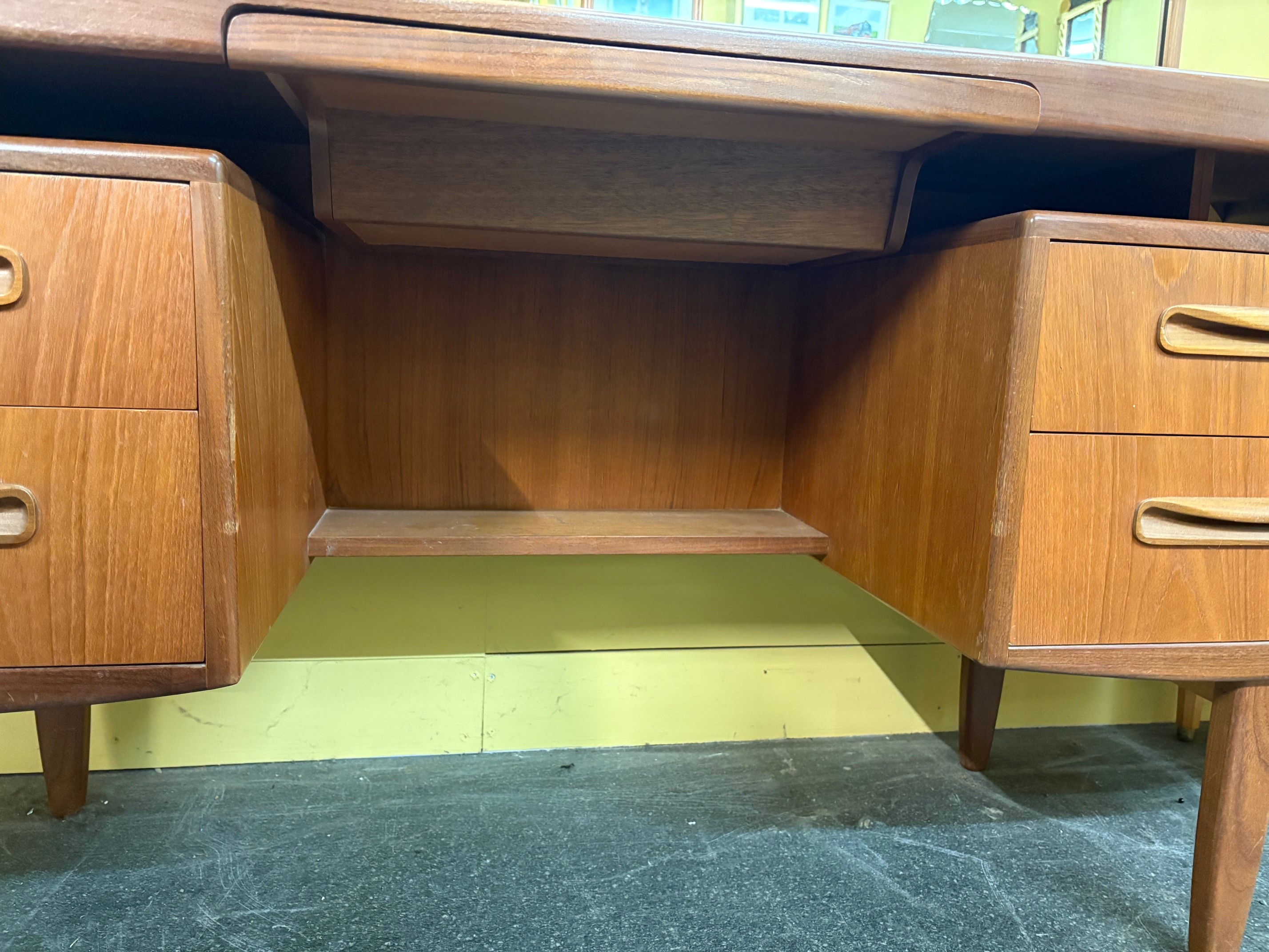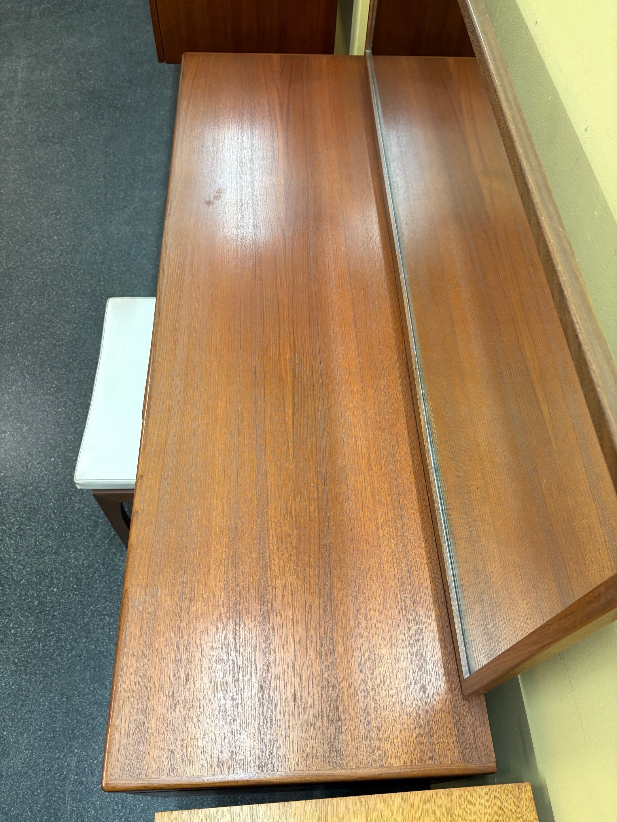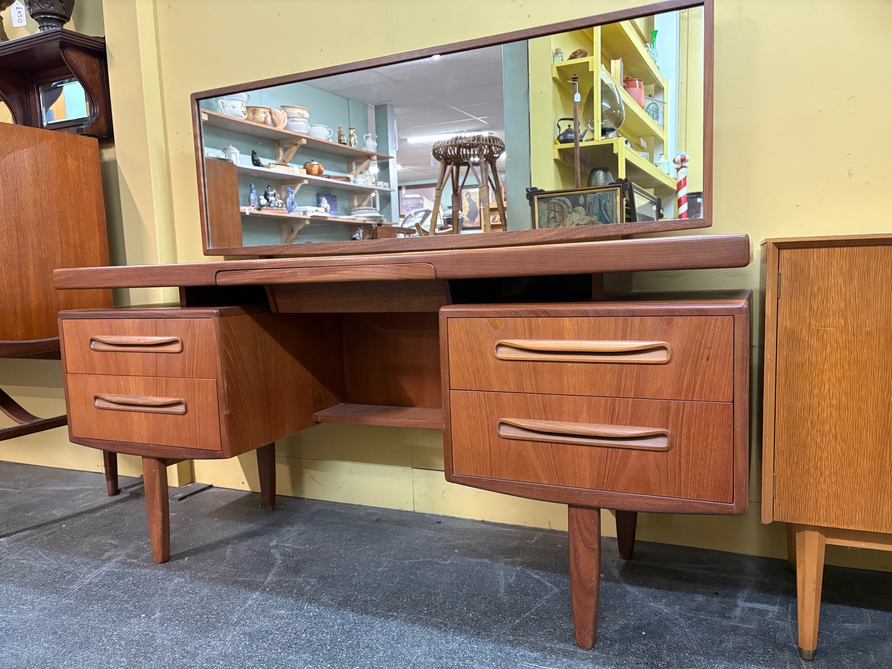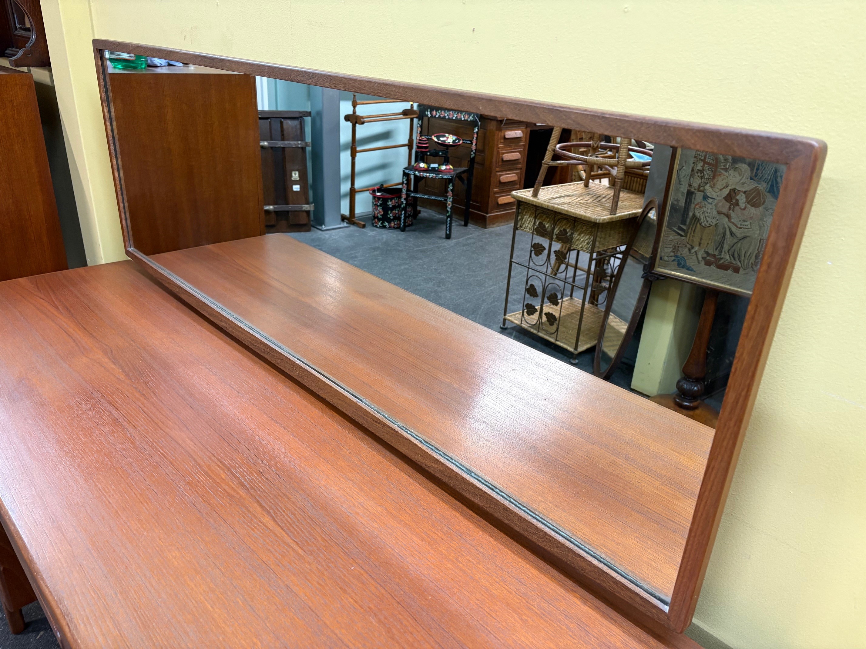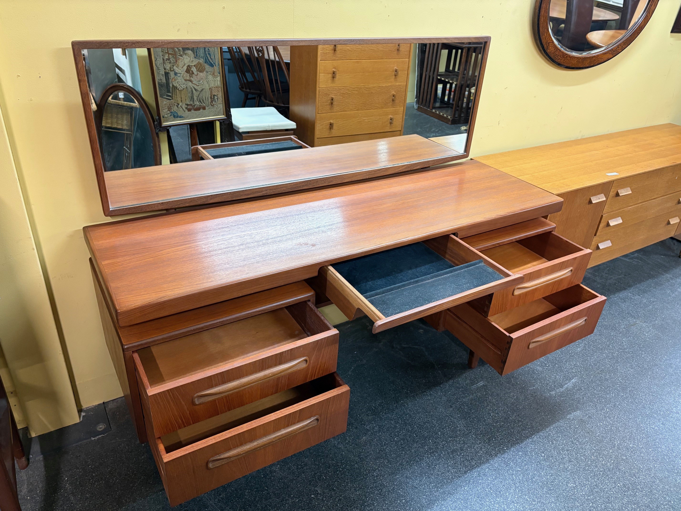 Mid Century teak dressing table and stool from the Fresco range by G Plan. Featuring a floating top with 4 good sized drawers and a concealed central drawer for jewellery. With a teak framed removable mirror. Upholstery on stool will need some attention.
