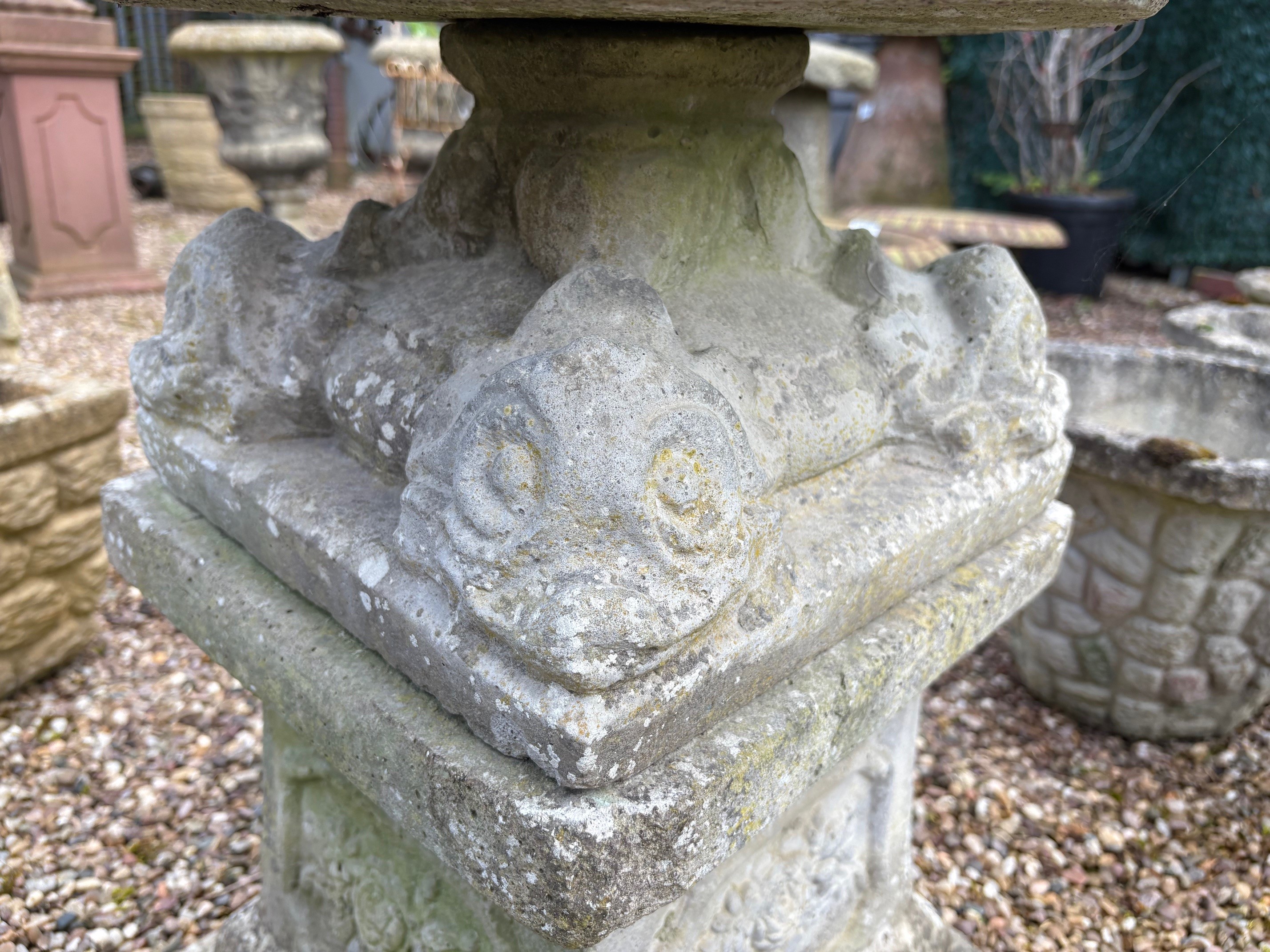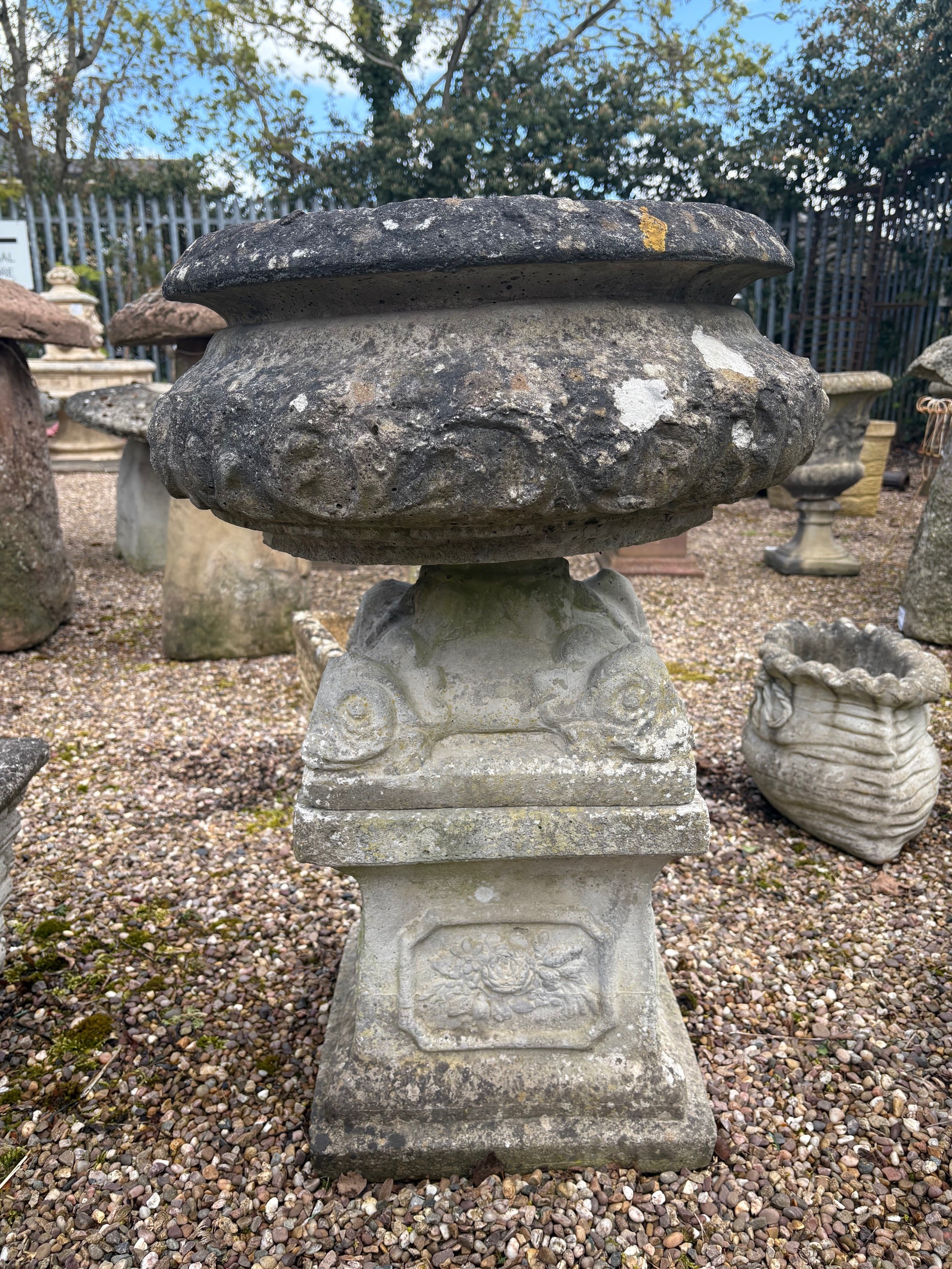 Large Decorative Weathered Urn on a pedestal with four sculpted faces mounted on square plinth with foliage design pedestal - VIN1249C