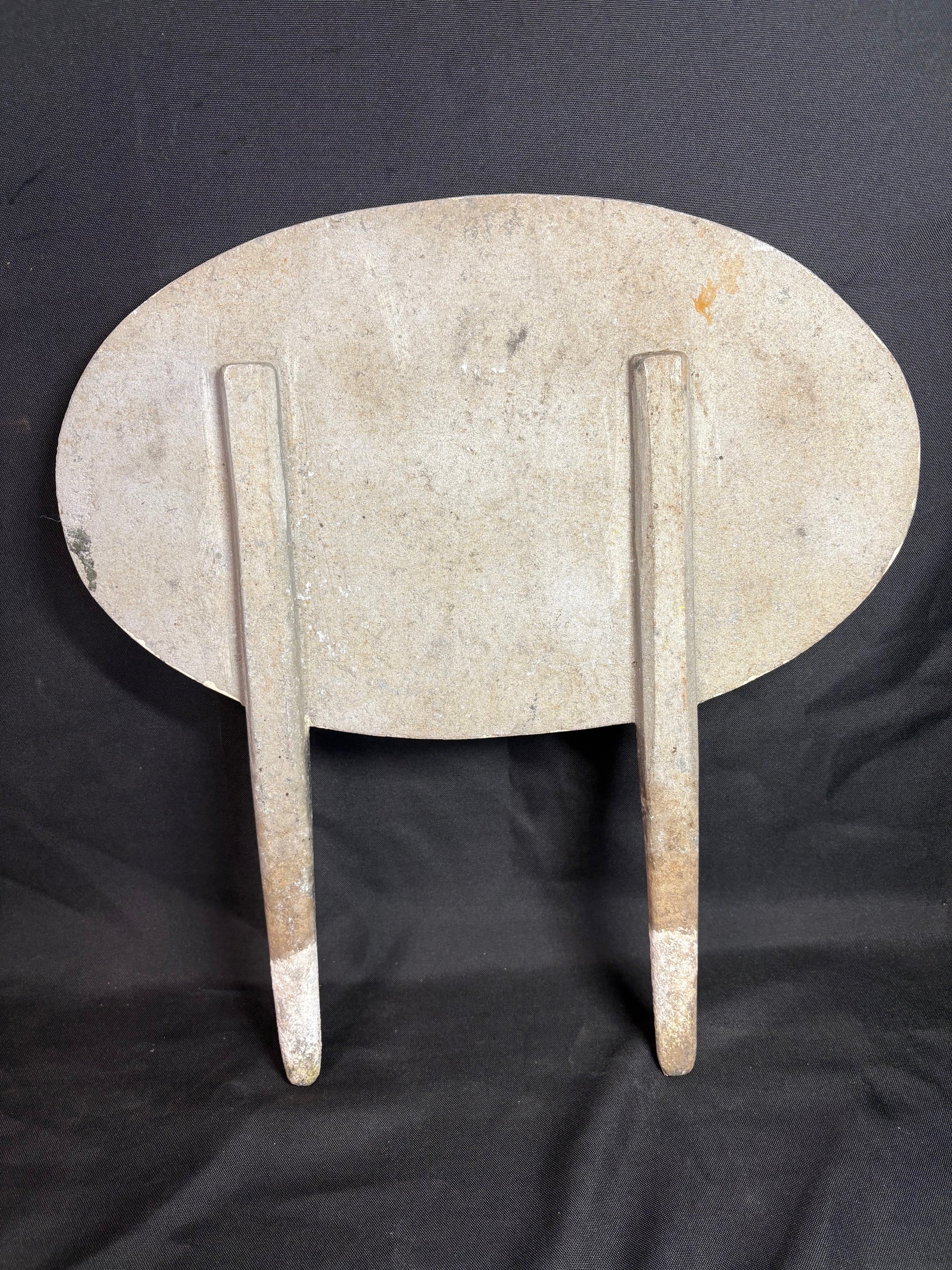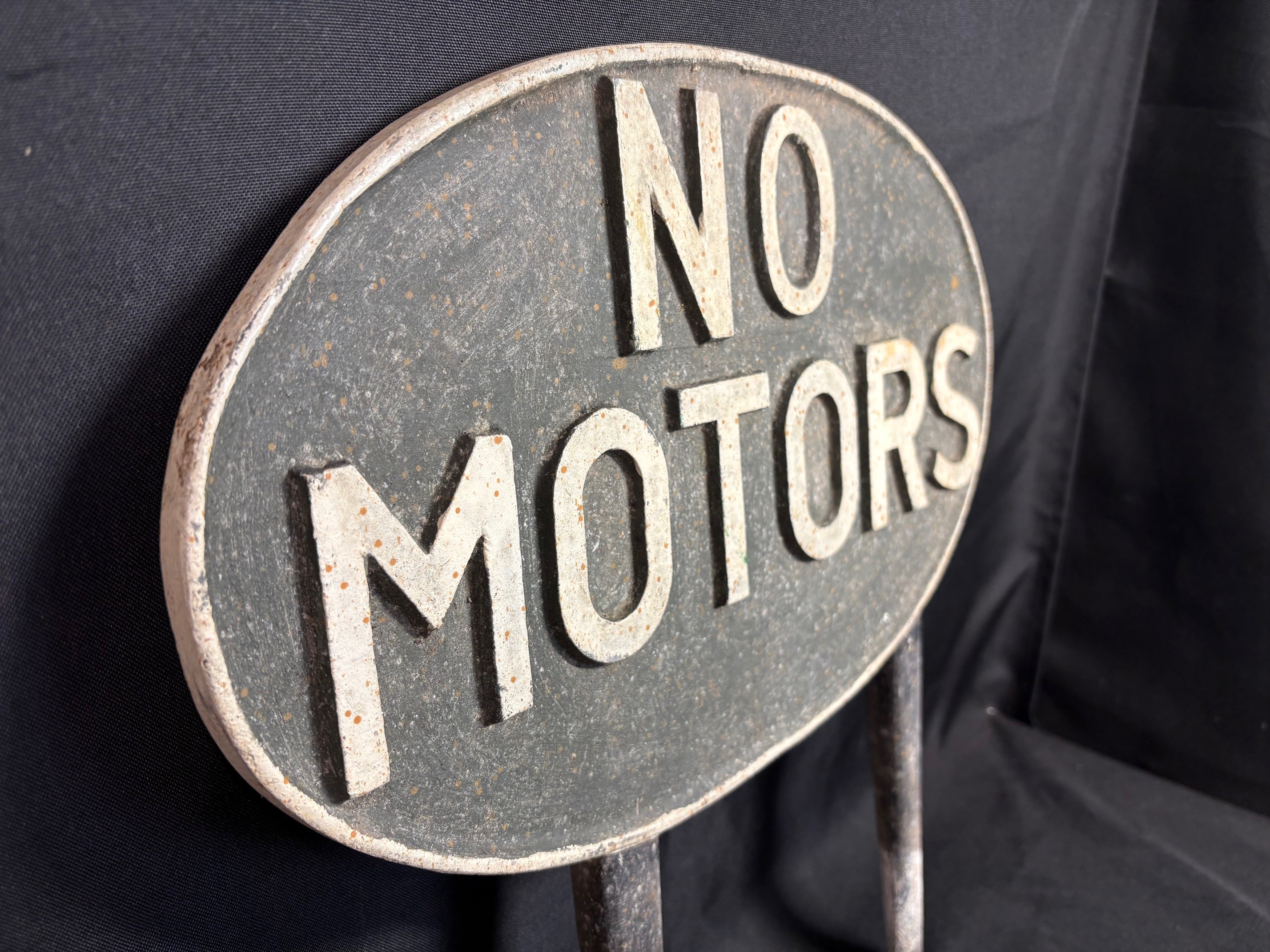 Original vintage metal sign reading “No Motors” in raised lettering with two prongs for securing in a grass area.