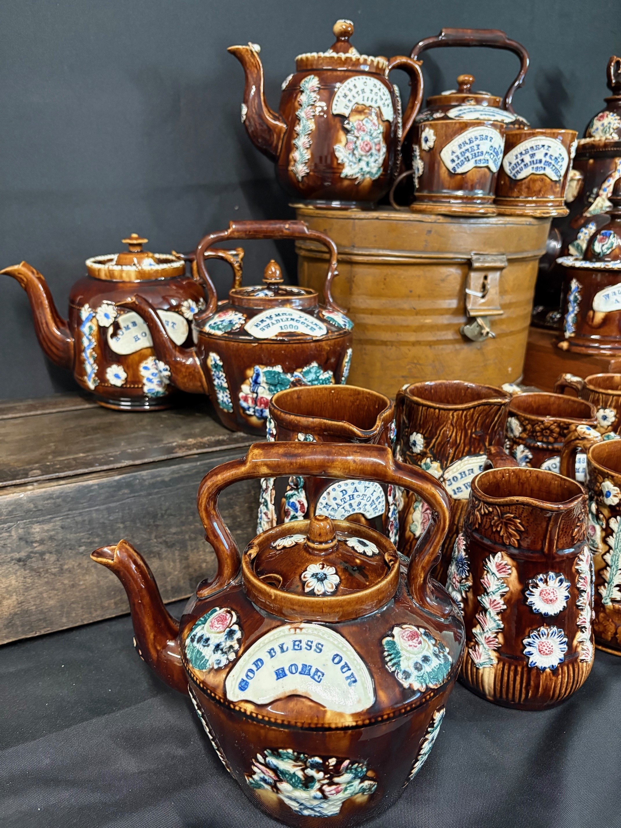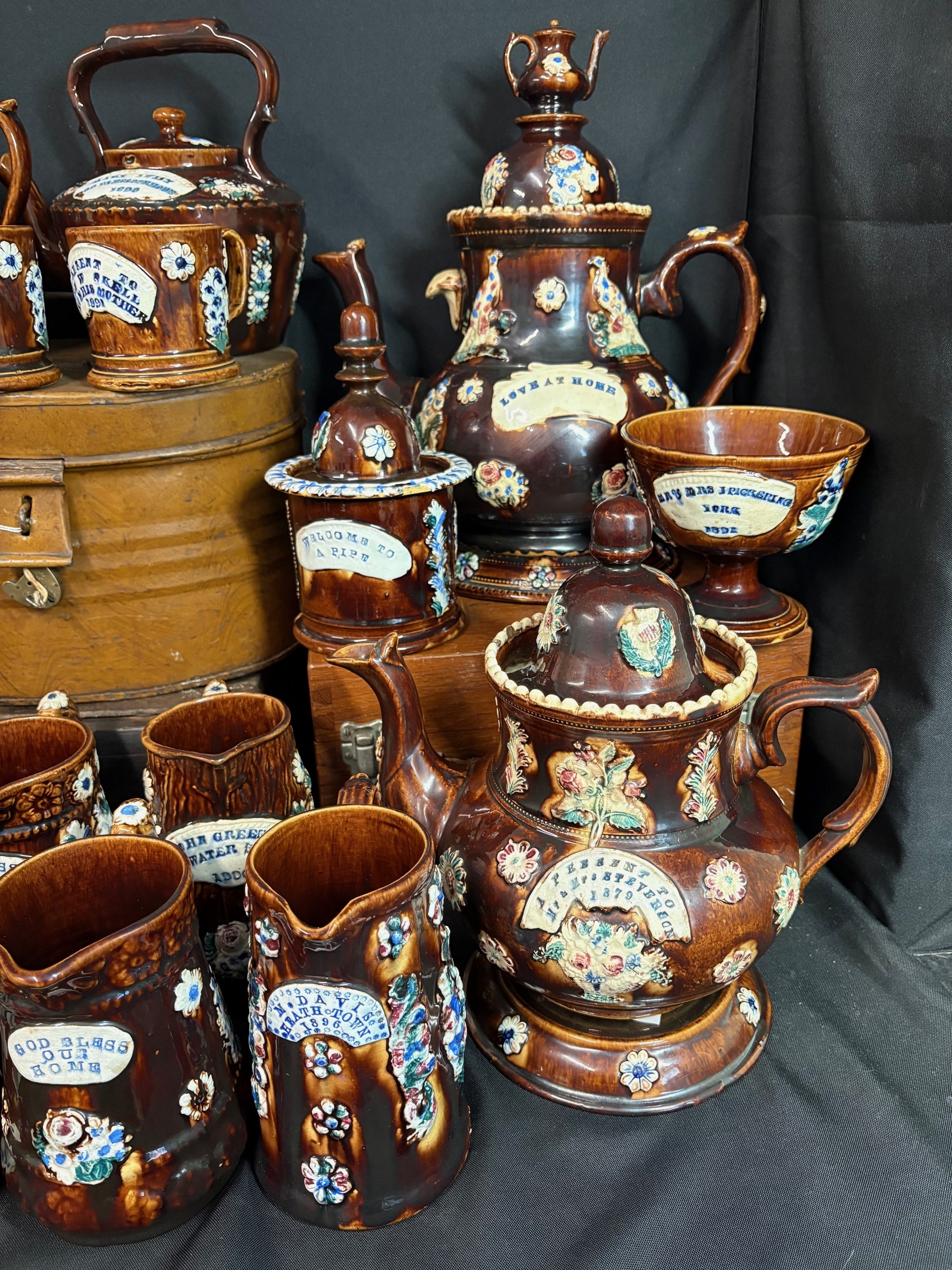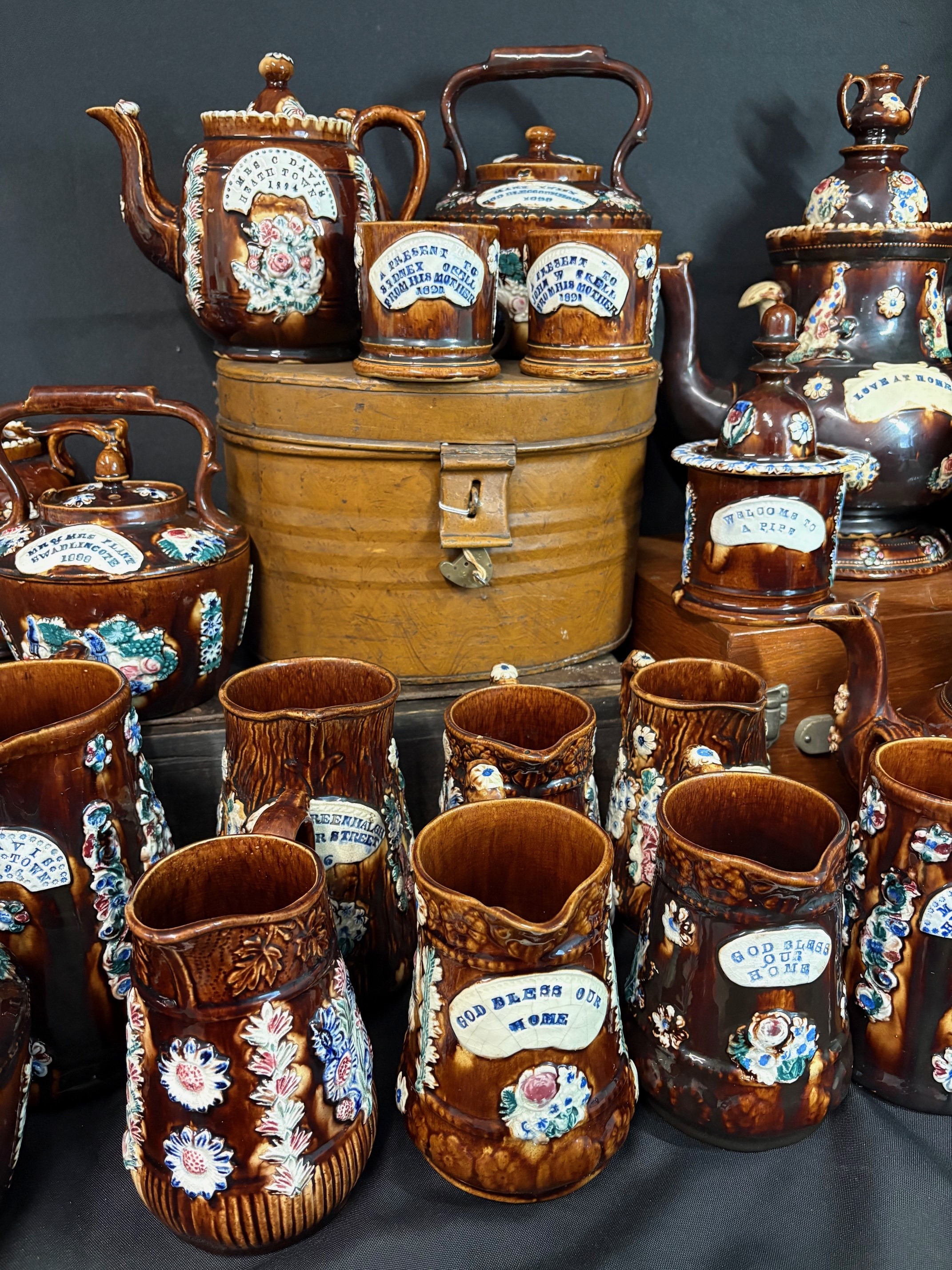 Genuine original 19th century Measham Ware also known as Barge ware. Items could be bought from a little shop at Measham near the canal in the late 1800’s. Popular with barge people from the nearby canal who would buy them as gifts or with the family name or other message. Decorated with flowers and leaves and finished in a thick treacle brown glaze. Produced in the late Victorian period for around 25 years before falling out of popularity