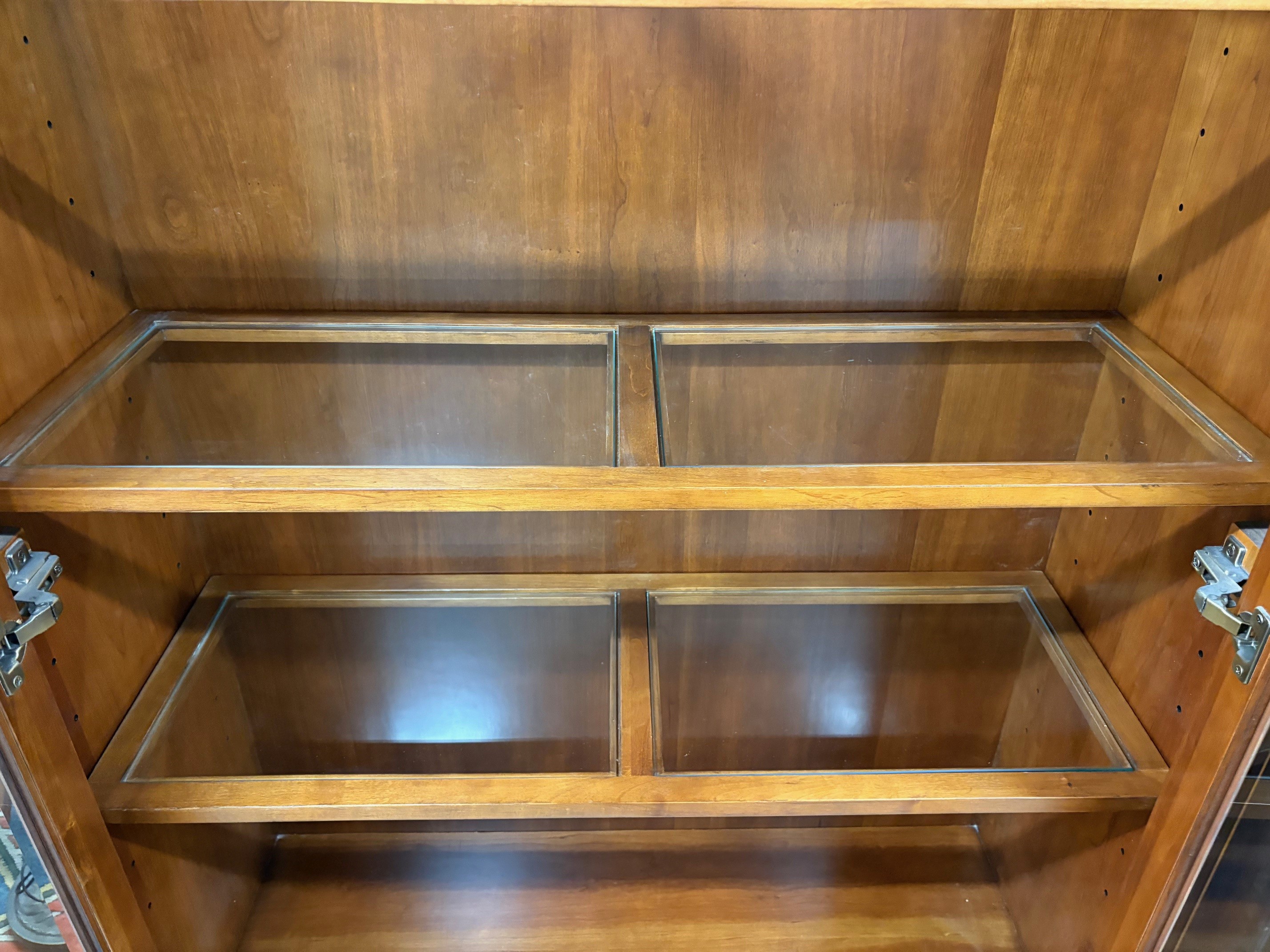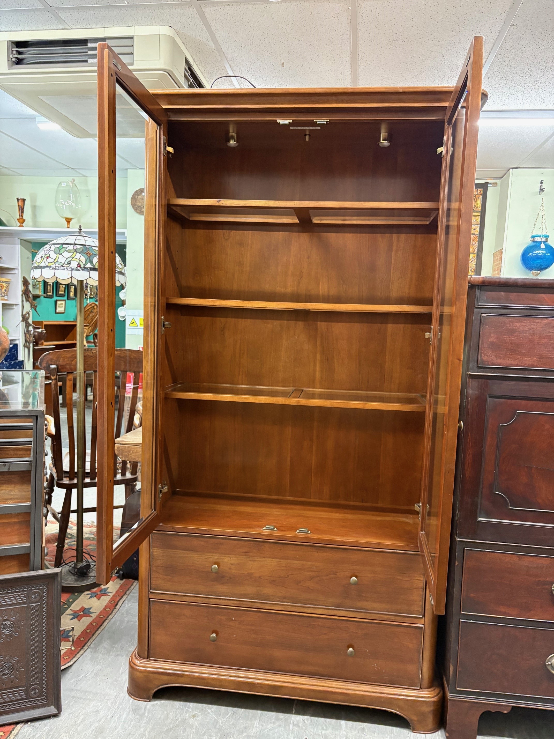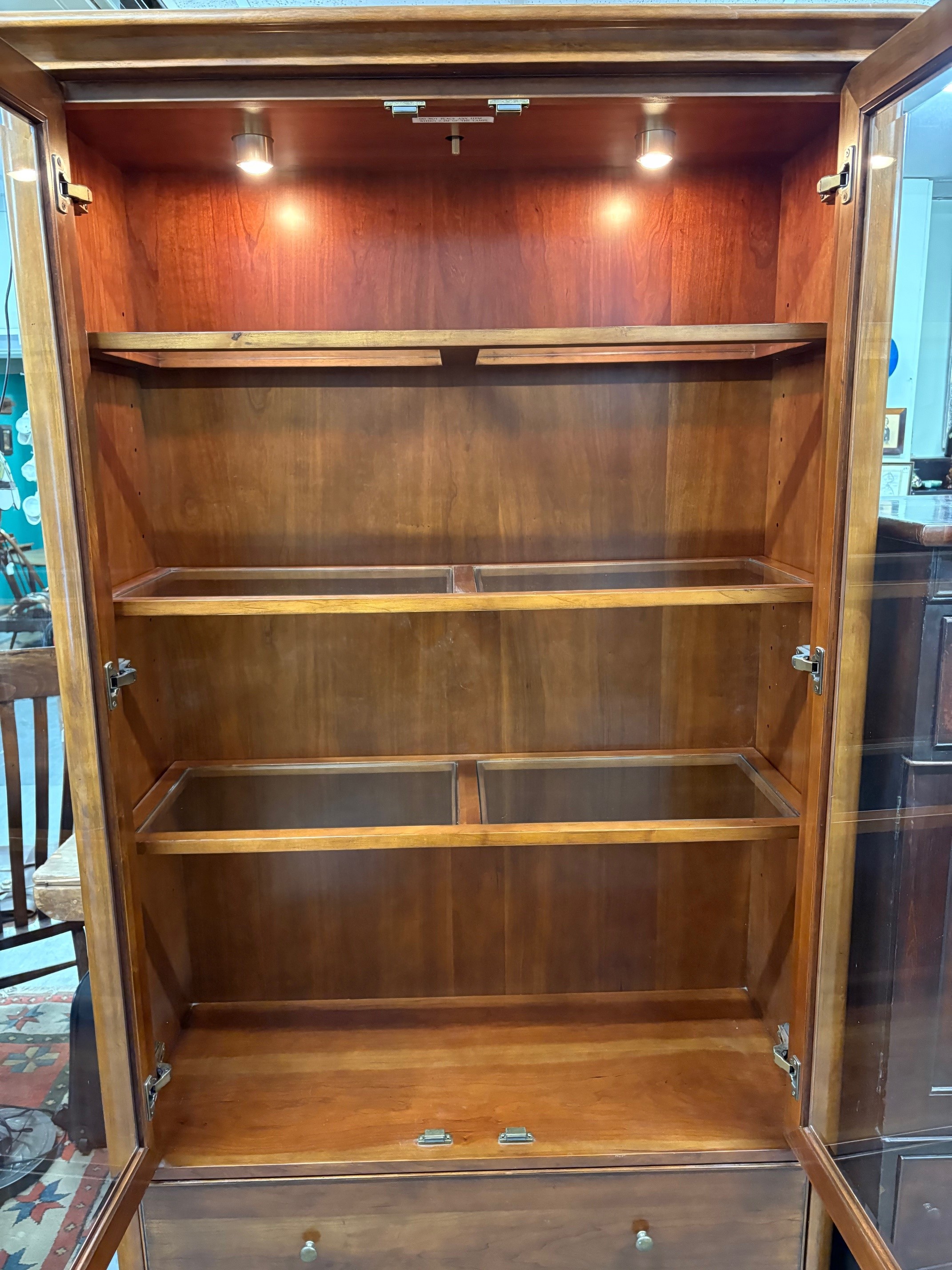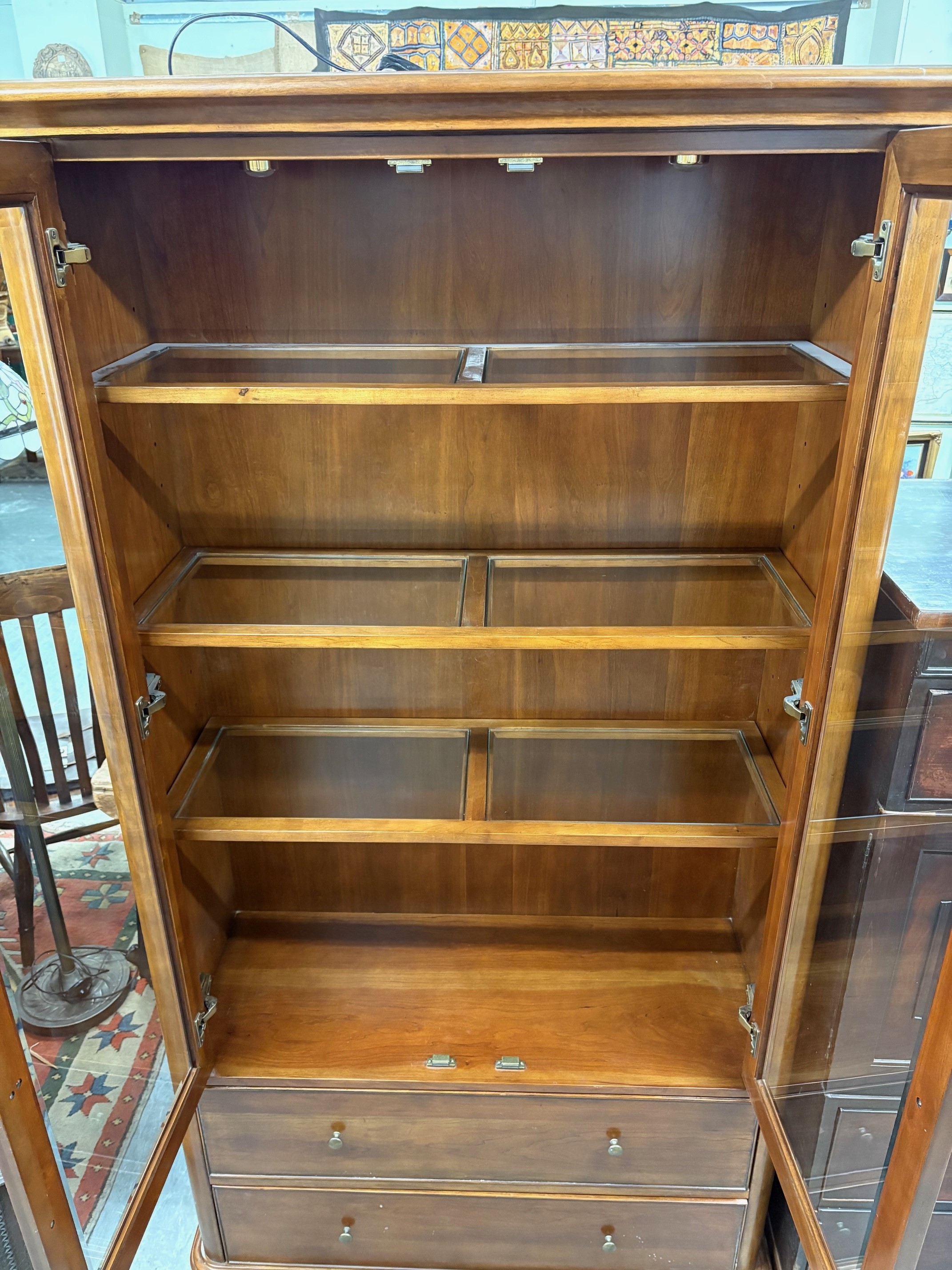 Substantial Willis & Gambier Display cabinet/bookcase with double opening glazed doors. Internal lights with three wood framed shelves with six integrated glass panels within the shelves. Below are two full length drawers.